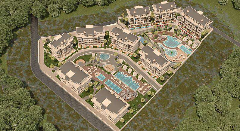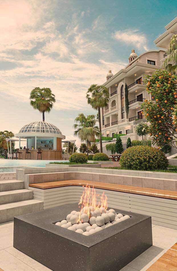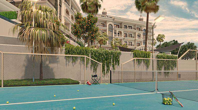 Apartments located amidst nature and within walking distance of the sea have a 15.350 m² land area. The luxury complex is located on a hilltop with a sea view. The complex features a gym, sauna, spa, restaurant, game room, tennis court, kid club, two olympic swimming pools, swimming pool for kids, barbecue, open-air cinema, open-air jacuzzi, extra silent lifts, sunbed and relaxing pool.