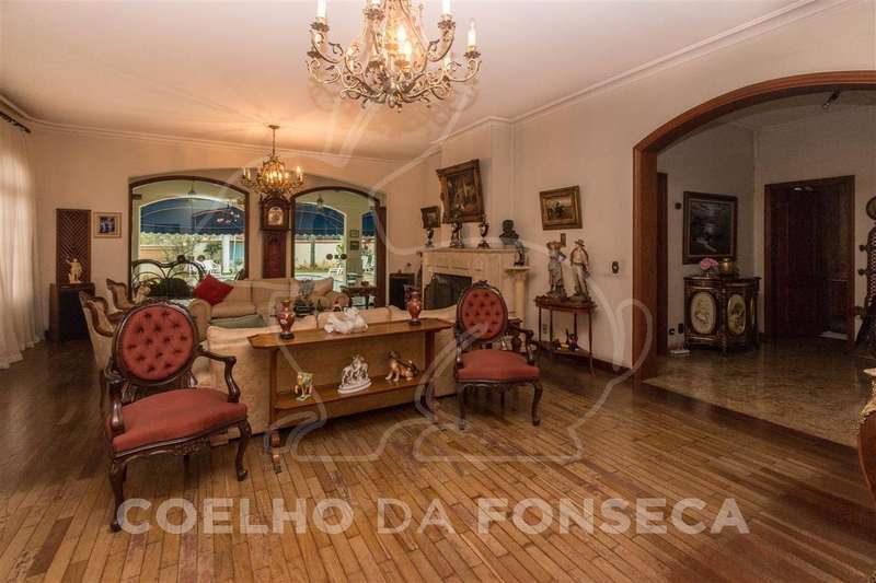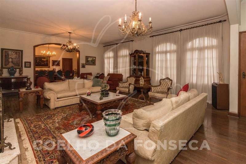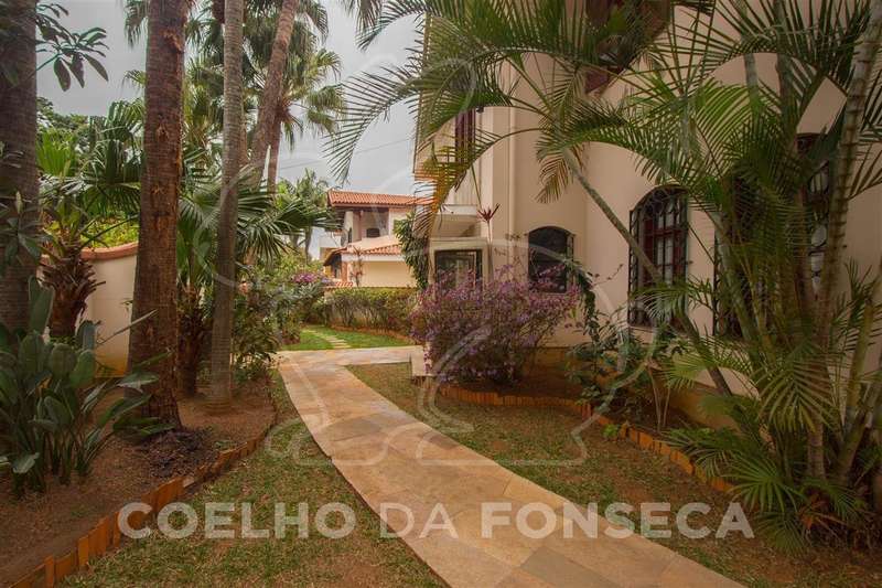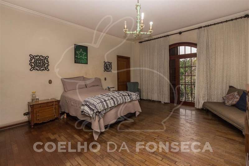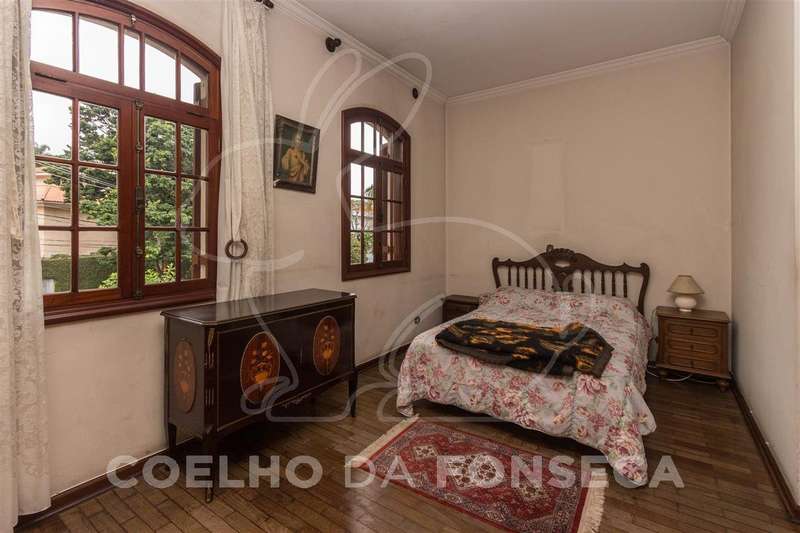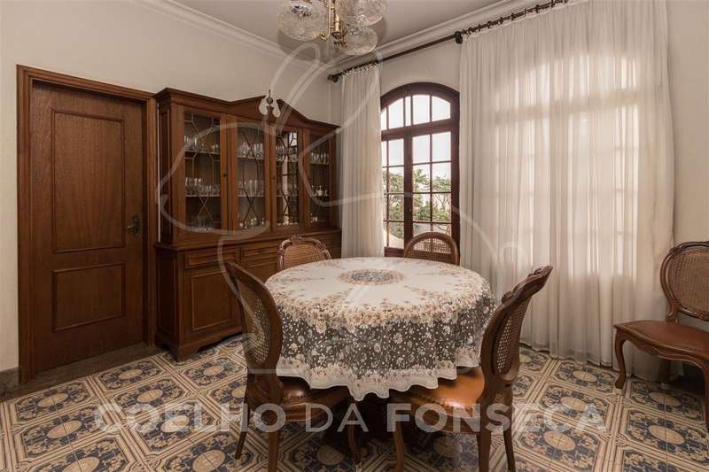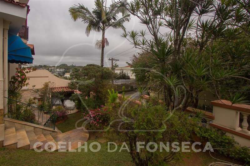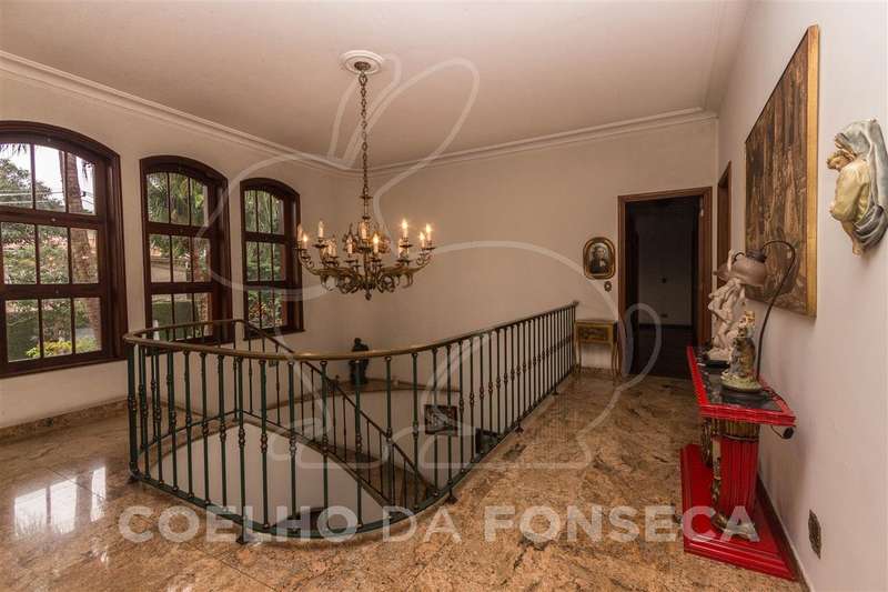 Casa conservada. Localizada na parte mais alta do bairro, proporcionando uma vista ímpar. Possui hall de distribuição para vários ambientes, living voltado para o jardim e piscina. Acabamento em madeira, elevador, sala de almoço e jantar. São cinco suítes amplas, iluminadas e com varanda. Com copa, cozinha, área de serviço com dois dormitórios e sala para motorista. Vagas para oito automóveis.