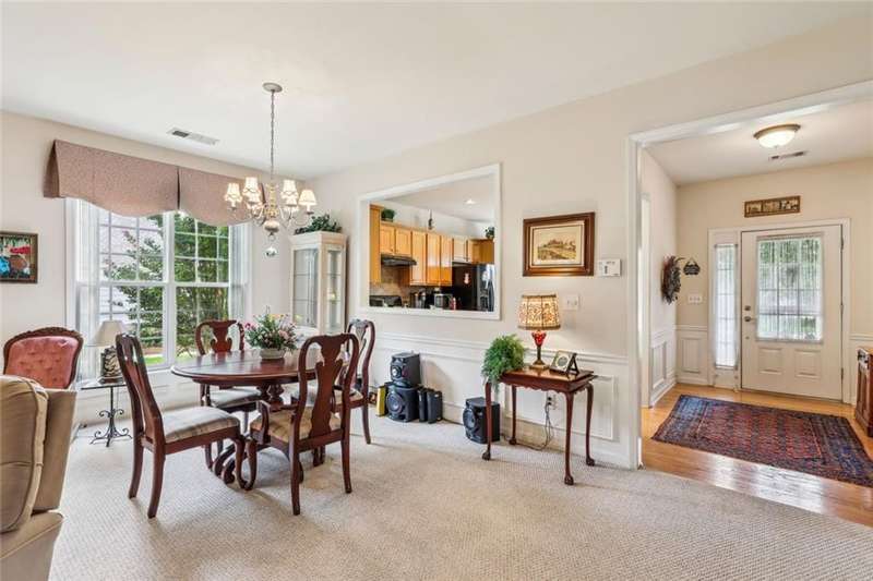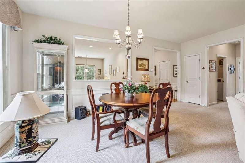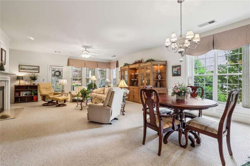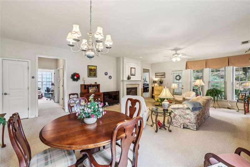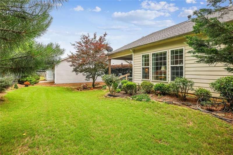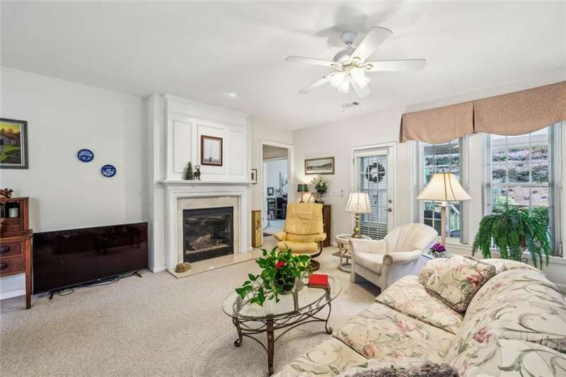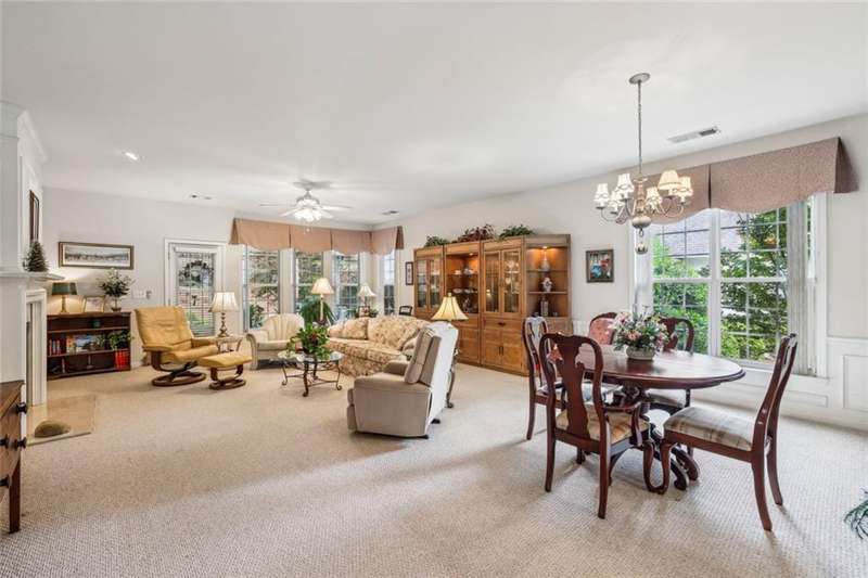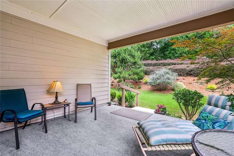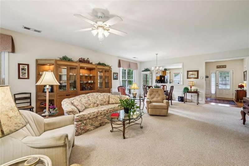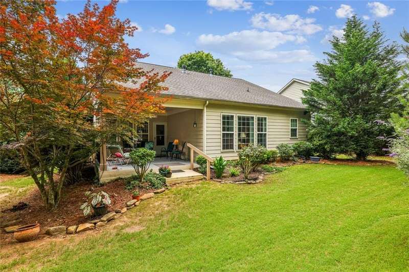 NEW PRICE!!! Move-In-Ready. Master-on-Main. Lawncare included with HOA. Freshly painted interior. Private backyard. Charming Craftsman-Style Ranch in sought-after Kingswood at Castleberry. A cozy and inviting 3-bedroom, 2-bath with open-concept living areas. Just minutes to GA400, The Collection, Northside Hospital, and the Cumming City Center and the new Whole Foods Market. This friendly, amenity-rich neighborhood offers a clubhouse, large pool, pickleball courts, dog parks, sidewalks, and an active social committeeideal for anyone looking to settle into a vibrant, connected lifestyle.You will find excellent curb appeal with lush landscaping and a welcoming covered front porch to set the tone for this homes warmth and charm. Inside, a formal foyer opens into a spacious Great Room with a gas fireplace and combined Living/Dining layoutperfect for entertaining. The Kitchen connects seamlessly to the Great Room and features granite countertops, a large island, warm cabinetry, built-in desk, and a sunny breakfast areaone of the largest kitchen layouts in the subdivision. A ramp with handrail from the garage leads directly into the Kitchen and Foyer, enhancing accessibility. The Master-on-Main Suite includes a wide double door entry, a trey ceiling, large windows overlooking the serene backyard, and a generous walk-in closet. The ensuite bath features dual vanities, a separate tub and shower, and an open water closet. (Note: minor updates could improve bathroom entrance, shower and closet accessibility.) Two additional bedroomsideal for guests, home office, or hobbiesshare a full bath and are tucked away for privacy. Both bedrooms have ample closet space. A full-sized Laundry Room adds convenience. Listing agent has quotes for replacing carpet with LVP or updated carpet. The private backyard has a hill that could be planted in multiple colors of Azalea for a show-stopping view. The large covered patio offers a peaceful retreat and can easily be screened or converted to a 3-season room for additional year-round enjoyment. Outstanding entertainment space.