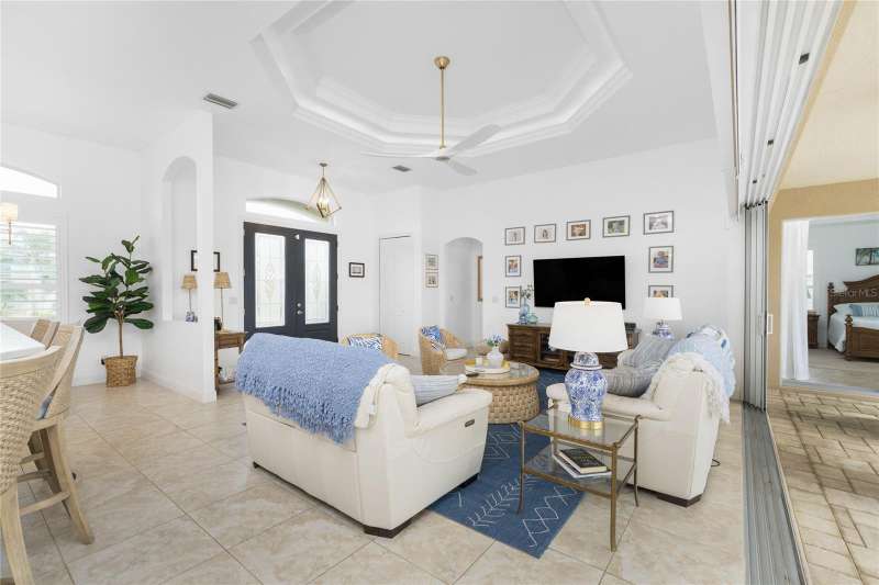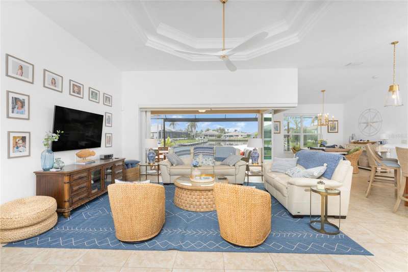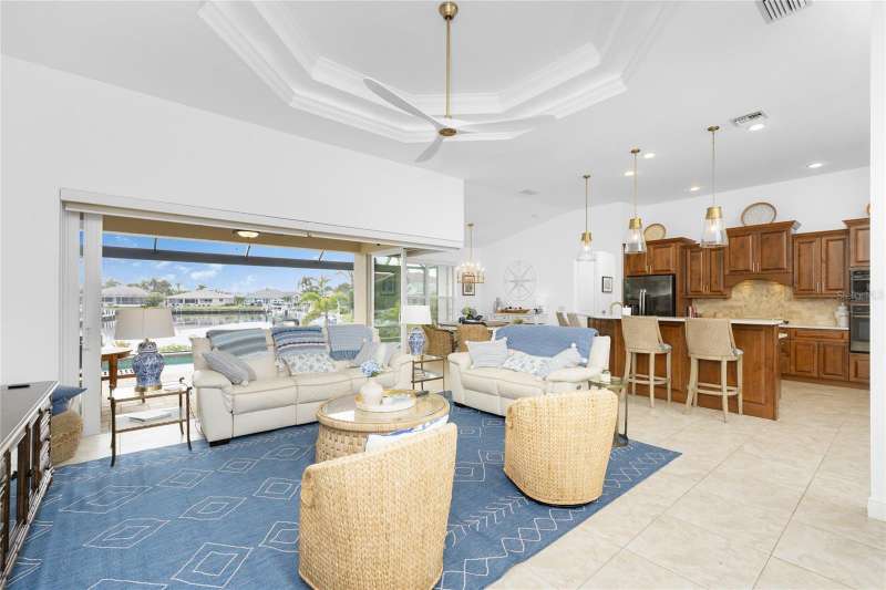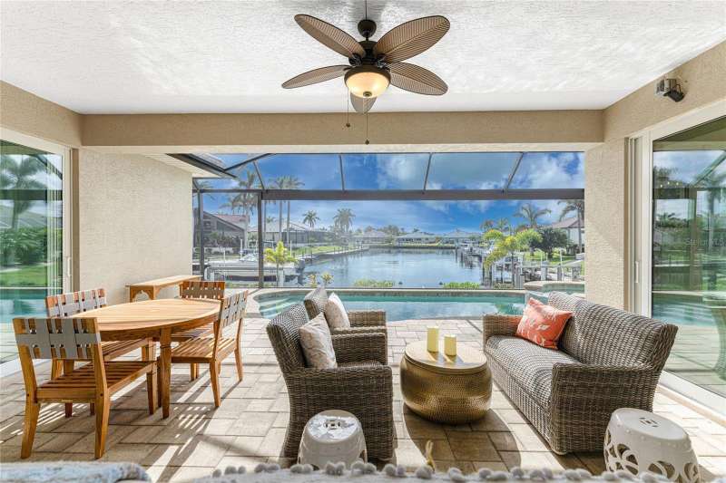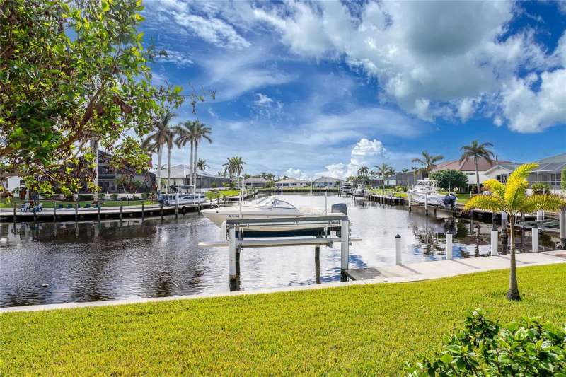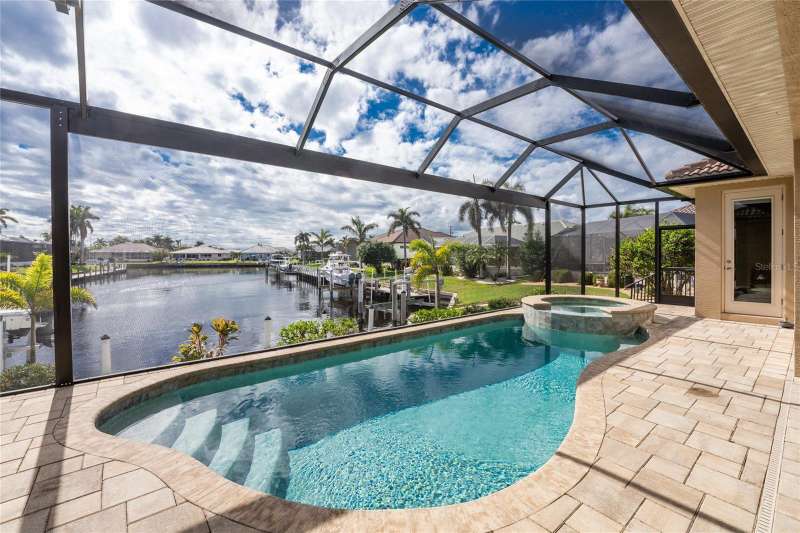 SIGNIFICANT PRICE ADJUSTMENT! You’ll be enchanted by this stunning custom-built luxury home in the heart of Burnt Store Isles, Punta Gorda. Nestled on a meticulously landscaped lot, this masterpiece overlooks an extended intersecting canal view, complete with a 30-foot dock and a 10,000-pound lift, offering direct access to Charlotte Harbor and the Gulf of Mexico. A blend of architectural beauty and modern functionality, this home is an ode to style, sophistication, and waterfront living. From the moment you arrive, the charm of this property is undeniable. The paver driveway, lined with pristine landscaping, leads to a welcoming tiled front entrance. French leaded glass doors, accented by an arched window, set the tone for the grandeur within. Stepping inside, you are greeted by tile floors, soaring ceilings, and a flood of natural light that illuminates every meticulously designed corner. Plantation shutters and fantastic ceiling fans adorn almost every room. The heart of the home, the Great Room, dazzles with its double-tray ceiling, elegant uplighting, and crown molding. Eight-foot, 90-degree sliding glass doors dissolve the boundaries between indoor and outdoor spaces, seamlessly opening to the screened lanai. Whether you're hosting a lively gathering or savoring a quiet evening, the fluid transition amplifies the beauty of Florida living. For culinary enthusiasts, the kitchen is a dream come true. Solid wood cabinet fronts, striking stone countertops with designer pendant lighting above and GE Profile graphite stainless steel appliances are complemented by a large single sink and a convection microwave. A 300-gallon propane tank fuels the gas cooktop, ensuring effortless gourmet meal preparation. The Primary suite is a sanctuary, offering a spacious 9x8 walk-in closet, a cozy sitting area, and a luxurious ensuite bath. Tray ceilings with crown molding elevate the space, while a deep soaking tub, a walk-in frameless glass shower, and a double sink vanity with decorative stone trim provide the ultimate in relaxation. The two spacious guest bedrooms share a beautiful bathroom with a door to the lanai to act as a pool bath. Step outside to find your private paradise. The propane heated, remote controlled saltwater pool and spa, sparkles against the backdrop of the serene canal. The lanai, with the clear view pool cage, enhances the breathtaking water views. Pavers grace the pool deck, which features a generous covered sitting area perfect for alfresco dining. This home features impact rated doors and windows, 8 foot interior doors with wide casings and tall baseboards, a central vacuum system and electric roll down sun shades. Located at the very end of Tripoli Boulevard on a quiet cul-de-sac and conveniently located just minutes from downtown Punta Gorda's fine dining and vibrant culture. Shopping and daily essentials are a breeze with Publix and Home Depot just 2 miles away. This is the home that you’ve been looking for.