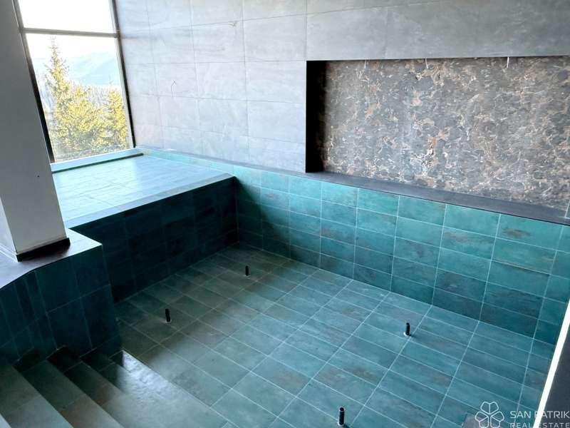 * Wellness & spa center (basement) - indoor pool, jacuzzi, sauna, bar, shower, and WC, featuring an impressive wall mosaic made from stone with marine fossils