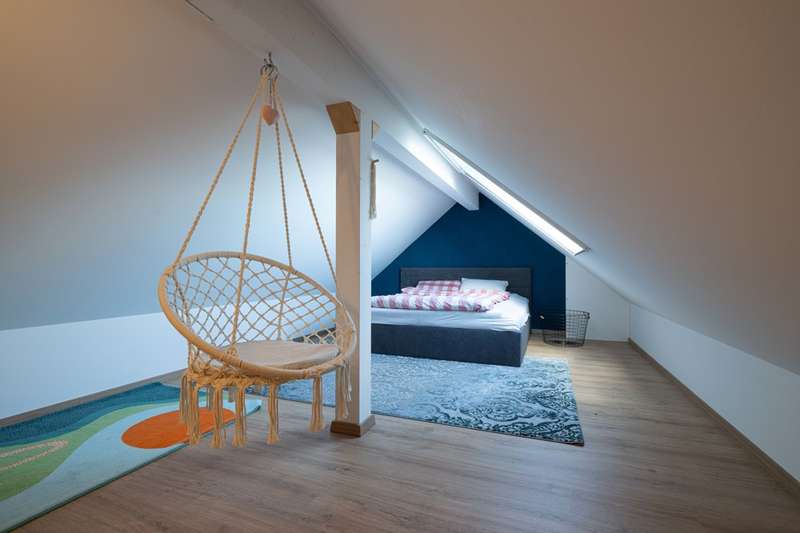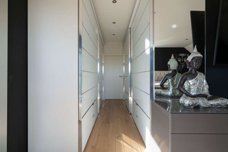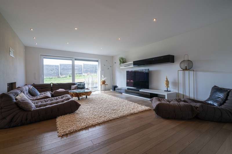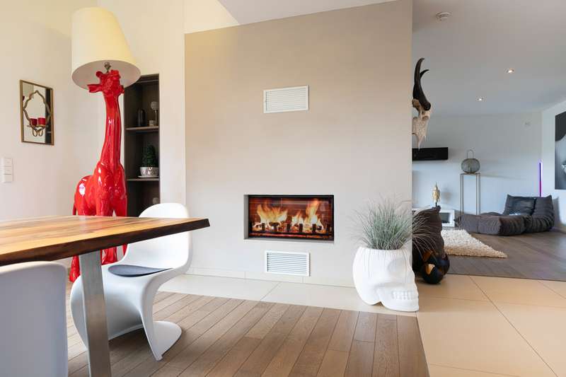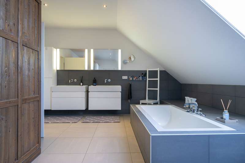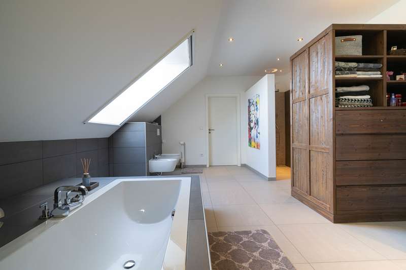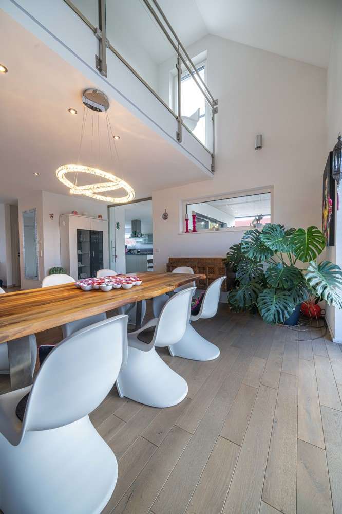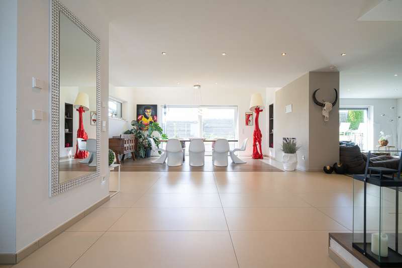 This attractive architect-designed house was built in 2012 according to the owner's personal wishes. Particular emphasis was placed on high living comfort, design and the best construction quality. The result is a modern, well thought-out home with a spacious floor plan and high-quality, elegant furnishings. Large glass windows and doors, natural stone floors and real wood parquet dominate the materials used. Overall, this property offers an ideal home for a family that appreciates luxury and modern amenities. In the impressive living and dining area, you can expect airy ceiling heights and bright natural stone; the floor-to-ceiling windows ensure that the rooms are flooded with light. One highlight (of many) is the visually and functionally high-quality designer panoramic fireplace and the homely fitted kitchen as part of the overall concept of extravagant furnishings. A large sliding glass door separates the kitchen from the dining/living area. The panoramic fireplace separates the dining area from the living room and is fitted with glass on both sides. The elegant fitted kitchen from Leicht with its many technical refinements and a modern cooking island leaves nothing to be desired with its high-quality Siemens, Miele and Whirlpool appliances: Induction hob, Silence dishwasher, modern oven and an American fridge with ice cube maker. From the kitchen, a floor-to-ceiling sliding glass door leads to the stylish covered terrace with fantastic views of the natural surroundings, allowing you to relax after work. The terrace is laid out around half the house, guaranteeing an uninterrupted view of the city. The landscaped lawn surrounds a large part of the house and is fenced off with wooden privacy screens and plants. Adjacent to the living area on the first floor, you will find a guest bedroom and an en suite bathroom with equally impressive modern fittings. The numerous spotlights and the LED strip in the open-plan area make the first floor ceiling shine brightly. A checkroom and a guest WC with urinal complete the offer on the first floor. A spacious open gallery is centrally located on the top floor. From here, you can access the bright bedroom with a practical dressing area and a master bathroom en suite with luxurious fittings. You will find a large walk-in shower, a spacious deep-soaking bath, WC, bidet and two washbasins. From the sleeping area and the gallery, you have access to the wonderfully large balcony and can enjoy the view of the natural surroundings from here. Two further well-designed, bright and spacious rooms complete the sleeping area on this floor. An open staircase leads to the attic, which has been converted into a studio. Only limited by sloping ceilings, you have another living area here, e.g. as a play area for children, a guest area or for your home office. In the converted basement you will find the boiler/technical room, a heated anteroom with built-in cupboards, a fitness room with wellness area (sauna and shower), a separate laundry room and a fully equipped home cinema. An additional storage room and a further guest WC complete this area. You have direct access to the garage from the entrance hall and the utility room. Here you have enough space for 4 large cars and other various vehicles and objects. A car enthusiast will really appreciate this garage with access in the house. The garage floor has been coated with a self-leveling reaction resin mortar and additionally sealed. An electric double garage door is a matter of course here. In front of the garages, you have numerous other parking options for your guests in the spacious courtyard. The entire house (including the basement) is heated by underfloor heating using a heat pump. The Creaton roof panels in black matt, including a fully integrated photovoltaic system, give the house a modern look, support the energy supply in the house and ensure low heating costs. The exterior railings are made of stainless steel and the terrace boards are fitted with an aluminum substructure. Electric roller shutters provide comfort and security. The house has a total of 6 rooms, including 4 bedrooms and a studio. There are also 2 guest WCs and 2 bathrooms, a sauna with wellness shower, fitness room and home cinema. This architect's house is situated on a slope and is a rare highlight. Let us convince you of its noble overall concept during a personal viewing. Please understand that we only allow viewings on presentation of a financing confirmation. VON POLL FINANCE can assist you with this. Our colleagues will be happy to provide you with a mortgage certificate free of charge and without obligation.