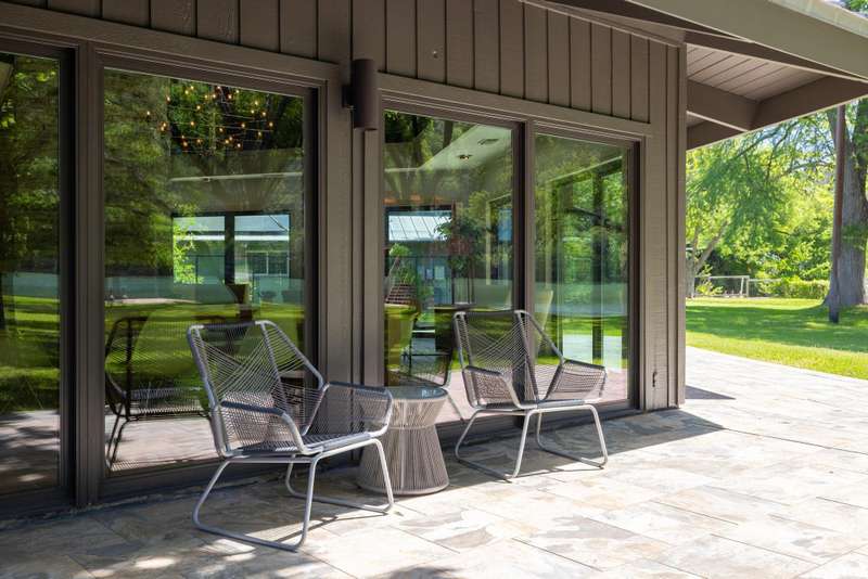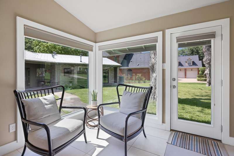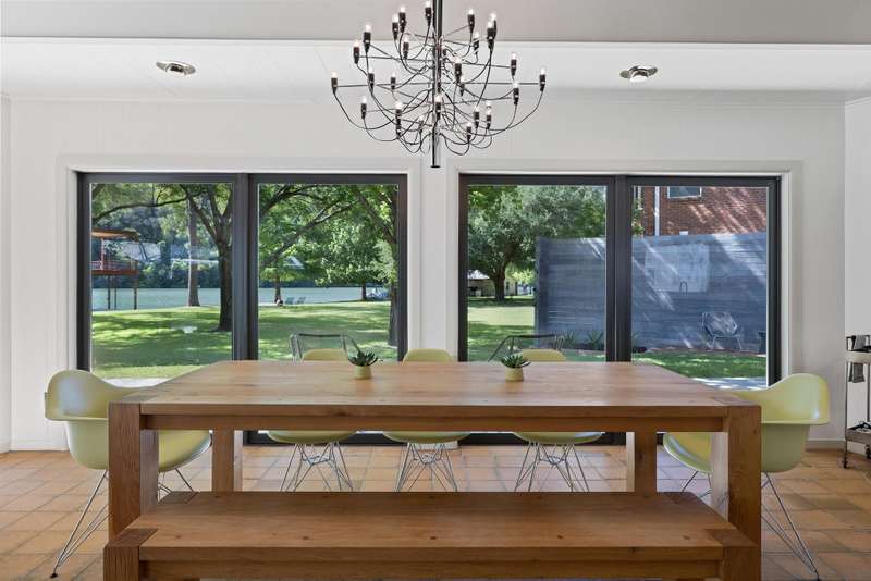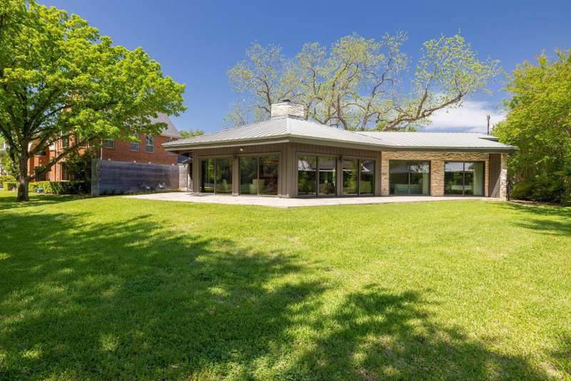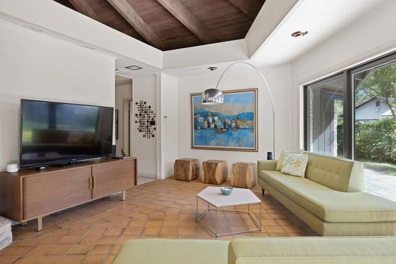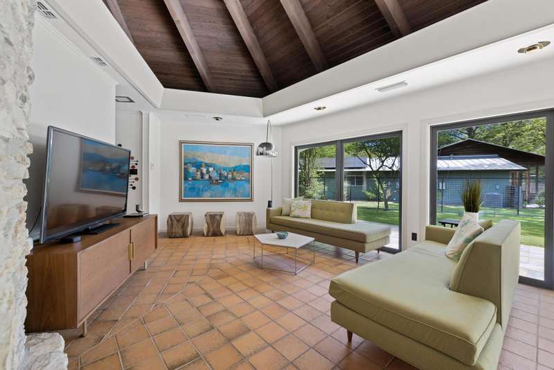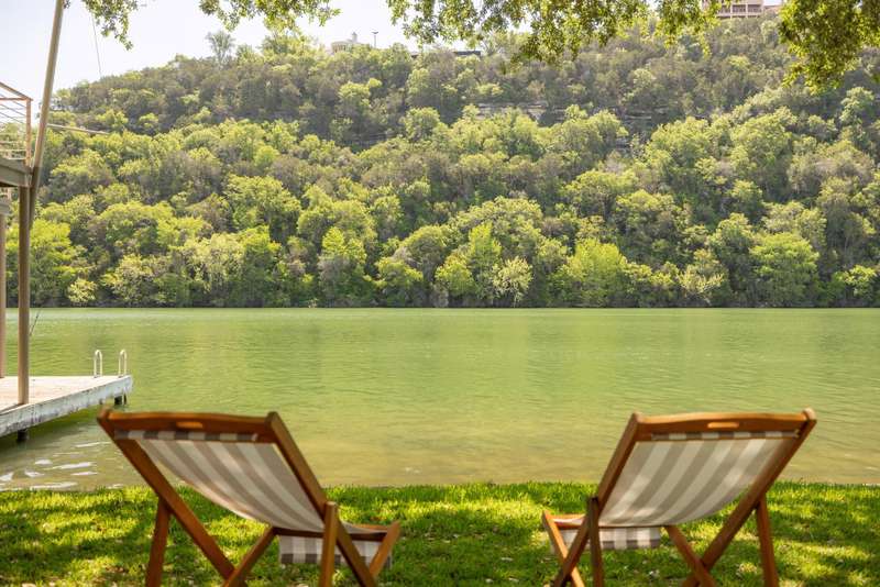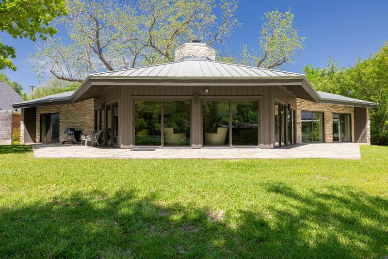 Set on one of the most iconic stretches of Lake Austin, 2401 Manana St. is a rare midcentury retreat that effortlessly balances architectural pedigree with laid-back Lake Austin living. Inspired by Frank Lloyd Wright's organic aesthetic, the rotunda-style home features dramatic yet welcoming vaulted ceilings, warm teak cabinetry in the updated kitchen, and sliding glass doors throughout the entire living and dining space that opens to the expansive, flat lawn. Shaded by a canopy of mature oak trees and two producing heritage pecan trees, the lawn leads you gently toward +/- 100' of private waterfront, where iconic oak trees frame the view. The calm waters here are ideal for water skiing, wakeboarding, and wake surfing--one of the best stretches on the lake for smooth conditions. The main house includes three bedrooms and two full bathrooms, while a detached two-car garage and guest suite offers its own living space, bedroom, and bathroom. On the water, a rare, grandfathered boathouse includes a full bathroom and lounge outfitted with a kitchenette, and the recently updated two-story boat dock features ipe decking, a hydraulic boat lift, touchless boat cover, shaded lounging and sunbathing areas, and even a jump gate into the lake. The property also boasts a full-yard sprinkler system and an updated water purification system. Located on a coveted neighborhood street, this home is within walking distance of Ski Shores Café (but just far enough to avoid the crowds), close to the natural beauty of Emma Long Park and all its recreational offerings, and benefits from a private neighborhood fireworks show on the Fourth of July. Tax and assessed values are estimates for illustration purposes only. All figures should be independently verified.