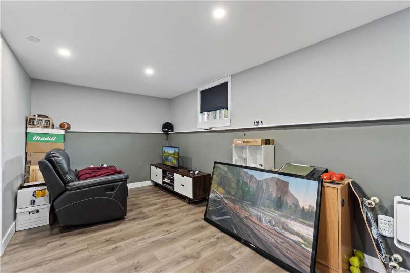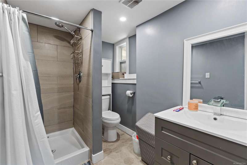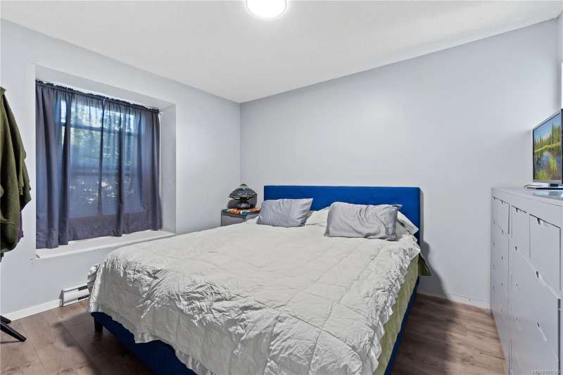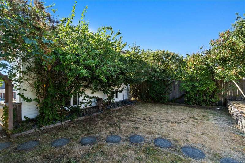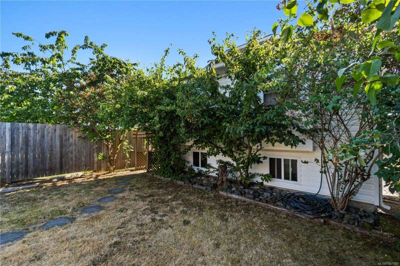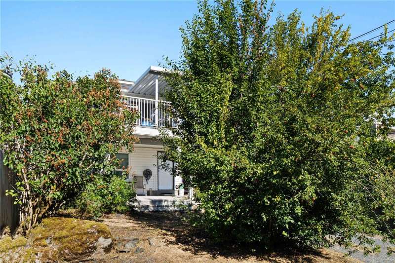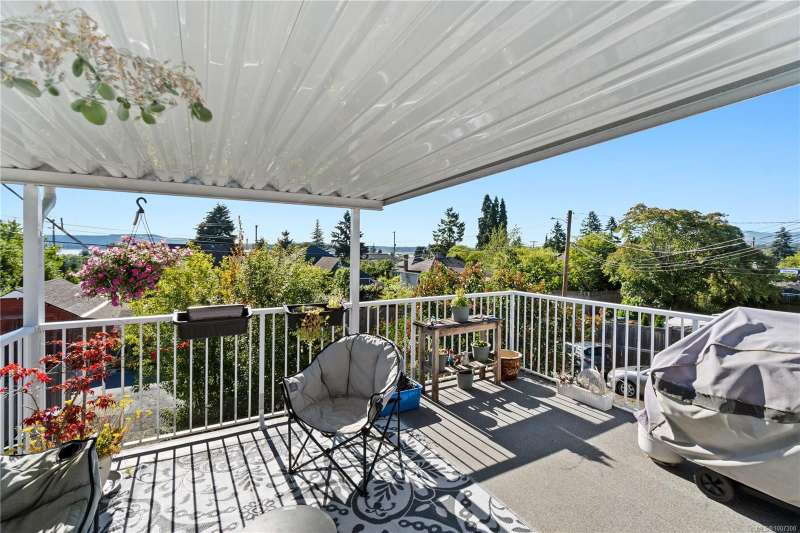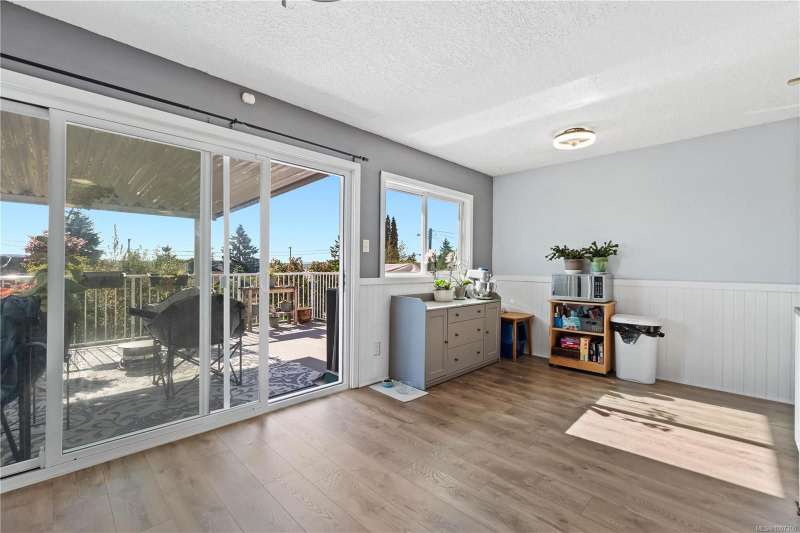 Well maintained home with a highly flexible floorplan: FIVE possible bedrooms, or 4-beds plus den, or 3-beds plus den and an extra rec room. Perfect for a growing family on a quiet no-through road, close to the bus route, a 3min walk to elementary school, a 20min walk to shopping, and a 34min walk to VIU. Across the street are three lots slated for development as a park! Enjoy ocean views all year from the 16'x14' covered balcony off the main living area. Park your RV in the alley-access, fully-fenced yard - there's also buried wiring for a future hot tub or a shop. Inside, feel the comfort of the newer heat pump and enjoy updated finishings like modern lino flooring, new paint, tile shower, new vanities, wainscoting and tile backsplash. The roof is only 10-12 years old. The yard makes efficient use of space and has a lot of potential with mature lilacs, fruit trees, wysteria and hydrangeas. This home is move-in ready and has a great vibe that you should see in person!
