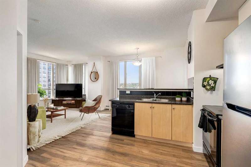 Perched on the 16th floor this spacious 2 bed, 2 bath almost 800 sq ft corner unit condo is filled with natural light thanks to its large windows and south and western exposures. One you’re the new owner you will love soaking in the gorgeous rocky mountain views by day and the glowing downtown skyline by night. From breathtaking sunsets to twinkling city lights, the views here will never get old. The open-concept layout makes everyday living a breeze. The living room is bright and inviting and flows into a functional kitchen with a breakfast bar. Step outside onto the generously sized covered balcony where you can enjoy morning coffee, dine al fresco (it’s a great place to BBQ), unwind in the fresh air and catch a stunning sunset. You’ll find two great sized bedrooms, including a primary retreat with its own private three-piece ensuite and a second bedroom with easy access to another full four-piece bathroom, ideal for guests, family or a roommate. Stylish vinyl plank flooring runs throughout the unit and in suite laundry means laundry day becomes effortless (almost!). Your condo fees take care of the essentials: electricity, heat, and water/sewer, all rolled in. The excellently located building offers peace of mind and is the epitome of a ‘lock it and leave it’ lifestyle with 24-hour concierge/security services onsite. You’ll also enjoy access to a fully equipped fitness center, bike storage and your own secure, titled underground parking stall so you can say goodbye to scraping your windshield in freezing temperatures. When it comes to location, it doesn’t get much better: the grocery store is literally steps away, and you’re surrounded by some of the city’s best restaurants, coffee shops, pubs, boutiques and nightlife meaning you will always have something to do. Commuting is easy with the c-train and major roadways just minutes away. Add in the nearby River pathways for biking or walking, plus the vibrant energies from trendy neighbouring downtown districts like Kensington, and you’ve got the recipe for a truly magical inner-city lifestyle.