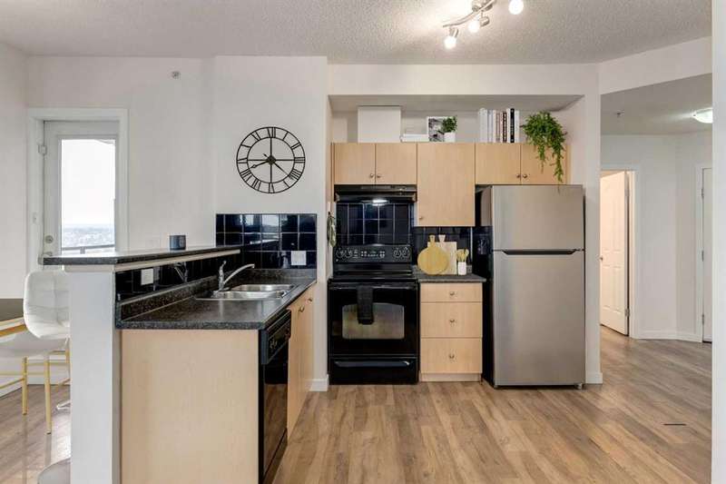 Perched on the 16th floor this spacious 2 bed, 2 bath almost 800 sq ft corner unit condo is filled with natural light thanks to its large windows and south and western exposures. One you’re the new owner you will love soaking in the gorgeous rocky mountain views by day and the glowing downtown skyline by night. From breathtaking sunsets to twinkling city lights, the views here will never get old. The open-concept layout makes everyday living a breeze. The living room is bright and inviting and flows into a functional kitchen with a breakfast bar. Step outside onto the generously sized covered balcony where you can enjoy morning coffee, dine al fresco (it’s a great place to BBQ), unwind in the fresh air and catch a stunning sunset. You’ll find two great sized bedrooms, including a primary retreat with its own private three-piece ensuite and a second bedroom with easy access to another full four-piece bathroom, ideal for guests, family or a roommate. Stylish vinyl plank flooring runs throughout the unit and in suite laundry means laundry day becomes effortless (almost!). Your condo fees take care of the essentials: electricity, heat, and water/sewer, all rolled in. The excellently located building offers peace of mind and is the epitome of a ‘lock it and leave it’ lifestyle with 24-hour concierge/security services onsite. You’ll also enjoy access to a fully equipped fitness center, bike storage and your own secure, titled underground parking stall so you can say goodbye to scraping your windshield in freezing temperatures. When it comes to location, it doesn’t get much better: the grocery store is literally steps away, and you’re surrounded by some of the city’s best restaurants, coffee shops, pubs, boutiques and nightlife meaning you will always have something to do. Commuting is easy with the c-train and major roadways just minutes away. Add in the nearby River pathways for biking or walking, plus the vibrant energies from trendy neighbouring downtown districts like Kensington, and you’ve got the recipe for a truly magical inner-city lifestyle.