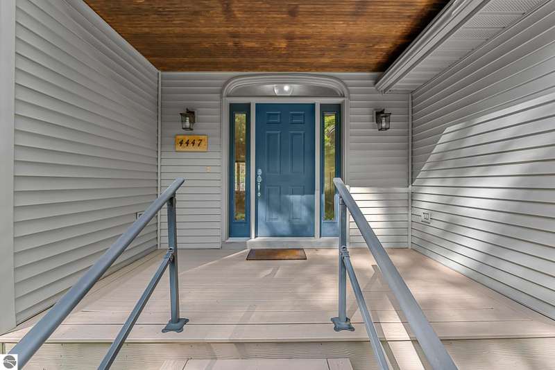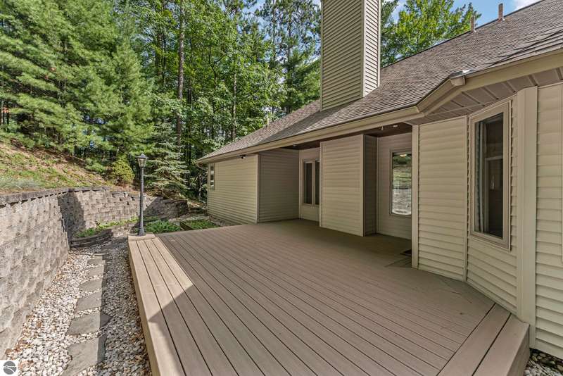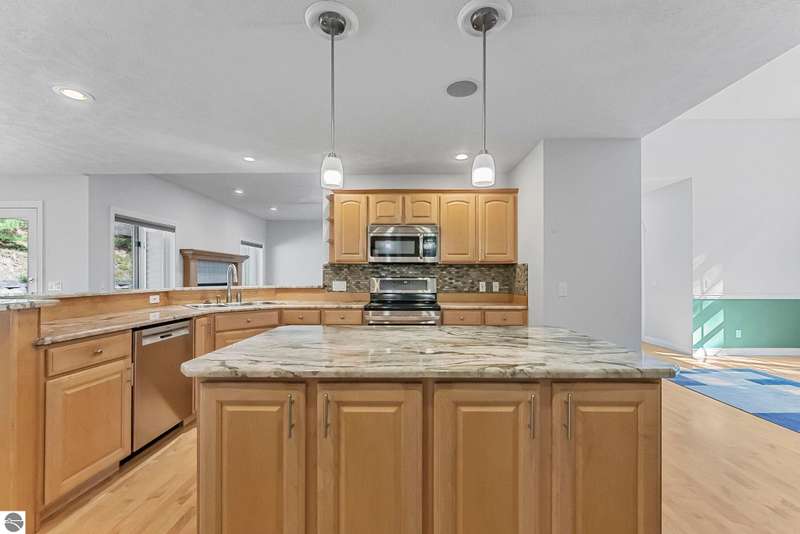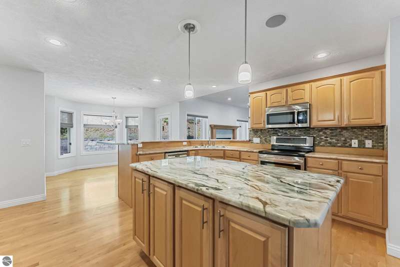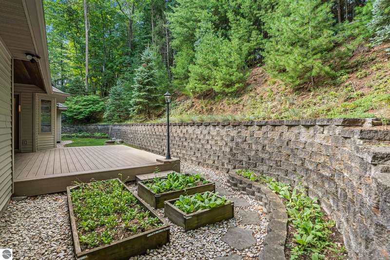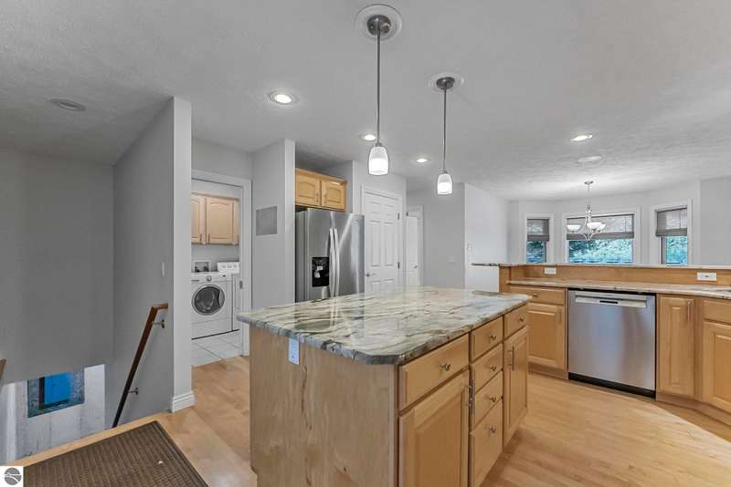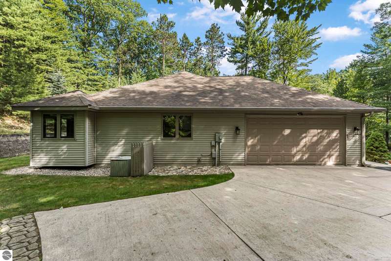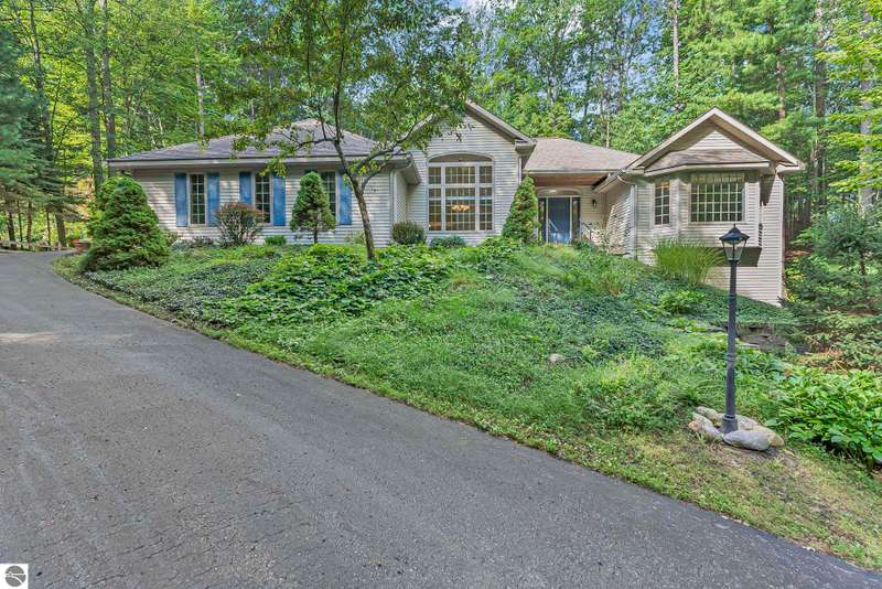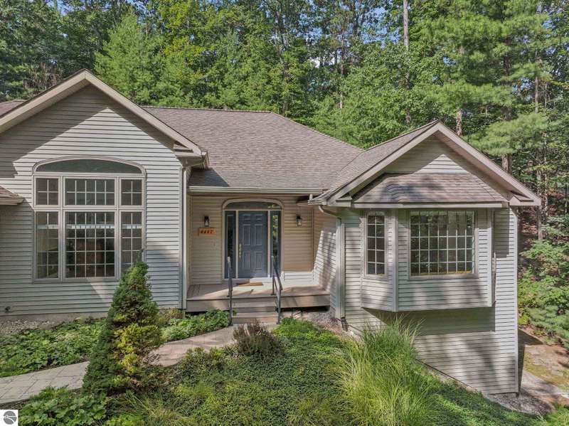 This stunning home spares no detail! Spacious home features 3 bedrooms, 2 baths, Main floor living conveniences, natural gas fireplace accents the gracious living room, large island kitchen layout with breakfast nook and access to rear covered deck, Granite c/tops, pantry and wood floors. Primary suite with walk-in closet and well-appointed bath including Jacuzzi tub and tiled walk-in shower. Main floor laundry room and family/den room. Full unfinished walk-out lower level with daylight window, 9 ft. ceiling and plumbed for bath. Attached 2 car garage. Attention to detail inside and out with lovely grounds and mature trees provide your own private oasis. Easy access to Vasa trail, Tart trail and Mt. Holiday and beaches close by.