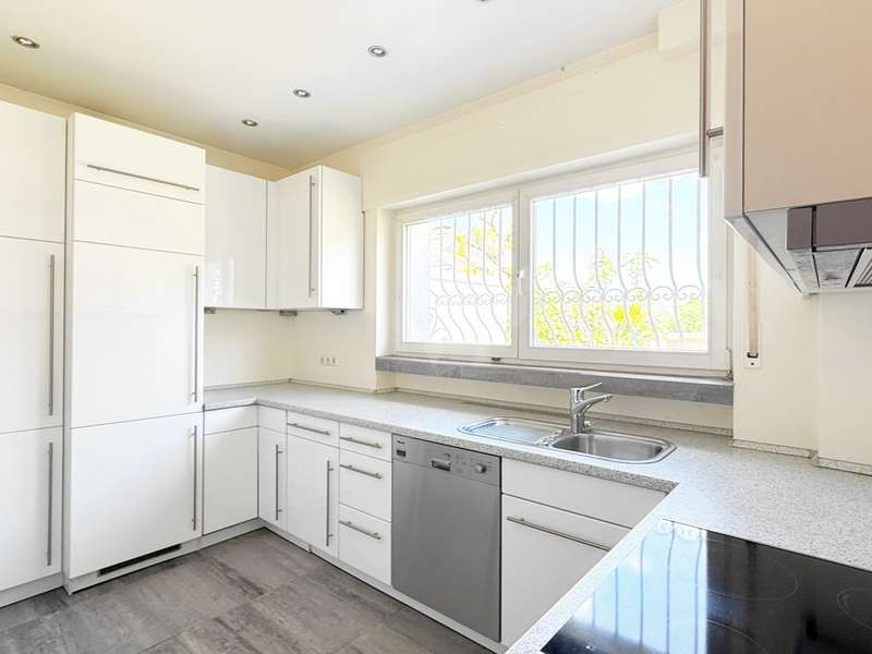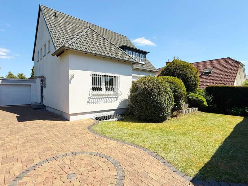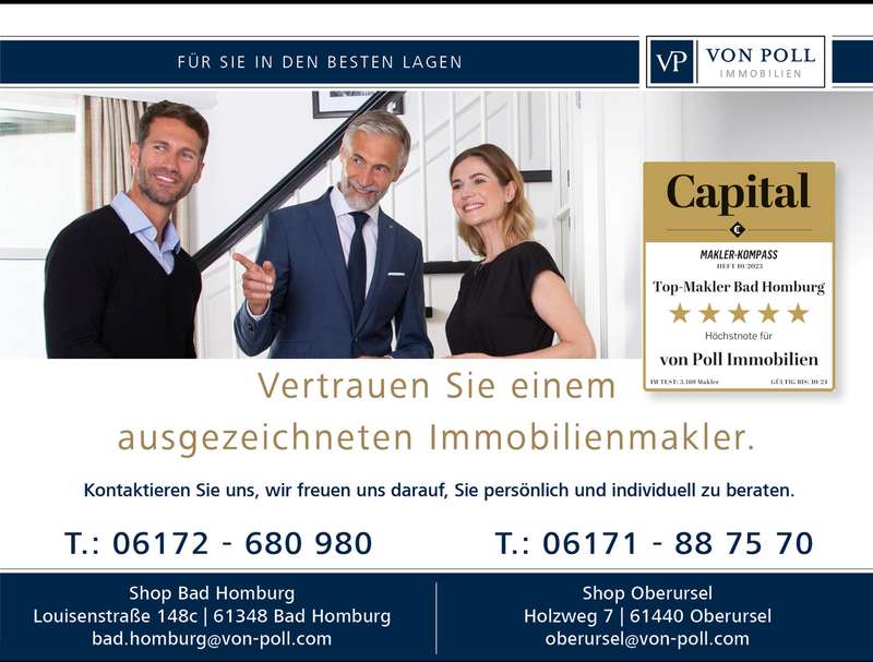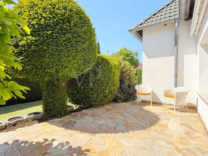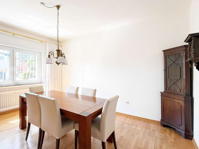 This detached single-family home with garage and sunny garden in an idyllic prime location in Bad Homburg will delight you right away. The special location combines the best of both worlds: the peace and beauty of nature with extensive green spaces and wooded areas (within walking distance of the Tannenwald forest and the Platzenberg) and the advantages of urban life thanks to the excellent connections to the city center. The family-friendly surroundings are ideal for relaxing walks and offer a wide range of leisure activities as well as space for rest and relaxation. An ideal location for anyone looking for a home in a green environment without wanting to do without the amenities of the city. Built in the early 1960s as a solid construction, the house can become a perfect family home with a few modernization adaptations. It has a large garage and parking spaces in front, still offers a wide range of possible uses today and can be individually adapted to suit your own needs. The paved courtyard and the entrance to the house have a high-quality and inviting design. The large hallway and checkroom area is fitted with natural stone flooring. From there, the spacious and sunny living room and the adjoining dining and reading area open up, which is fitted with high-quality strip parquet flooring. The kitchen could be opened up to the dining area to further emphasize the spaciousness. This living level is complemented by a further room, which would be ideal as a guest room or study, and a shower room. The inviting terrace, which can be accessed from the living room, is paved with elaborate polygonal natural stone and extends the living area in the summer months. The view of the beautifully ingrown garden invites you to spend cozy hours. The upper floor can be reached via a stylishly integrated, curved wooden staircase with a large, sunny window. There are two larger and one smaller bedroom, a dressing room (including kitchen connections - another bathroom could also be created here if required) and a daylight bathroom with bathtub. A small balcony in front of the larger bedroom further enhances the sense of space. Numerous cellar rooms are available in the basement. The garage with electric door drive and the parking spaces in front of it ideally complement the offer. With this special offer, you can create a house according to your own modernization and renovation ideas that can become your true dream home. The possibilities are endless - the potential of this detached family home is best appreciated during a personal viewing appointment.