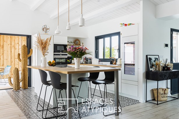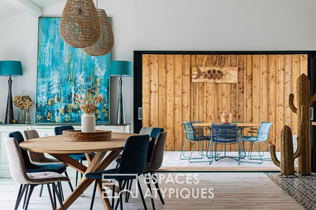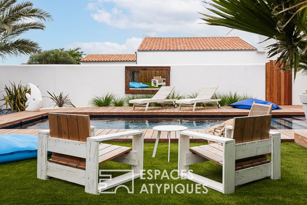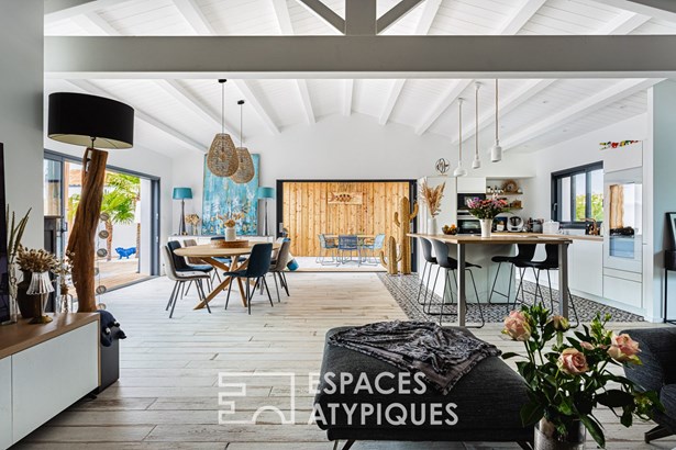 Located in the immediate vicinity of the beaches in the town of Rivedoux, this recent exceptional villa is the result of a perfect creation which combines the charm of traditional Rais with the comfort of high-end materials. As soon as you enter the reception courtyard, the large modern glass roof blends perfectly with the different stone and wood walls. Several spaces allow you to enjoy the outdoors either in the sun or sheltered under the awning which gives a glimpse of the rear garden.