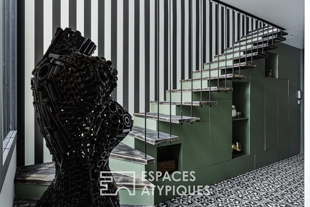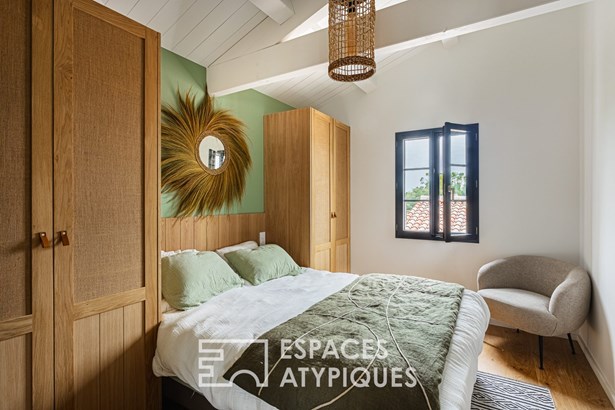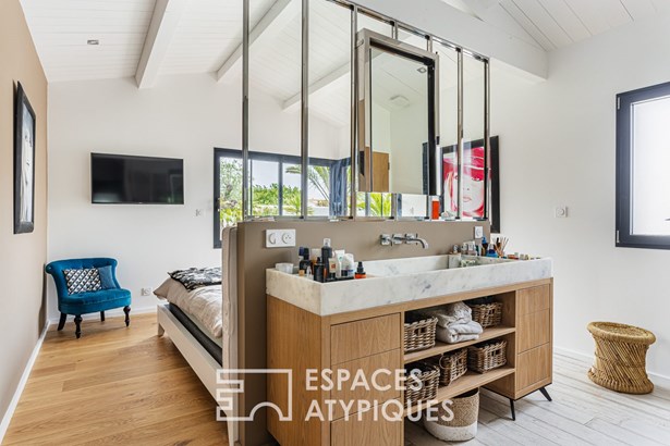 The first on the ground floor is made up of the master suite with its custom-made dressing room and its private bathroom with a privileged view of the garden. The second upstairs is made up of two bedrooms, each with a dressing room and a private bathroom, for the total independence of guests.