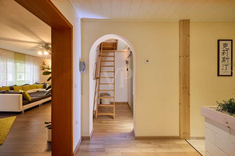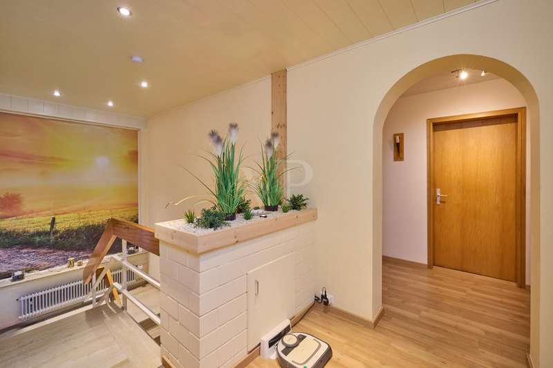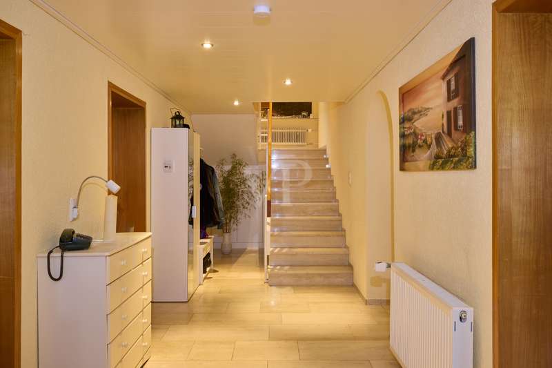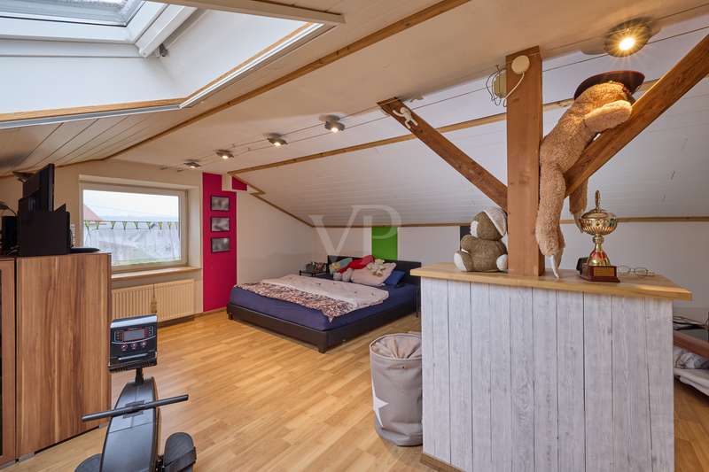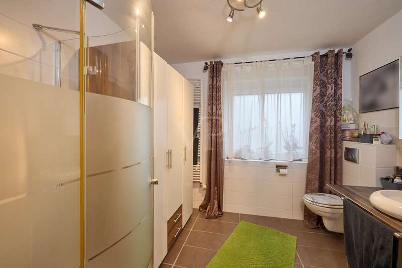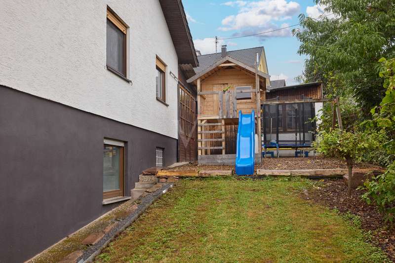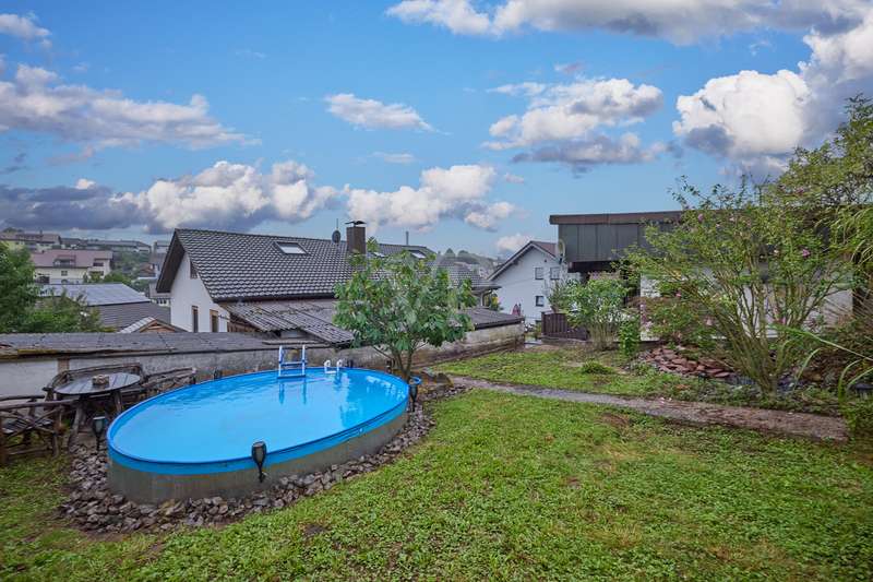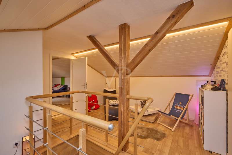 Well-maintained detached house with optional granny apartment in a quiet yet central location in Mosbach/Lohrbach. The entrance area on the first floor is reached via a few steps. The spacious hallway area on this level impresses with its stone tiled floor throughout. On this living level there is a kitchen, a sauna, a generously proportioned study, a utility room and a modern daylight bathroom including a bathtub and shower. Due to the arrangement of the rooms and the separate entrance, this area can also be used as a separate living unit. The living area on the upper floor can be accessed from the outside via the side entrance at the rear of the property. The staircase leads directly into the modern, spacious living room. The living/dining area conveys a cozy atmosphere due to the fireplace placed in the middle of the room, especially in the autumn/winter months. The kitchenette is seamlessly connected to the living/dining area and perfectly complements the open-plan living concept. The balcony on this living level can be accessed directly from the living room and is also equipped with an awning, so that even warm summer months are no problem. There are also 2 spacious bedrooms and a daylight bathroom on this floor. The first floor and upper floor are currently connected by a staircase. The fully developed top floor can be reached via the wooden staircase in the hallway area. This area impresses with a comfortable sitting area, a separate dressing room, which would also be suitable as an additional bedroom, as well as a spacious bedroom. The outside area of the property has a further extension, which is primarily used for storage. There is also a detached building on the property, which houses a workshop and a party room. The upper part of the property with its pool is perfect for warm summer evenings. There is also a playground for children on the side of the property. The good offer is perfectly rounded off by the garage including electric garage door and the additional storage space in the room above.