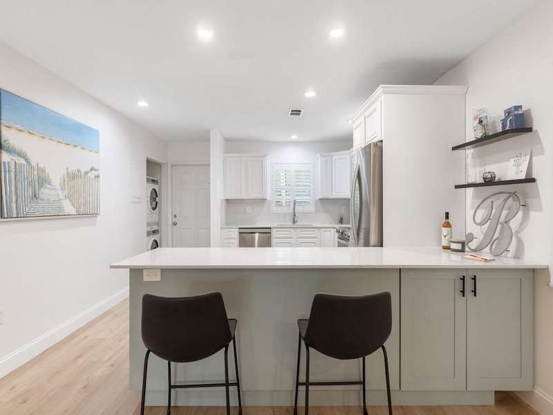 Nantucket inspired 2 bedroom, 2 bathroom, end unit East Of A1A. Featuring an open concept layout, quartz countertops, & SS appliances, it's the epitome of modern living. The artistically inspired ambiance complemented by beautiful oaks & an airy feel, makes it a haven for creativity. With impact windows adorned with plantation shutters, washer/dryer in unit, & a short stroll to Indian River County's finest beaches and incredible restaurants, convenience meets luxury effortlessly. Enjoy the refinished pool and central location. Take your bike to central beach or Riverside Park!
