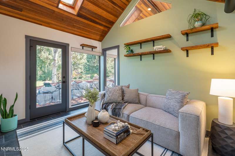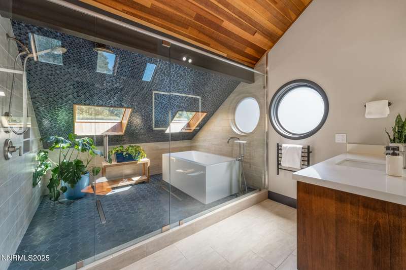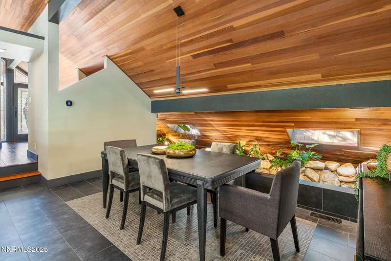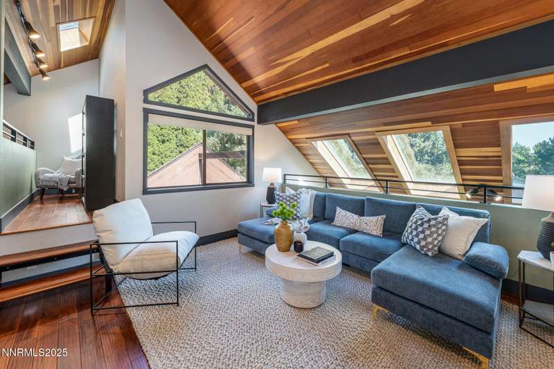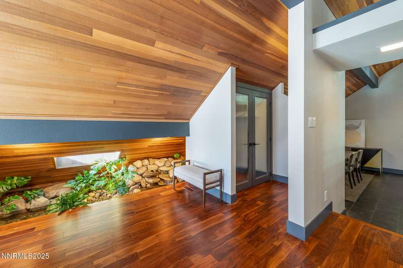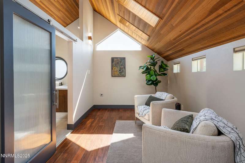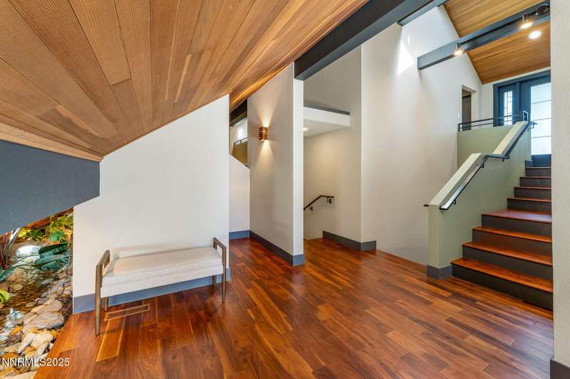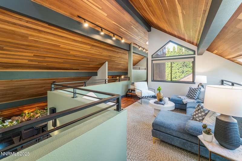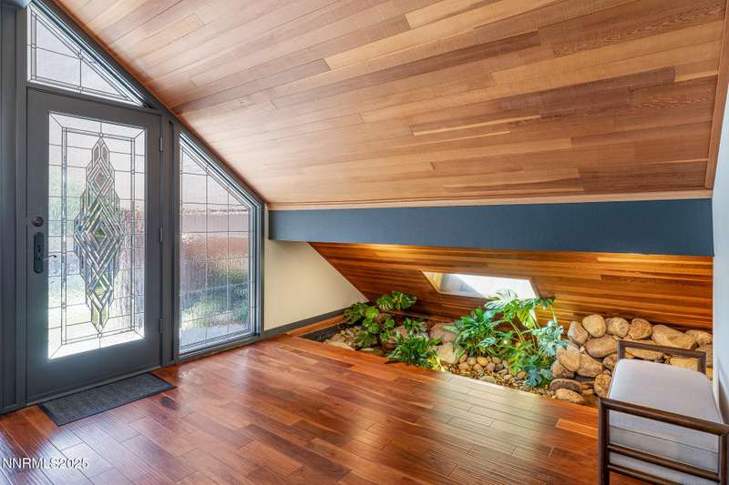 Discover a rare opportunity to own an architectural masterpiece, 1980s award-winning work of art in the highly sought-after Lake Ridge Shores community of southwest Reno. This split-level residence is more than a home - it's an experience - where every angle, finish, and feature has been intentionally designed to delight. Step inside to find a balance of hardwood and ceramic tile flooring, anchored by soaring redwood-finished ceilings that highlight striking architectural lines and flood the space with natural light. A remarkable live green planter with a fountain feature runs the full length of the home, bringing the outdoors in and creating a sense of calm and connection. At the center of it all, the custom kitchen is equal parts functional and striking, with rich wood-finished cabinetry, a coffee or cocktail bar with open shelving, and design accents that invite both creativity and conversation. One of the home's most delightful details—a circular window—adds a sense of whimsy and fun, making this space as unique as it is inviting. The primary suite redefines relaxation. Expansive in scale yet intimate in feel, it is designed as a true spa retreat, where comfort meets artistry. The bathroom's bold architecture and thoughtful finishes are elevated with heated tile floors and towel racks, offering a daily indulgence in warmth and luxury. Every detail—down to the angles, lighting, and textures—was carefully curated for both beauty and function. Additional features include a bonus loft for flexible living, and an attached bedroom or office space perfectly suited to today's lifestyle. The home's smart technology, with integrated Lutron and Hue lighting systems managed at the touch of an iPad, allows for effortless ambiance and personalization. Throughout the residence, multiple sitting areas invite connection and reflection, while expansive windows frame the tranquil greenbelt backdrop—offering ultimate privacy within this prestigious gated community. Here, architecture, nature, and modern living converge into a home that is as rare as it is remarkable.