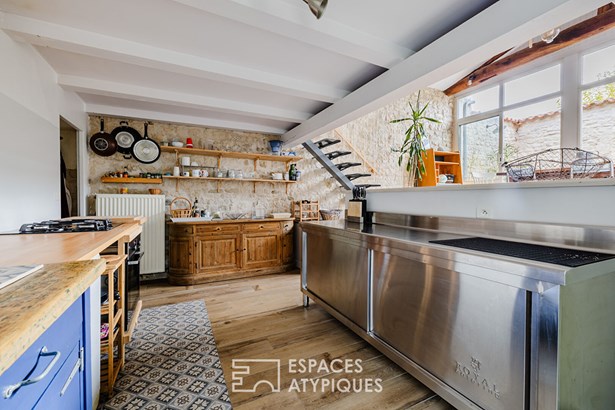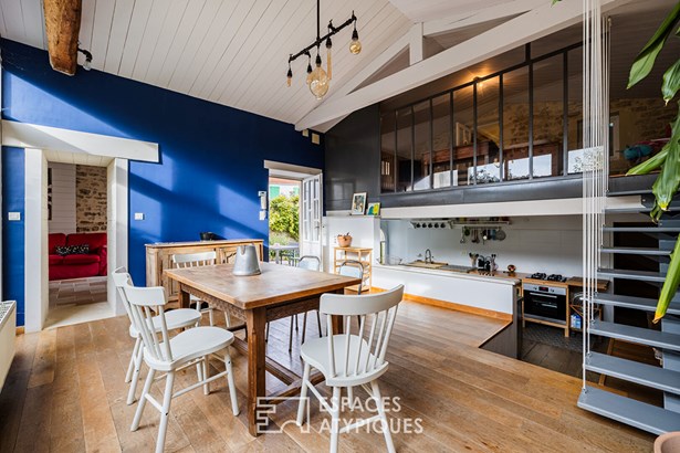Crafted in the former wine cellar, this second wing features an open-plan kitchen and dining room. A bright 16-square-meter mezzanine provides a versatile space.
