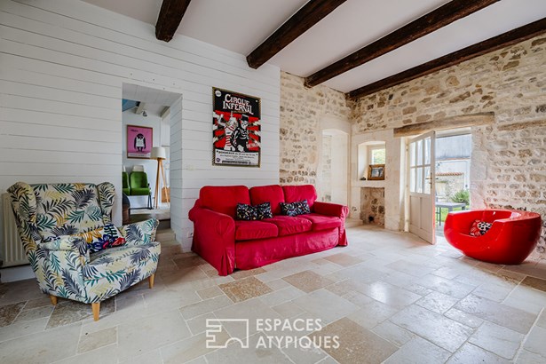 The property, restored in 2018, offers approximately 180 square meters of living space. The work was meticulous, highlighting the original interior and exterior walls while infusing a modern style that blends seamlessly with the original features. Large windows flood the spaces with light, showcasing the antique parquet floors and exposed beams.