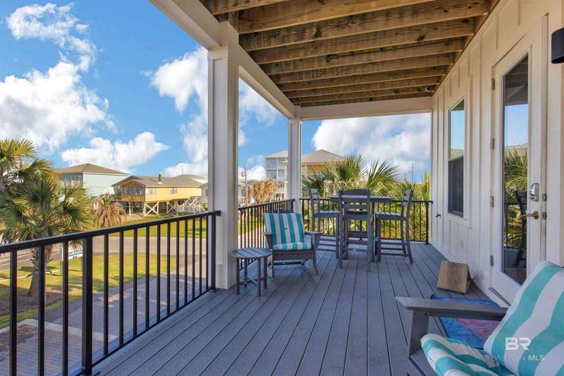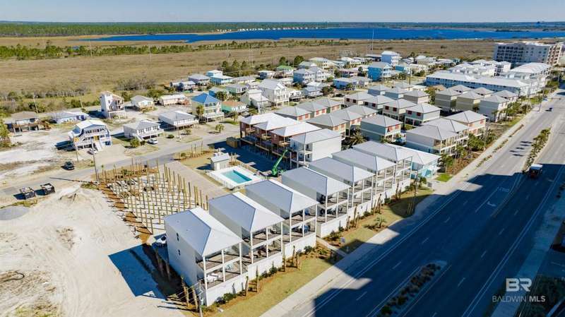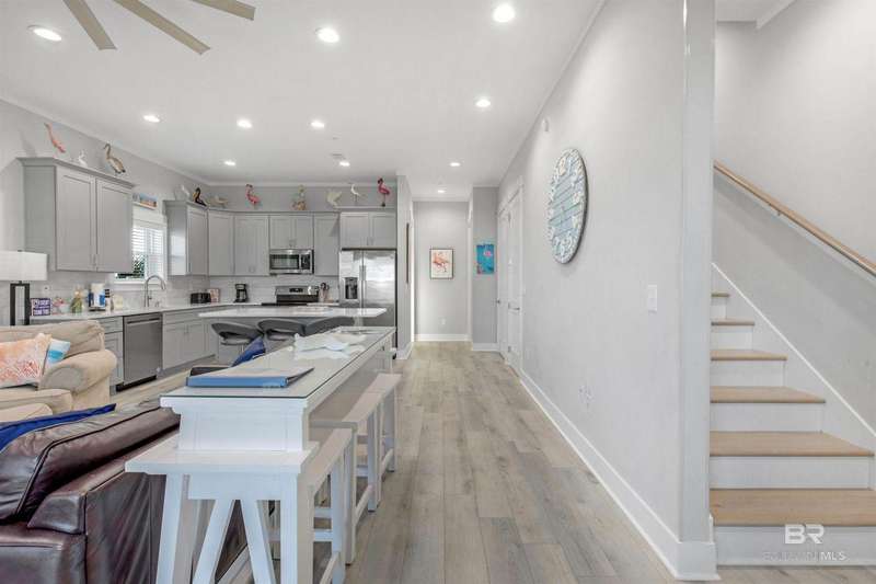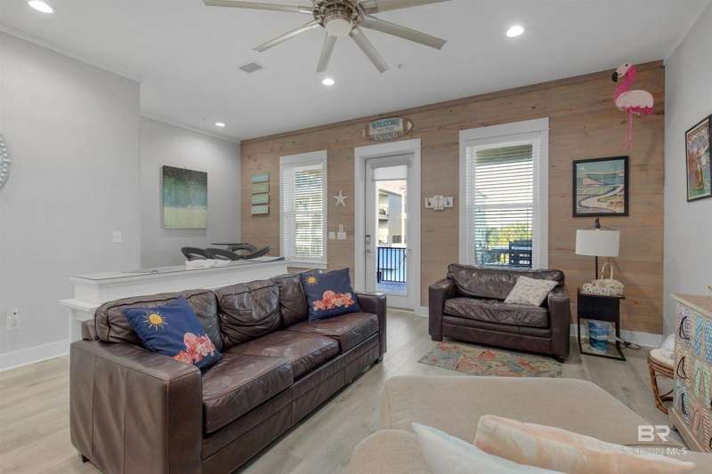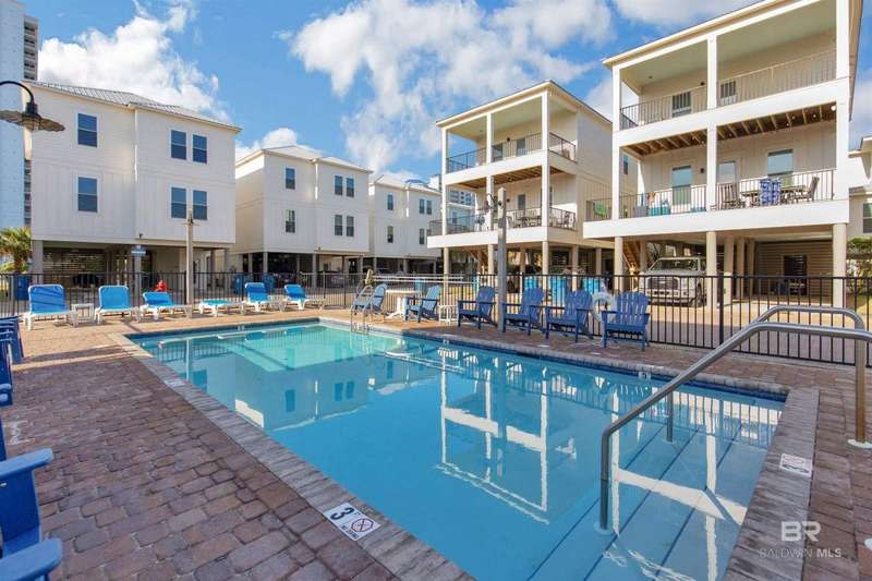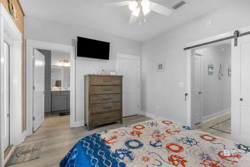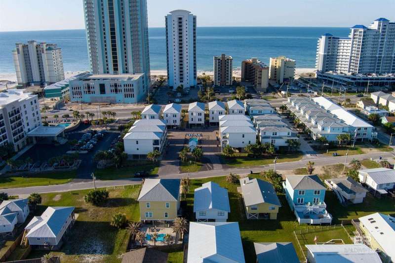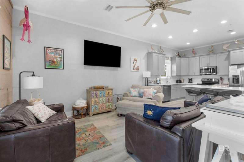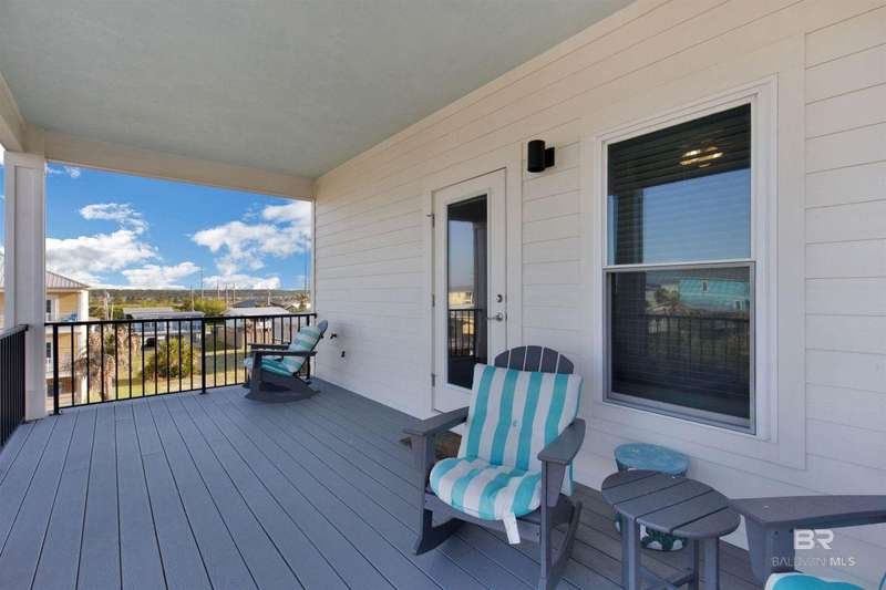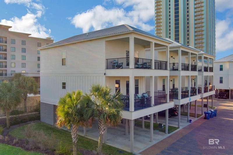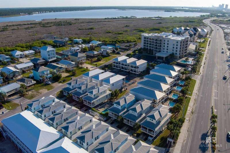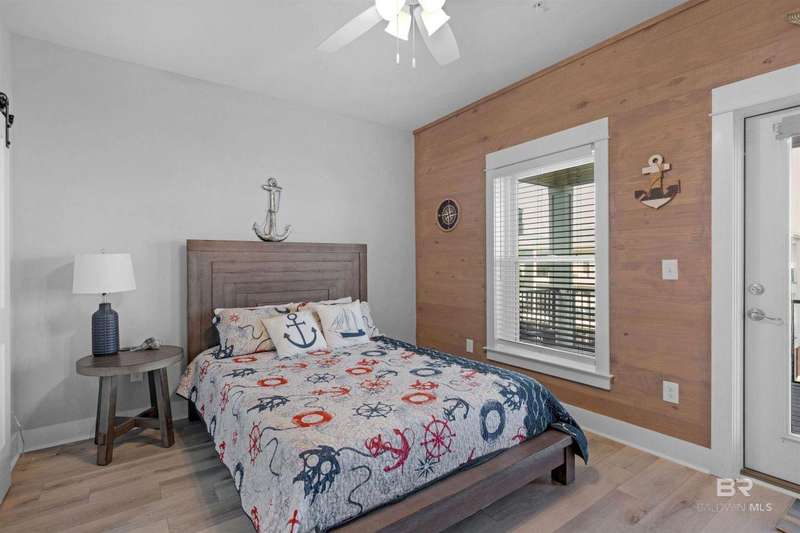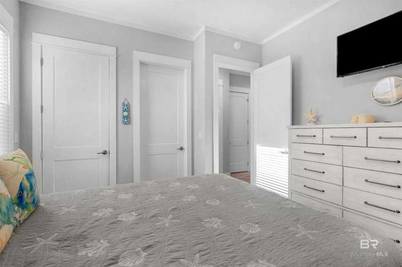 Welcome to East Eleven Cottages, centrally located in the heart of Gulf Shores and close to many restaurants and attractions with beach access just across the street. This 4-bedroom, 4-bath GOLD-FORTIFIED cottage has spacious, private decks (22x10) on both the ground level and second level. Unique to Lot L is the upper level view of Lake Shelby, see photos! Short-term and vacation rentals allowed in addition to its central location make this an ideal investor's opportunity. This property can sleep up to 14 people, comes fully furnished, and rent-ready for guests to enjoy. The first floor has an open floor plan, high ceilings, and crown molding that elevate the space as the functional center of the home. The kitchen features quartz countertops, a subway tile backsplash, and a large island for extra counter space and storage. The shiplap accent wall in the great room adds visual interest and texture to the space. There are 2 primary bedrooms with one on the ground level and the other upstairs overlooking the private deck. The remaining 2 bedrooms are also upstairs and all 4 bedrooms feature an en-suite. For easy maintenance, this home has LVP flooring throughout and all bathrooms feature quartz vanity counters as well. Each upstairs bedroom has a sliding barn door hung as a single door at each bedroom's entrance. Deep parking can accommodate up to 4 vehicles and includes an 11'x10' outdoor storage space. There is a pool in the center of the development and a looped brick-paver road for easy ingress/egress. Beach access is a short walking distance away, with a light and cross walk. Buyer to verify all information during due diligence.
