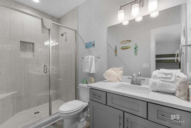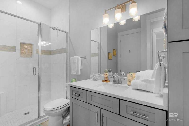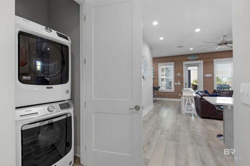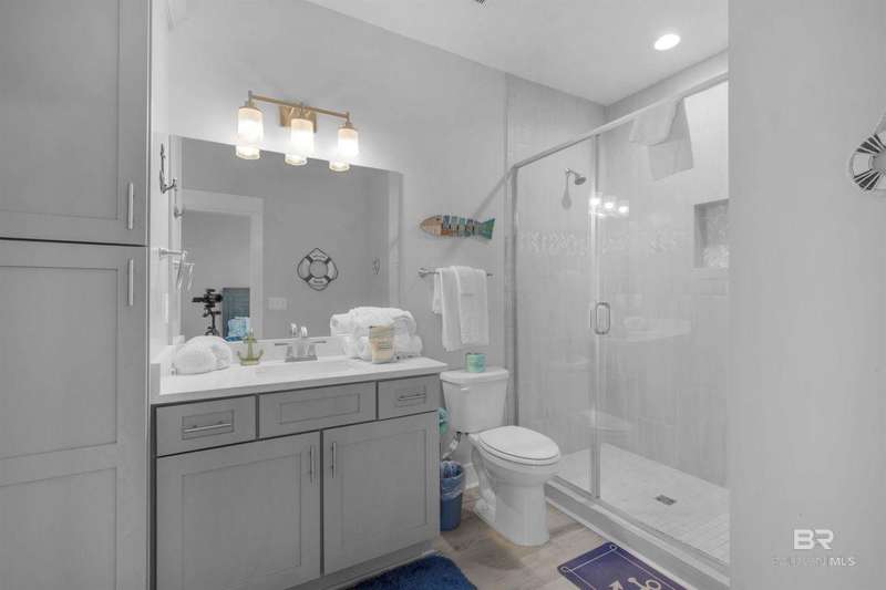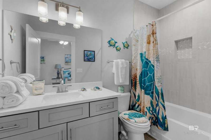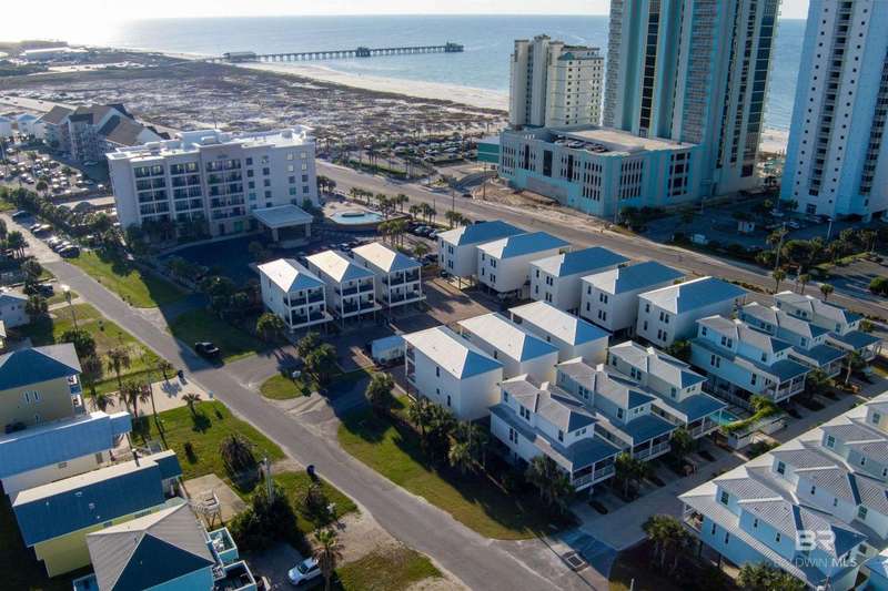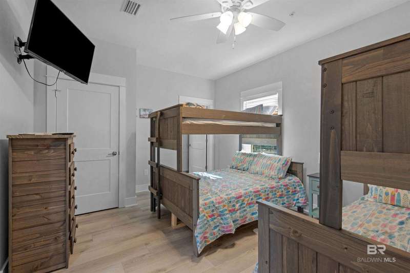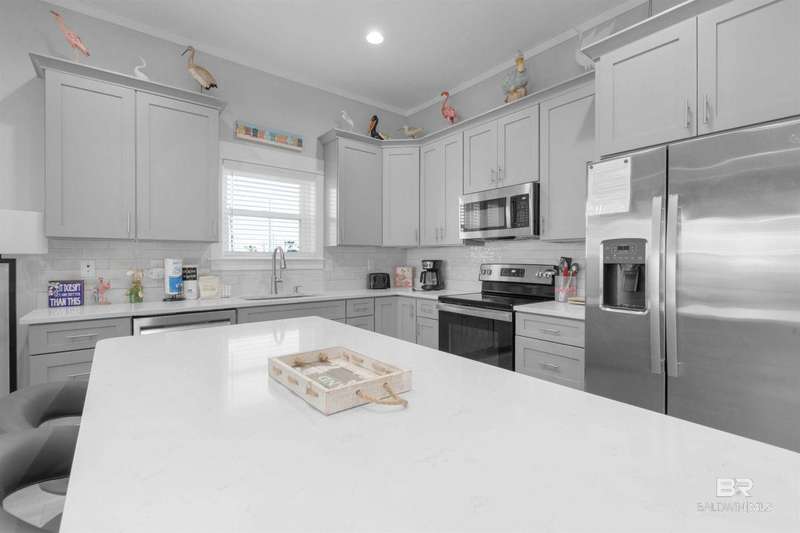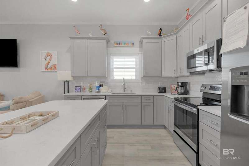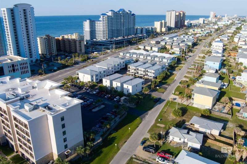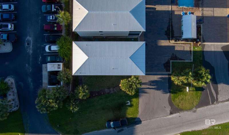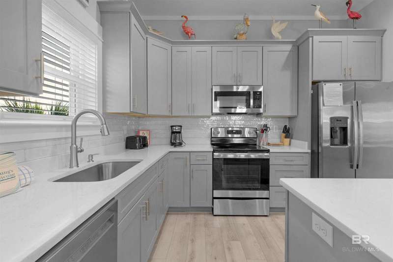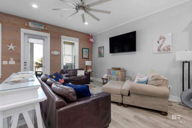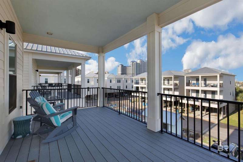Welcome to East Eleven Cottages, centrally located in the heart of Gulf Shores and close to many restaurants and attractions with beach access just across the street. This 4-bedroom, 4-bath GOLD-FORTIFIED cottage has spacious, private decks (22x10) on both the ground level and second level. Unique to Lot L is the upper level view of Lake Shelby, see photos! Short-term and vacation rentals allowed in addition to its central location make this an ideal investor's opportunity. This property can sleep up to 14 people, comes fully furnished, and rent-ready for guests to enjoy. The first floor has an open floor plan, high ceilings, and crown molding that elevate the space as the functional center of the home. The kitchen features quartz countertops, a subway tile backsplash, and a large island for extra counter space and storage. The shiplap accent wall in the great room adds visual interest and texture to the space. There are 2 primary bedrooms with one on the ground level and the other upstairs overlooking the private deck. The remaining 2 bedrooms are also upstairs and all 4 bedrooms feature an en-suite. For easy maintenance, this home has LVP flooring throughout and all bathrooms feature quartz vanity counters as well. Each upstairs bedroom has a sliding barn door hung as a single door at each bedroom's entrance. Deep parking can accommodate up to 4 vehicles and includes an 11'x10' outdoor storage space. There is a pool in the center of the development and a looped brick-paver road for easy ingress/egress. Beach access is a short walking distance away, with a light and cross walk. Buyer to verify all information during due diligence.