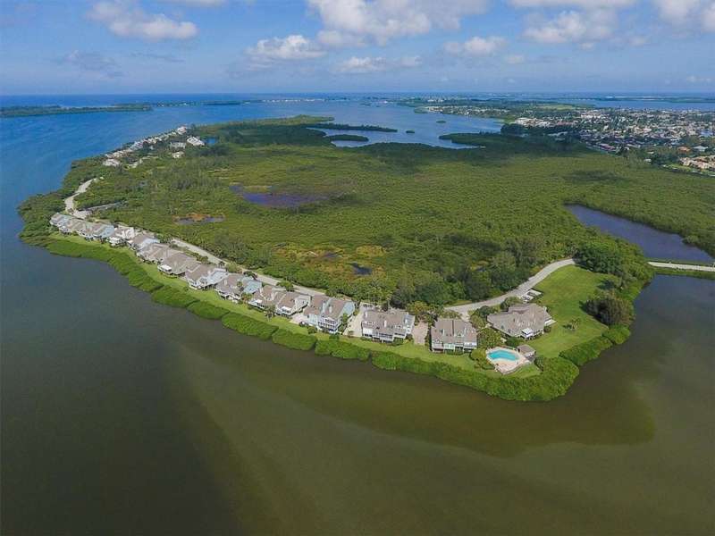 EXCLUSIVE, TRANQUIL, PRIVATE AND AN ISLAND (TIDY ISLAND) YOU CAN CALL HOME! Tidy Island - A truly private and gracious lifestyle awaits you your tropical Florida retreat. Tidy Island is located on the North end of Sarasota Bay and is about a mile long and a few hundred yards wide with gorgeous bay views and a beautifully landscaped 140 acre wildlife sanctuary. This rarely available Aerial end unit has over 4,100 sq ft. of interior space and over 2,000 sq ft of lanai space, with southern waterfront living with the best views of the Bay and Longboat Key. Enjoy your morning coffee from the Primary Suite on the third floor while watching the dolphins jump in the water or the seabirds fishing the flats. Tidy Island also provides the best in amenities such as: Mile long waterfront panorama views, 3100 sq. ft. recreation center, 2 swimming pools, hot tub, tennis court, nature trail, historical museum, and 24-hour security on site. Schedule your private appointment and come home to your private island and maintenance free living.
