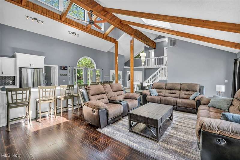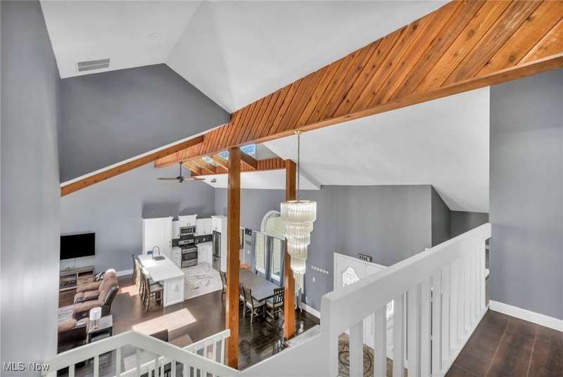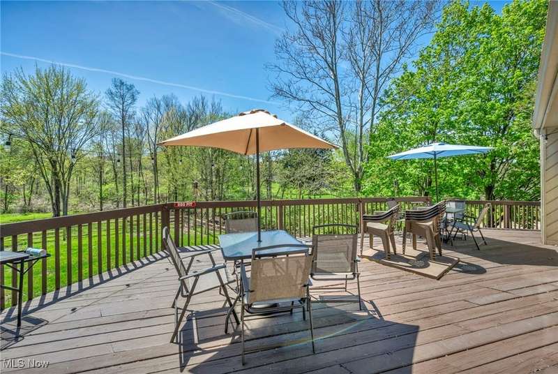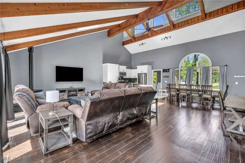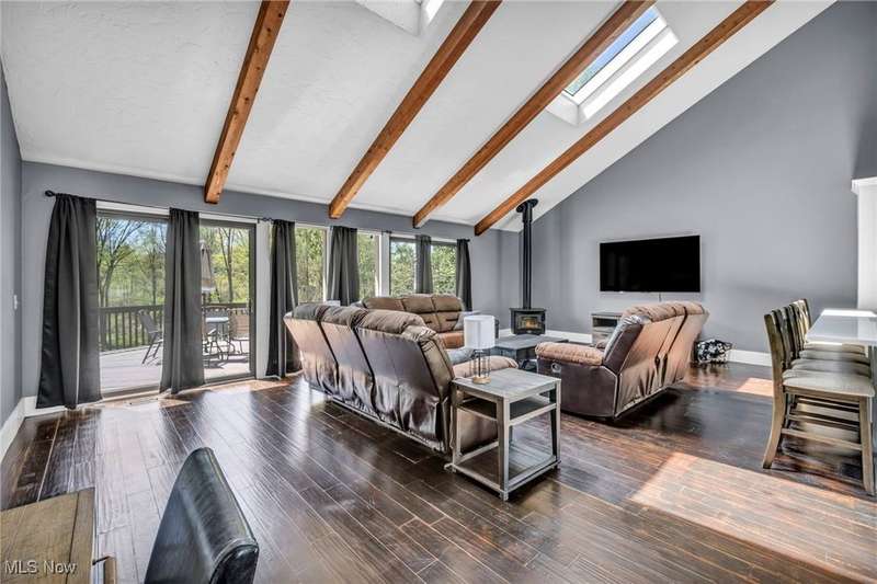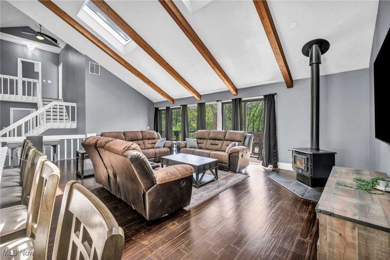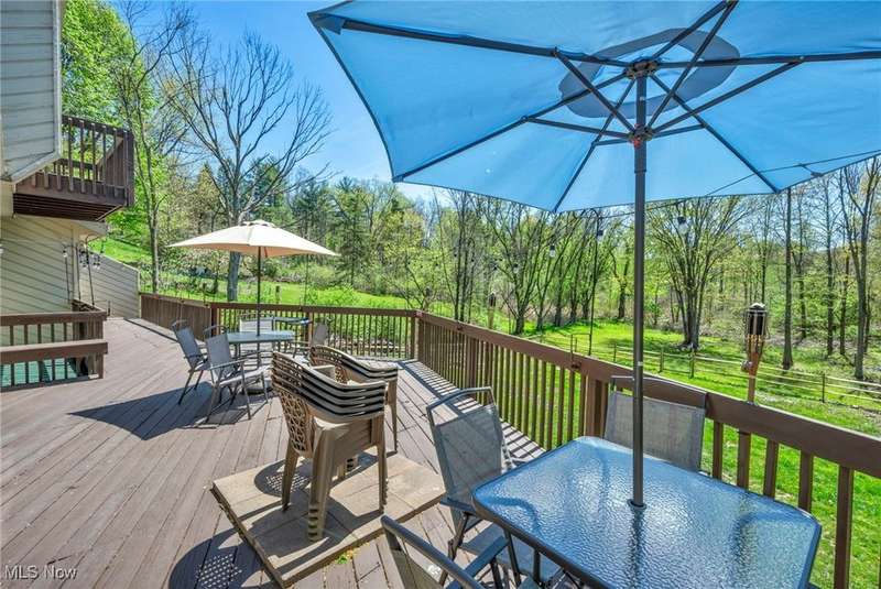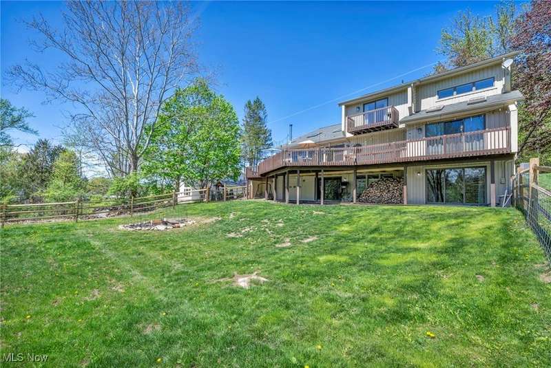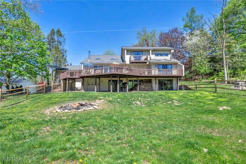 Stunning Rustic Hills Retreat in Highland School District. Welcome to this beautifully updated & spacious home located in the highly desirable Rustic Hills community of Montville Township?nestled within the top-rated Highland School District. Situated on a private 1-acre lot, this 4-bedroom, 3.5-baths home blends rustic charm with modern luxury across an open and thoughtfully designed floor plan. As you step through the front door, you're welcomed by a dramatic two-story vaulted ceiling adorned with natural wood beams, creating a warm, lodge-like ambiance. The expansive great room features a cozy wood-burning stove and skylights that flood the space with natural light. The open-concept layout flows effortlessly into the dining area and a completely remodeled kitchen (23) boasting custom cabinetry, quartz countertops, new stainless-steel appliances, and a massive island with seating for up to eight?perfect for entertaining. The generously sized master suite is a true retreat, complete with private deck access, dual quartz vanities, and a luxurious walk-in shower. Upstairs, you'll find two more spacious bedrooms and a fully updated bathroom (2023), with one of the rooms offering its own private balcony. The finished lower level adds incredible flexibility with an additional bedroom/living space, a sleek full bathroom, and a media or bonus room ideal for movie nights or a home office. A two-car front-facing garage is complemented by a unique rear bonus garage currently used as a hot tub room, complete with wall-mounted TVs and a dog washing station?making this home as practical as it is luxurious. Outside, enjoy the mix of cleared and wooded land, enclosed with a brand-new fence (24), offering privacy and space for pets, play, or gardening. Conveniently located just minutes from shopping, restaurants, and quick access to I-71 and Route 18, this home truly has it all?space, style, comfort, and location. Don't miss your chance to own this exceptional Rustic Hills home!