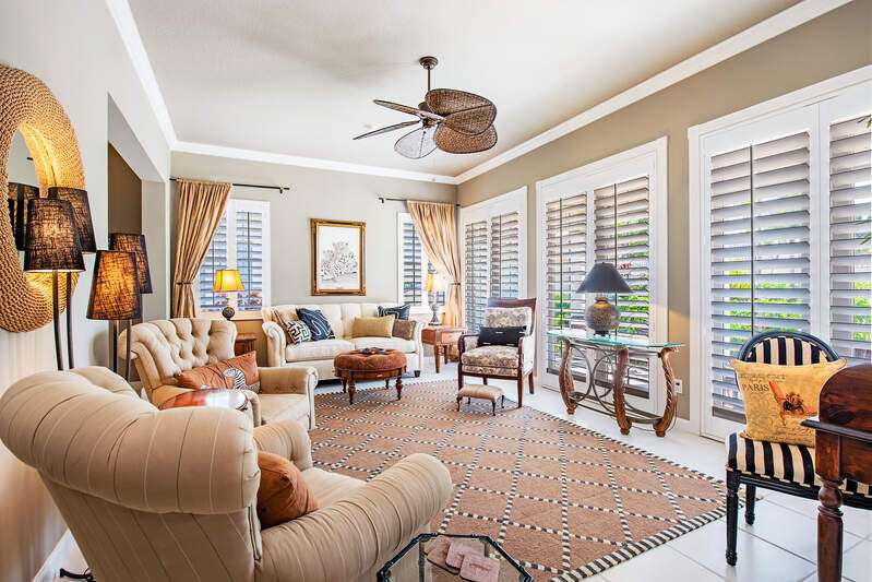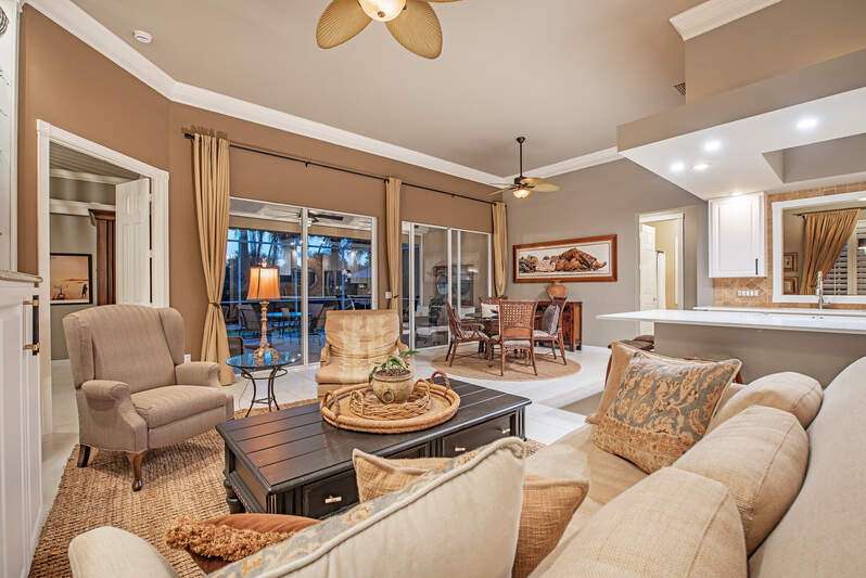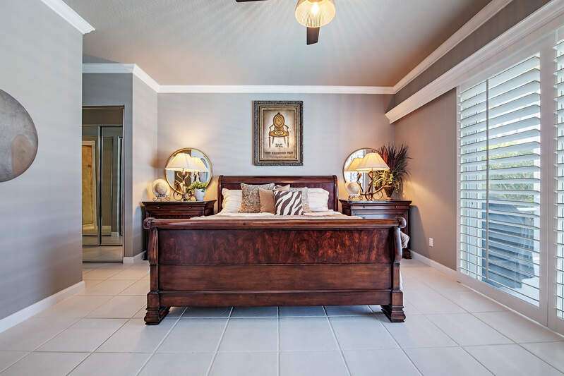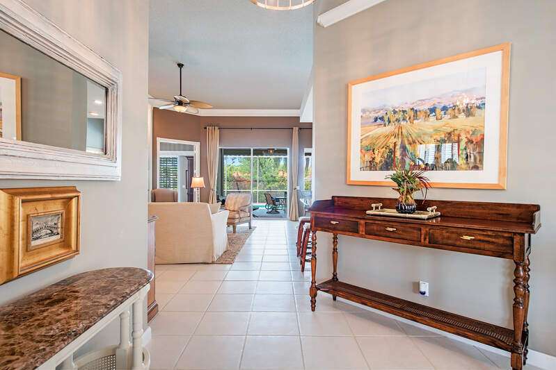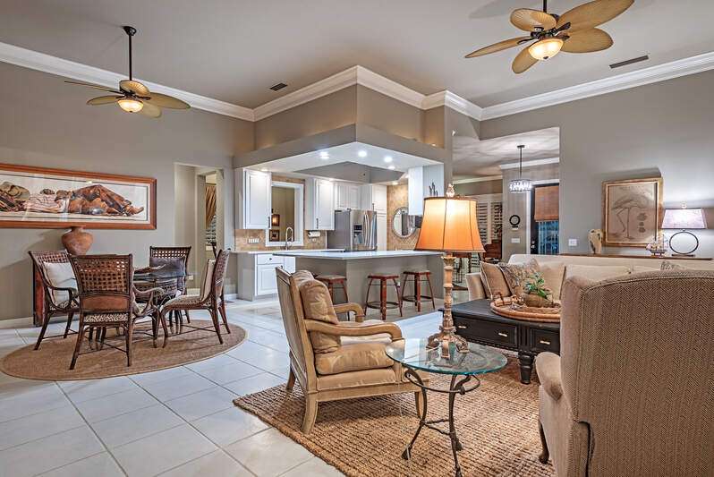 This exquisite home offers a perfect blend of classic sophistication and comfort, combined with the vacation lifestyle you've been dreaming of. Step onto the charming Southern-style front porch and into a thoughtfully designed 2,500+ sq. ft. Carlyle floor plan home featuring 4 bedrooms and 3.5 baths, providing plenty of space for you and your guests. Outside, the screened lanai invites you to relax by the sparkling pool, complete with a charming dolphin fountain and a new pool pump. An electric, retractable awning adds additional space beyond the covered lanai, offering plenty of shade for those warm Florida days. Enjoy stunning lake views and breathtaking sunsets as you entertain or unwind in your private backyard oasis, surrounded by lush, tropical landscaping. Inside, the home offers a well-defined floor plan, with a formal living room, spacious family room, and a beautifully appointed kitchen with a separate morning room for casual dining. The formal dining room provides an elegant setting for meals. The kitchen has been updated with gorgeous quartz countertops, a new deep stainless sink, new faucet, newer microwave, and new hardware. The owner's suite is a true retreat, offering easy access to the pool, generous closet space, and a true his-and-her bath with dual vanities, tumbled marble counters, a walk-in shower, and a soaking tub. Luxury touches throughout the home include plantation shutters or shades on all windows, crown molding, decorator lighting, new ceiling fans inside and out, new exterior lighting, professionally painted interior, and built-in closets that enhance both convenience and style. The finished laundry room features a new Samsung washer and dryer, cabinets, and a utility sink. With a brand-NEW ROOF just installed and a newer A/C, this residence provides a worry-free lifestyle for years to come. Storm prep is simple with accordion shutters and electric roll-down shutters. Located in Island Walk, a vibrant, amenity-rich community with a variety of recreational options to fit your lifestyle. The Town Center includes a large resort pool, lap pool, fitness center, tennis courts, pickleball, bocce courts, and a restaurant, along with everyday conveniences like a gas station, post office, and hair & nail salon. Take advantage of miles of scenic walking paths, complete with picturesque bridges over sparkling lakes, all while being centrally located in Naples, close to shopping, dining, and beaches. This home offers the perfect opportunity to enjoy the relaxed, resort-style living you've been dreaming of. Move in and start living the idyllic lifestyle that Naples has to offer!