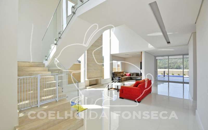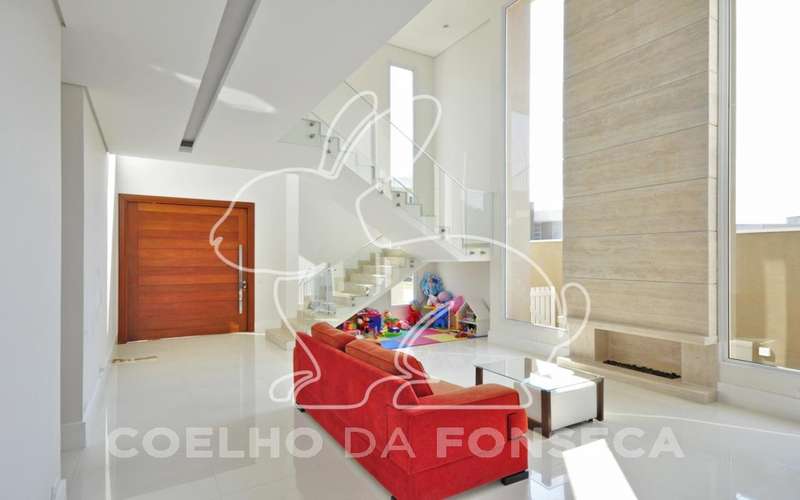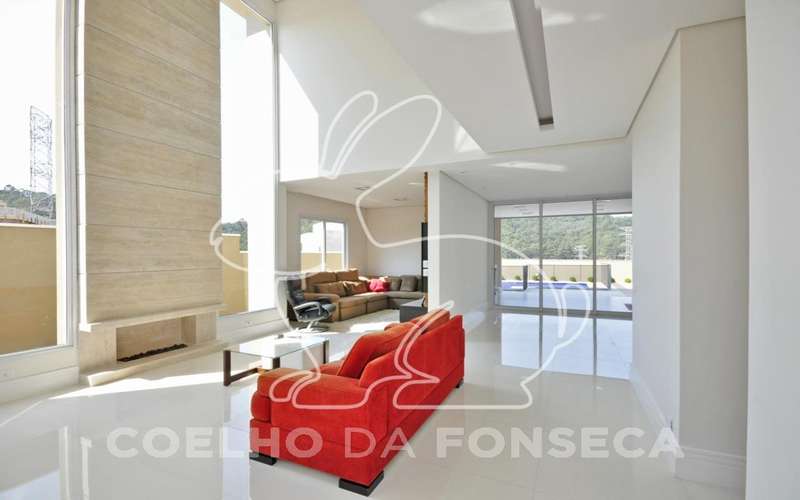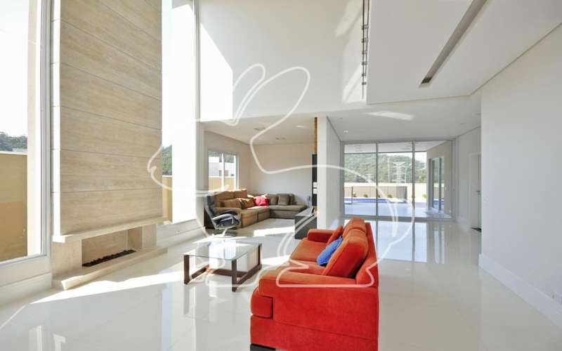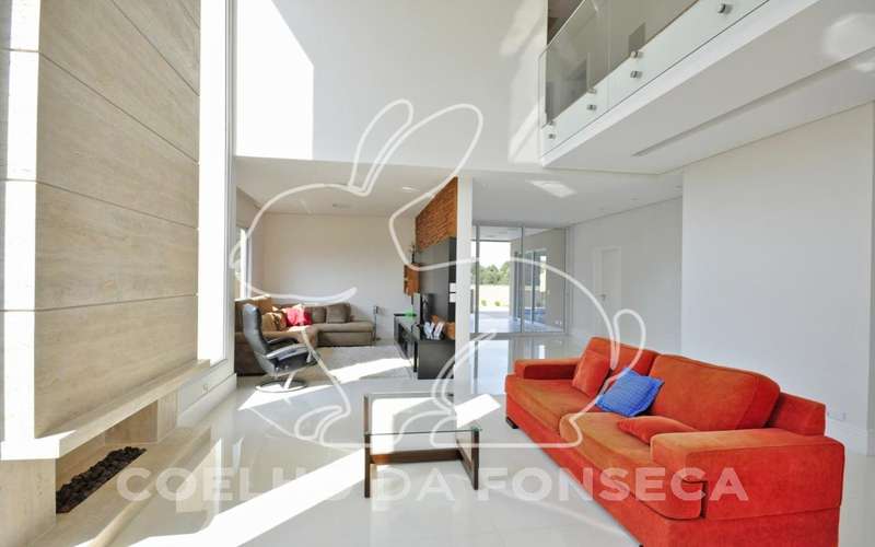 Linda casa, clean, pé direito duplo, fino acabamento, piso em porcelanato Portobello e madeira Cumaru,, escritório, três suítes, ar condicionado, sala com lareira com controle remoto, sala jantar e TV, armários planejados ID, master com varanda, closet duas cubas, hidro, aspiração central, piscina com aquecimento solar, boiler de 600 litros, fotovoltaica, fundo para mata, documentação Ok para financiamento.