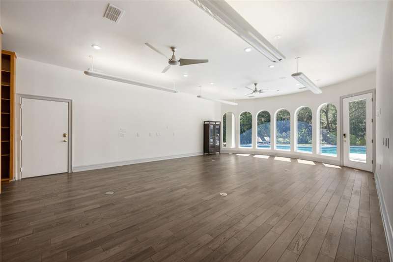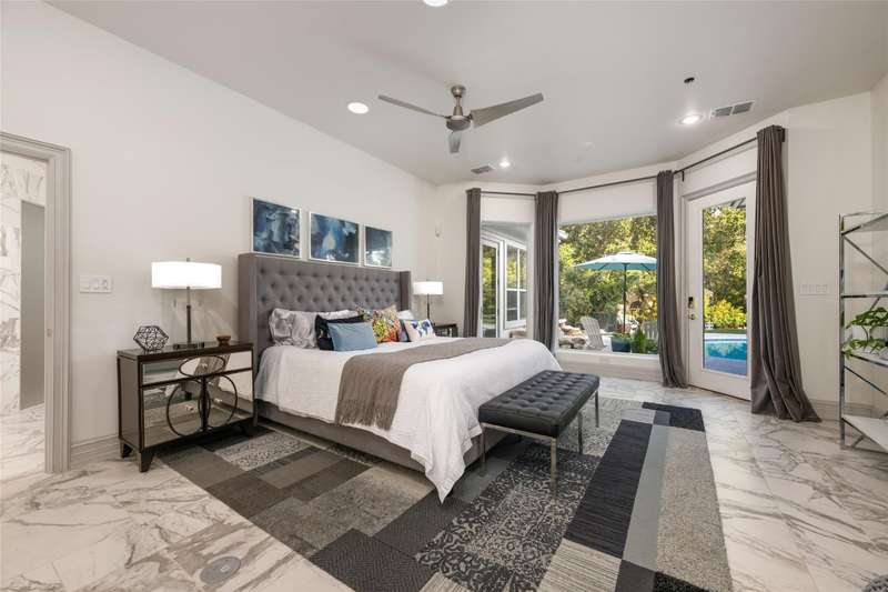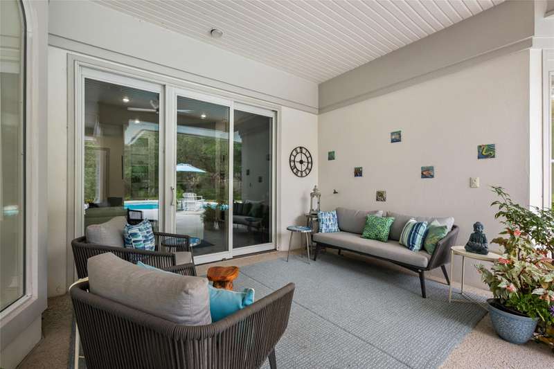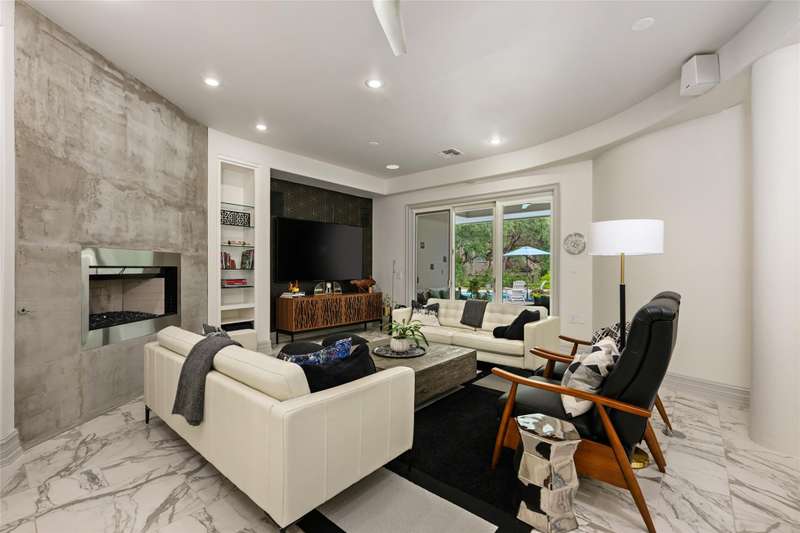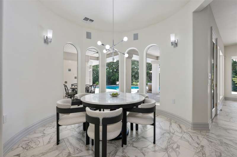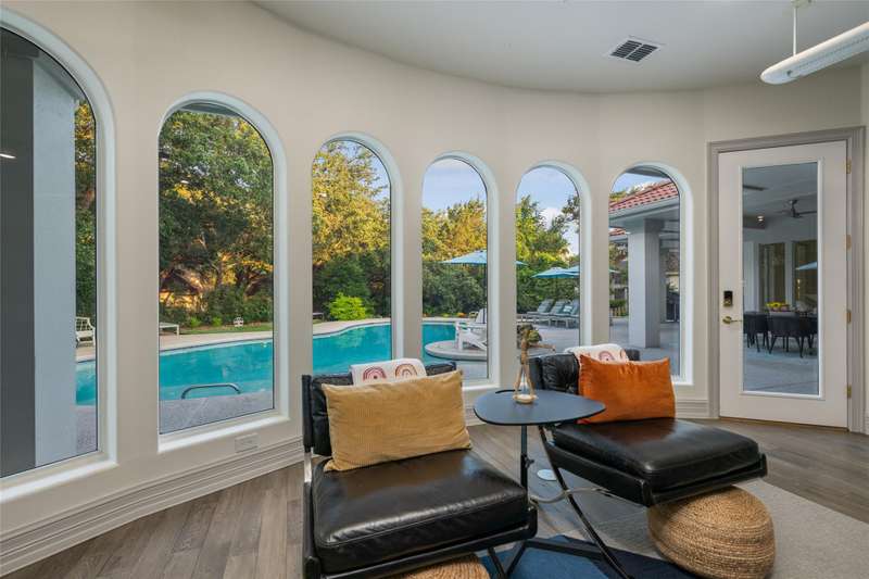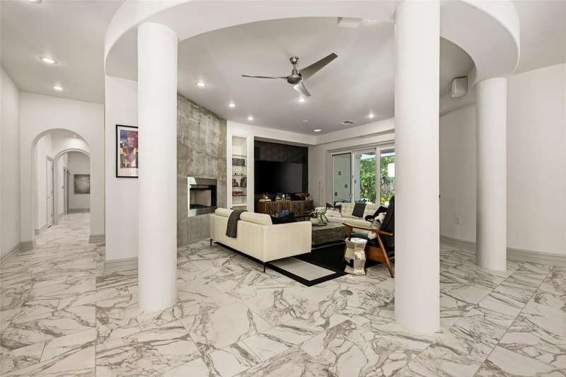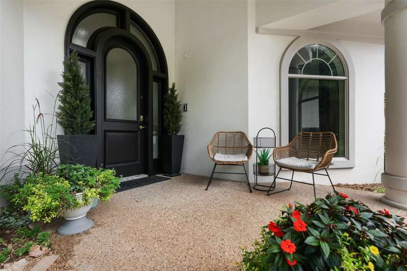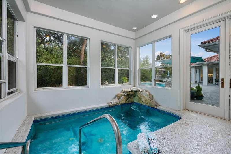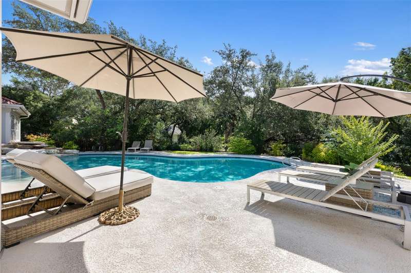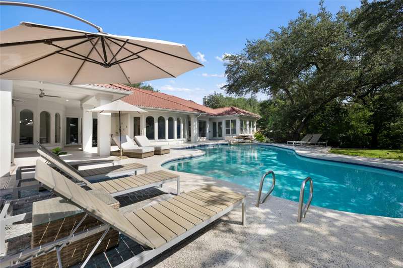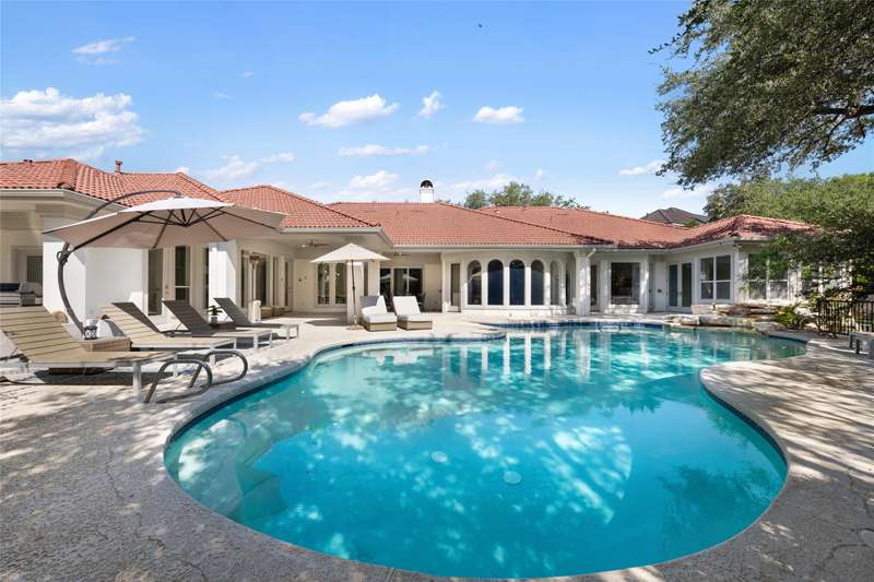 Spanish-style architecture meets contemporary luxury at this 4-bedroom, 3.5-bathroom home nestled in a quiet cul-de-sac. The beautifully curated interiors impress the moment you enter the residence, with gorgeous tile floors and a double-height rotunda. The resort-style pool is the home's focal point, with ample windows that invite picturesque views of the backyard inside. Enjoy the open-concept floor plan across multiple living and dining areas, including a living room with a fireplace, formal dining, a rounded breakfast nook, and a family room. The kitchen is outfitted with high-end stainless steel appliances by Viking, bar seating, a coffee bar, and a center island. The expansive media room boasts floor-to-ceiling bookshelves for your personal library, as well as stunning arched windows that provide the space with abundant natural light. Escape to luxury in the primary suite with backyard access and a spa-inspired bathroom with a soaking tub, heated floors, a walk-in shower, dual vanities, a walk-in closet, and a highly desirable indoor therapy pool. Guests will enjoy spacious bedrooms and upgraded bathrooms, including a second primary en-suite with a soaking tub, walk-in shower, and heated floors. In the backyard, tranquility and relaxation abound, with a resort-style pool and waterfall. Dine al fresco on the covered patio with a view of the landscaped backyard. The home has a pre-wired sound system, allowing you to easily connect your devices. A 3-car garage with a workshop and an EV charging station provides additional storage. The home is part of The Courtyard community, which offers access to a private park on Bull Creek featuring trails, playgrounds, and a dock for canoeing, kayaking, and other recreational activities, as well as access to Lake Austin. This home has perfected single-story living in a coveted Austin neighborhood. Tax and assessed values are estimates for illustration purposes only. All figures should be independently verified.