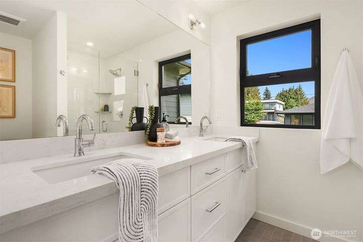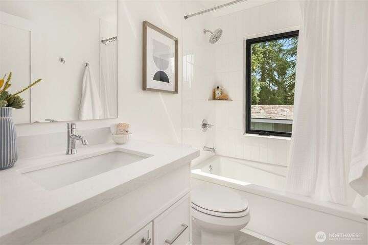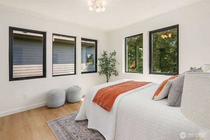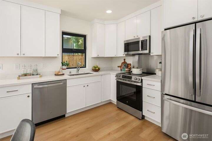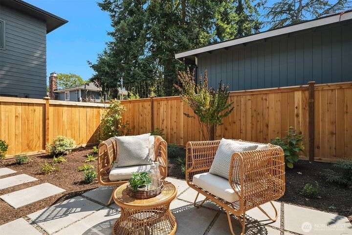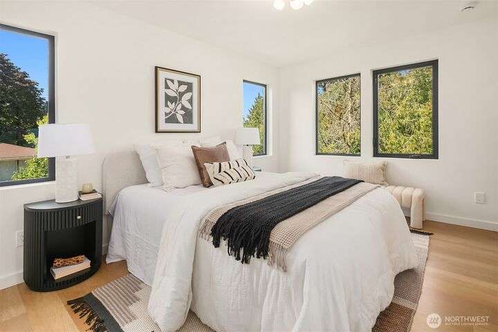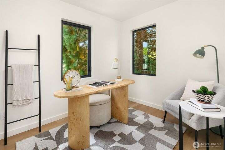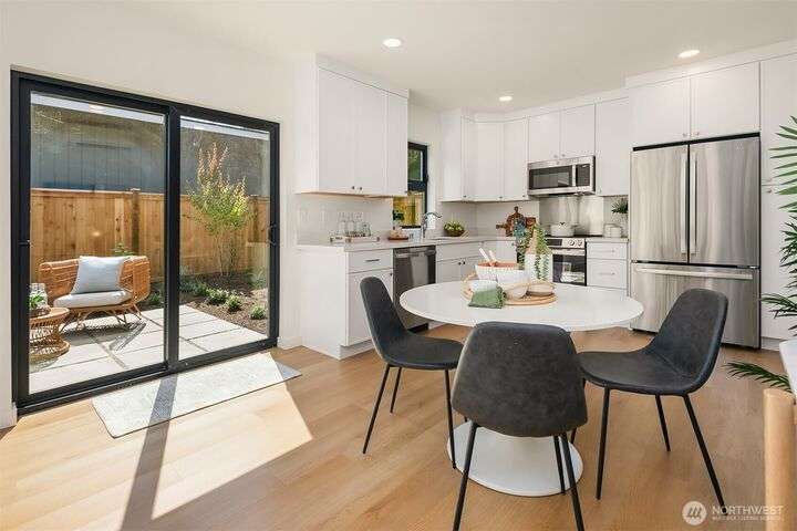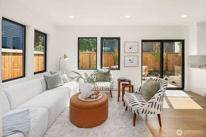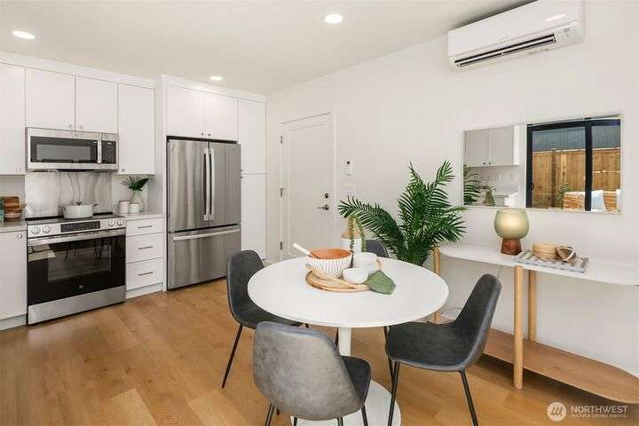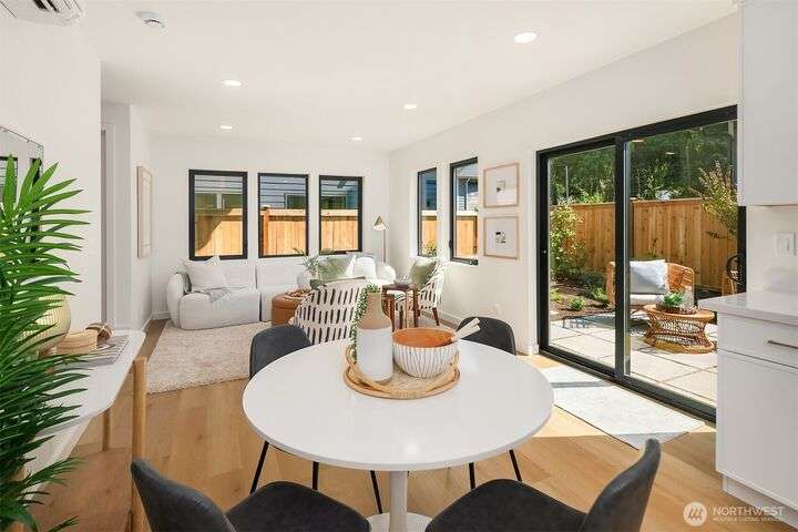 Brand new 2-bedroom DADU in Seattle’s Bitter Lake neighborhood offers modern living with smart design and stylish finishes. This detached home is pending it's Built Green 4 star certification and features an open-concept main floor with high ceilings, a sleek kitchen with quartz counters and stainless steel appliances, and large windows that fill the space with natural light. Upstairs, find a primary suite, a spacious 2nd bedroom, beautifully appointed full bath plus an office. Energy-efficient systems and mini-split heating/cooling provide comfort and convenience. Enjoy a private patio, fenced yard and oversized 1-car garage. Located on a quiet street just blocks from Bitter Lake Park, trails, transit and shops.