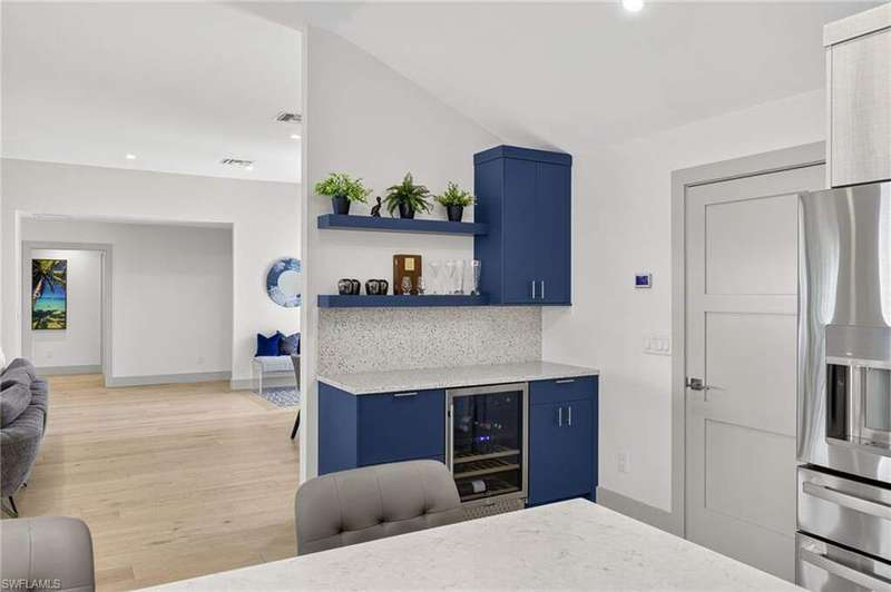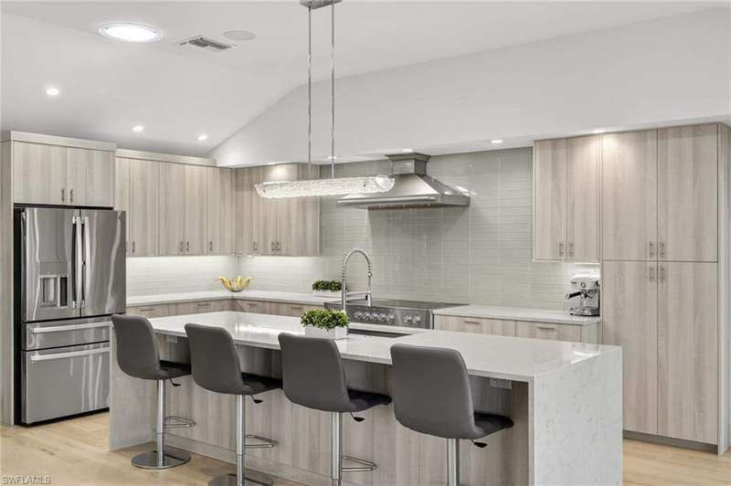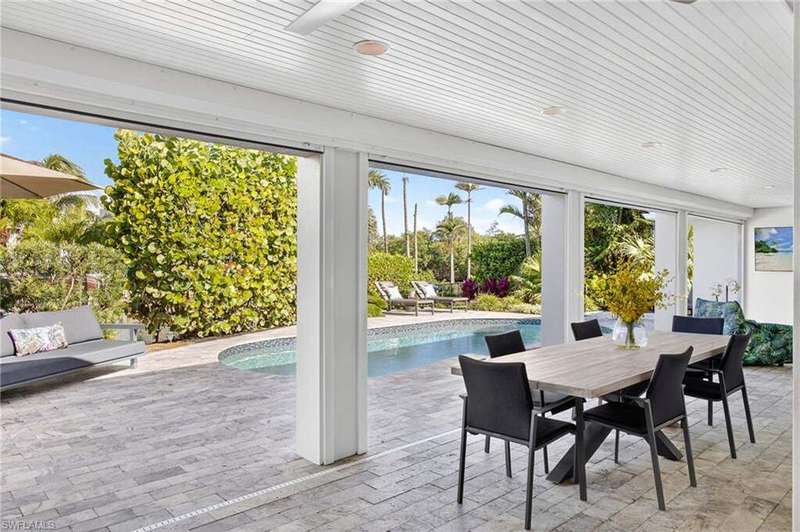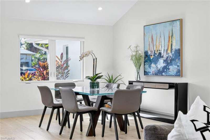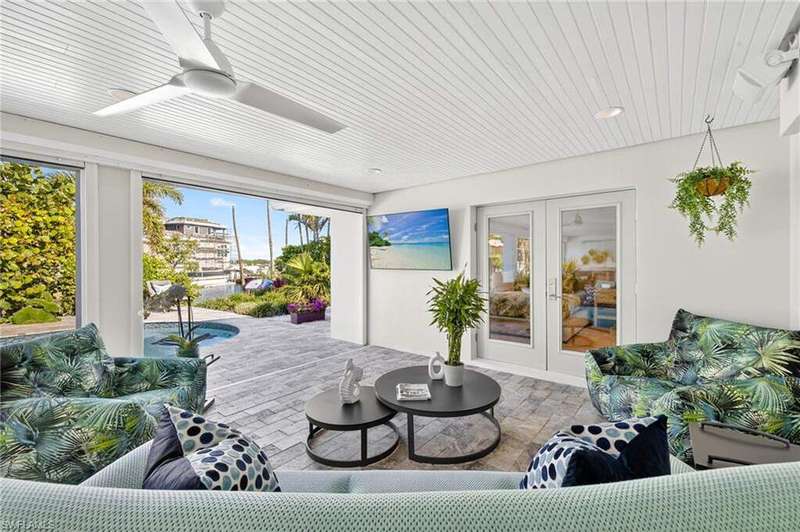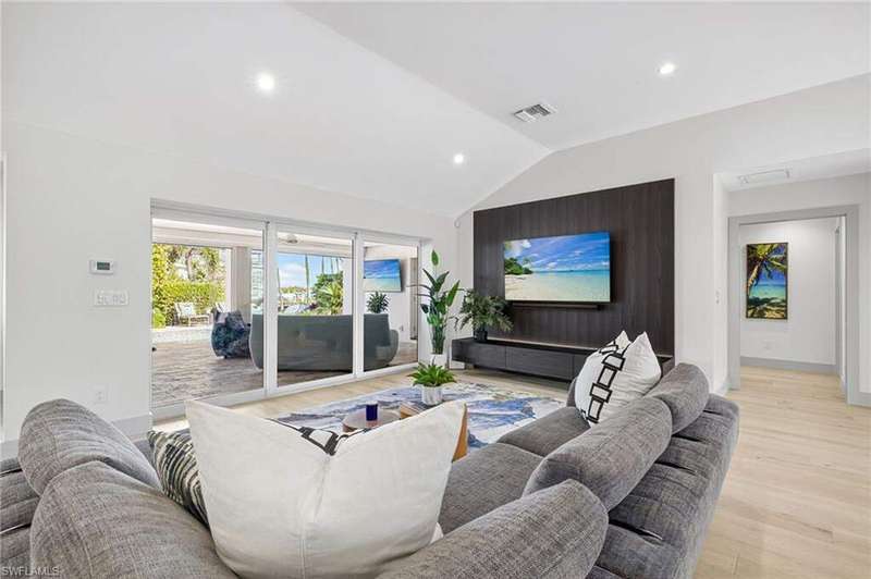 Welcome to 5215 Seashell Avenue in the highly coveted waterfront enclave of Seagate. Tucked away at the end of a quiet cul-de-sac surrounded by high-end homes is this 4 Bedroom/3 Bathroom waterfront home with 110 feet of canal frontage. This exceptional home was thoughtfully redesigned by renowned local architect, MHK Architects, and was completely renovated inside and out in 2023. This home boasts a light and airy mid-century contemporary flair inspired by California ranch-style architecture. Enter into an open-concept living space with spacious living room replete with vaulted ceilings, wide plank light oak hardwood floors and dramatic contemporary accent wall. Wall of glass opens to the rear outdoor space seamlessly blending indoor/outdoor living. A true chef's eat-in kitchen features sleek European-style flat panel cabinetry, oversized island with waterfall edges, stainless steel appliances, bar area plus lovely dining room ideal for entertaining. Master suite oasis with spacious bedroom with contemporary accent wall, walk-in closet with custom built-ins and a spa-like en-suite bath with custom double vanity, step-in shower, freestanding soaking tub and separate water closet. Split floor plan with 2 additional guest bedrooms with full baths plus a 4th bedroom currently set up as an office/media room. Convenient laundry room with great storage. 2-car attached garage with epoxy floor. Outdoor resort-style private oasis with covered living and dining area, TV, gorgeous pool and spa plus a canal front patio with firepit. A boater's dream with direct water access and a floating dock. Optional Seagate Beach Club membership offers private beachfront access. Truly exceptional and a great value for this highly desirable neighborhood. Easy access to schools, Waterside Shops, downtown Naples, I-75 as well as Naples and Fort Myers airports.