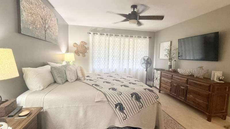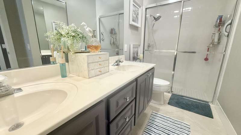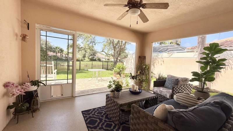 Welcome to this beautifully maintained 2 bedroom, 2 bathroom Capri model villa offering a serene lake view and thoughtful upgrades throughout. The home boasts an open floor plan with vaulted ceilings in the great room, a built-in entertainment center, and 18 ceramic tile flooring throughout.The renovated kitchen features stainless steel appliances, abundant storage, and modern finishes. Enjoy outdoor living with a screened lanai enhanced by panoramic screening, a paved deck, and a fenced garden with lush landscaping.The spacious principal suite includes a large walk-in closet and a bath with dual sinks and a walk-in shower. The guest suite, positioned for privacy on the opposite side of the home, also offers a private bath and walk-in closet.
