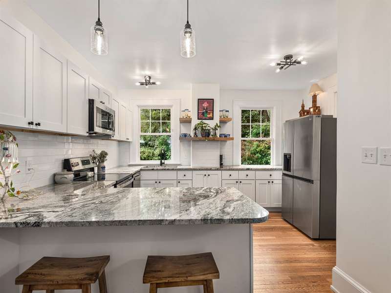 Located in desirable Lucerne Park in West Asheville, this classic 1920s Arts & Crafts bungalow blends timeless character with modern updates and versatile living options. The main home offers five spacious bedrooms, two fully renovated bathrooms, original hardwood floors, and an updated kitchen designed for today's lifestyle, plus a full basement with ample storage or expansion potential. A separate apartment above the two-car garage adds flexibility with a full kitchen, updated bath, bedroom, and living room?ideal for guests, multigenerational living, or rental income. The garage level includes a laundry area that can easily convert to a workshop or studio. Both the main house and guest suite feature new roofs and updated heating and cooling systems. Just steps from West Asheville's vibrant dining, grocery, nightlife, and shopping, and minutes from downtown, this property offers historic charm, modern convenience, and exceptional possibilities.