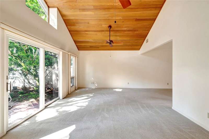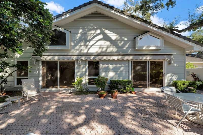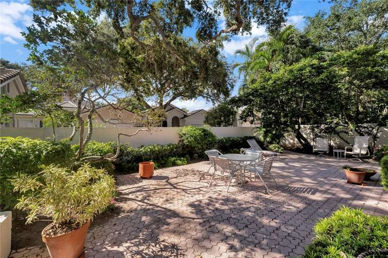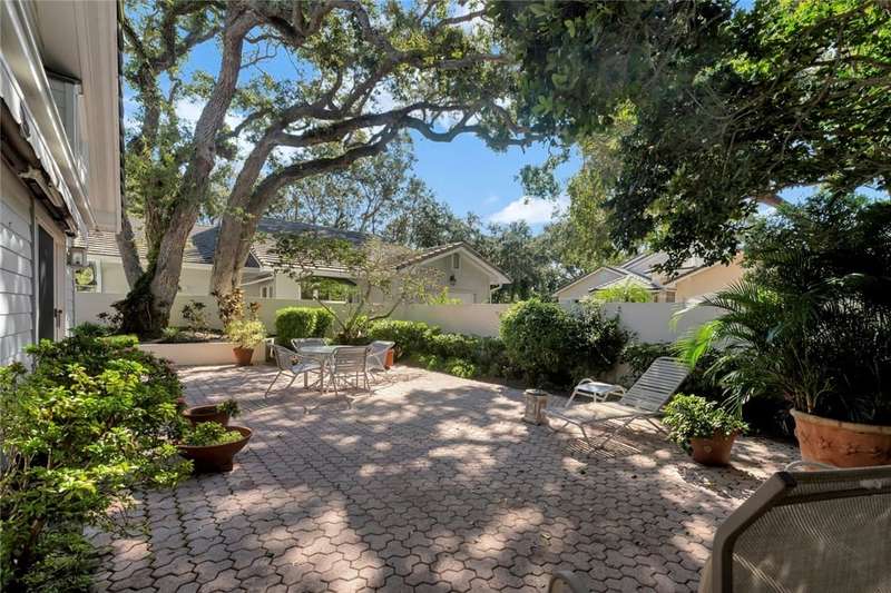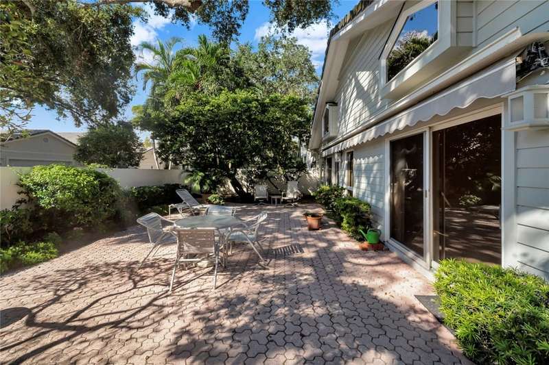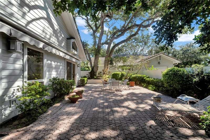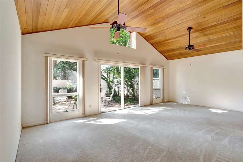 Attractive & unique construction w/soaring tongue & groove wood ceilings. Walls of glass open home to private walled courtyard & garden with sunny south exposure. Surrounded by Oaks. 2BRs, 2.5 BAs + den. Spacious 1st floor primary suite. Inside laundry. 1 car garage. Community pool. Brick paver community streets add charm. Close to Central Beach restaurants, shops, Vero Beach Museum of Art, Riverside Theatre & all of Veros festivals & shows. 1 mile to public life guarded beach. Low HOA fee $475. Lives like a house far below cost of barrier island sgl fam home. Sizes are approx/subj to error.