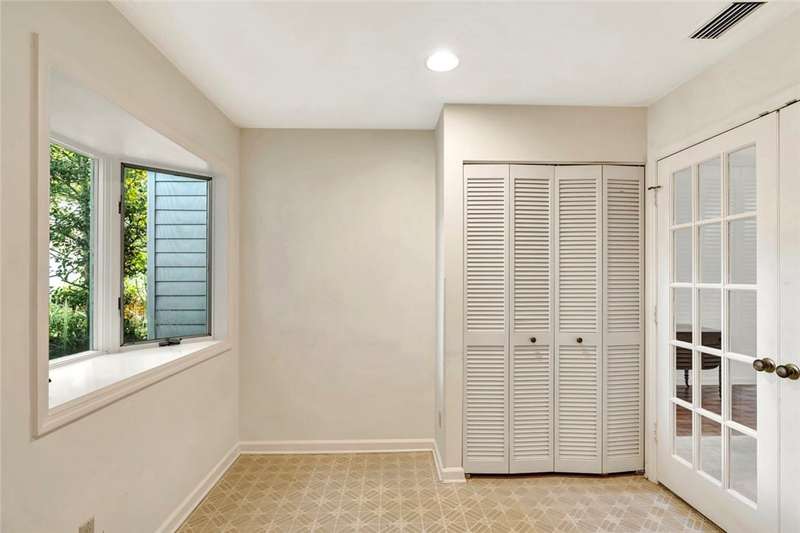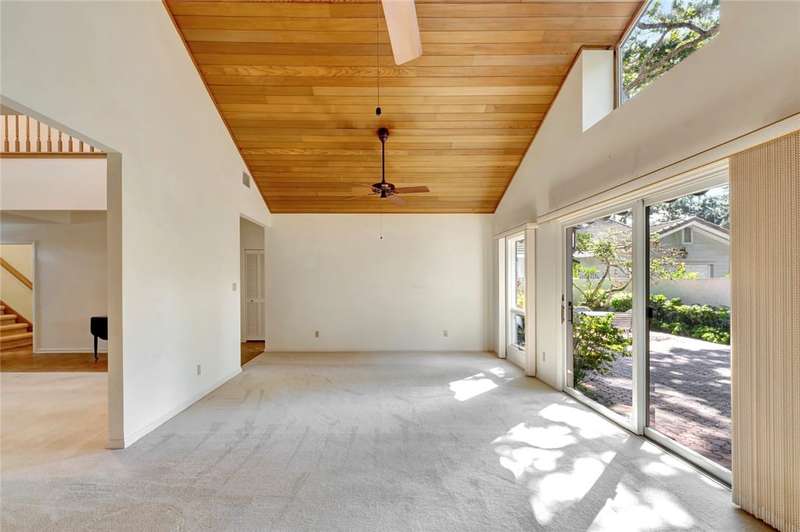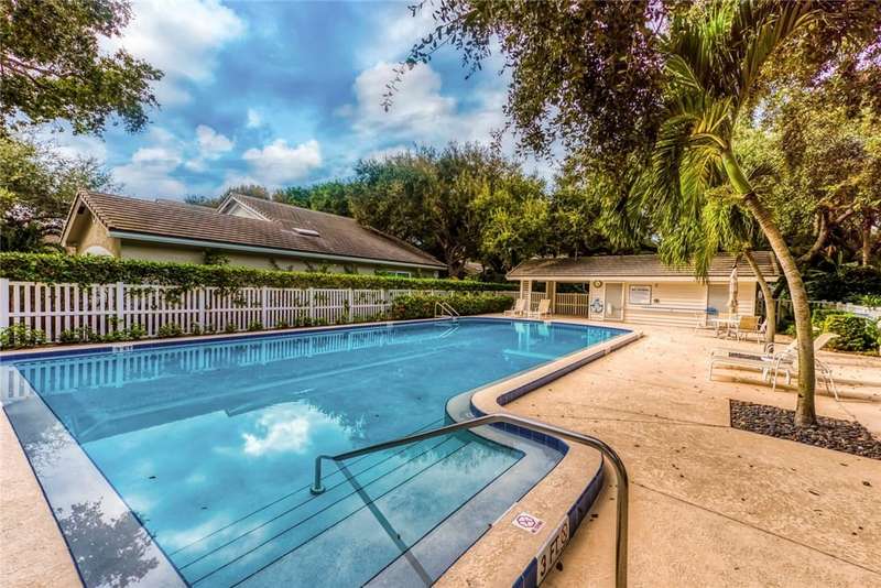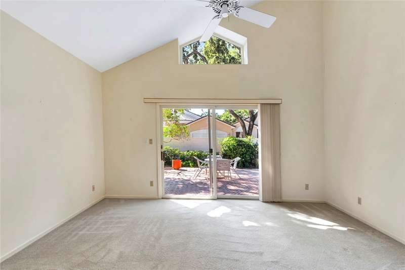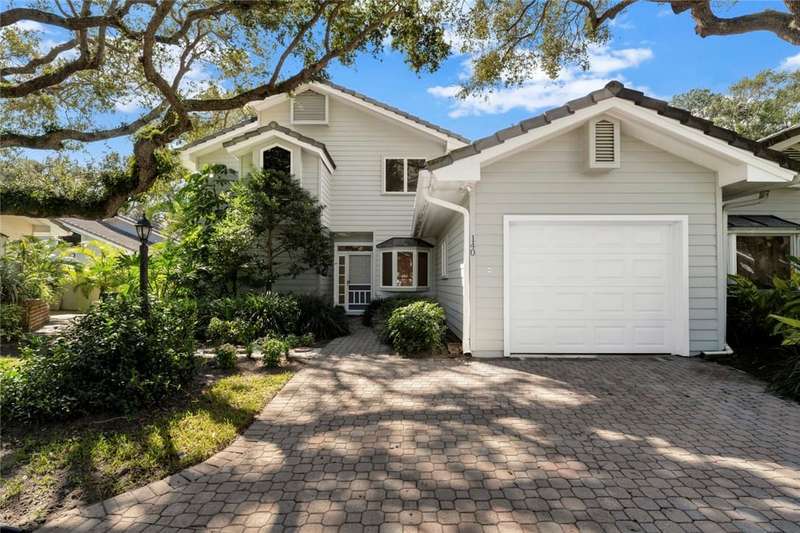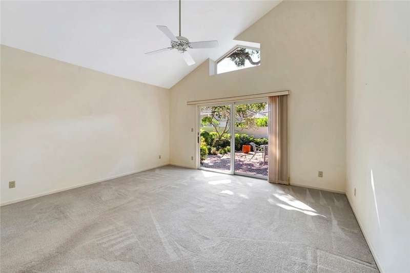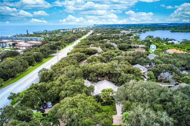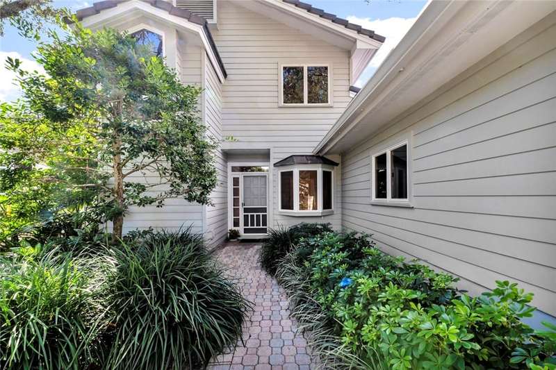 Attractive & unique construction w/soaring tongue & groove wood ceilings. Walls of glass open home to private walled courtyard & garden with sunny south exposure. Surrounded by Oaks. 2BRs, 2.5 BAs + den. Spacious 1st floor primary suite. Inside laundry. 1 car garage. Community pool. Brick paver community streets add charm. Close to Central Beach restaurants, shops, Vero Beach Museum of Art, Riverside Theatre & all of Veros festivals & shows. 1 mile to public life guarded beach. Low HOA fee $475. Lives like a house far below cost of barrier island sgl fam home. Sizes are approx/subj to error.