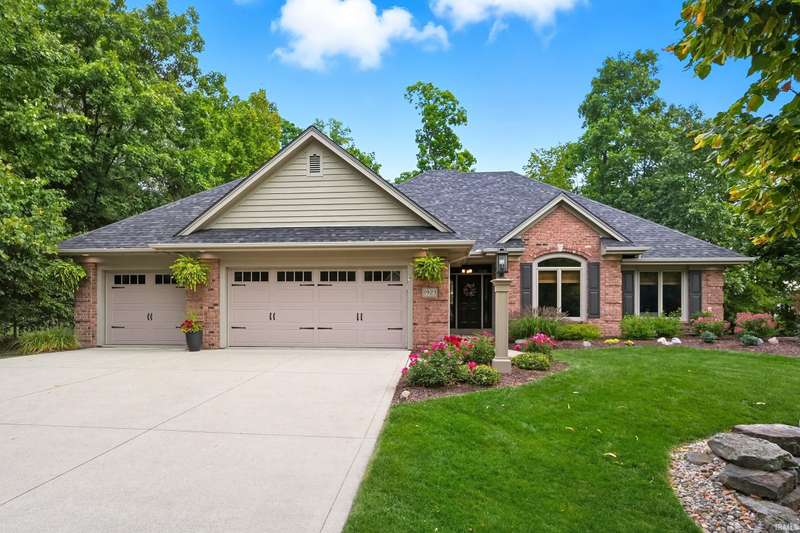 Bob Buescher Homes proudly presents a beautifully hand crafted single-story home currently under construction in the desirable Orchard Hills neighborhood, with an anticipated completion date in Early/Mid November 2025. Priced at $525,000, this residence features an open-concept split bedroom floor-plan, offering three spacious bedrooms, 2.5 bathrooms, and a dedicated office/den. As you enter the home, you will be greeted by a great room that boasts a stunning cathedral ceiling and large glass windows that provide beautiful water views and an abundance of natural light. The kitchen and dining area seamlessly flow into the great room, creating an inviting space for family gatherings and entertaining. The kitchen is an anchor piece for the home, featuring custom cabinetry designed by Zehr, crafted from white oak with a clear black glaze on the perimeter and an espresso stain on the island. The countertops are made of exquisite Midnight Corvo Quartz, enhancing the overall aesthetic. The expansive kitchen island measures 8x3 feet and is complemented by a large walk-in pantry for added convenience. The primary bedroom is generously sized, offering a tranquil retreat. The primary bathroom features a stunning double vanity with cultured marble tops in a classic white-on-white design. Additionally, a custom-designed zero-curb entry tile shower adds a touch of luxury. The primary closet is an impressive 12 feet deep, providing ample storage space. Additional highlights of this home include a beautifully designed fireplace, luxury vinyl plank (LVP) flooring in the foyer, great room, kitchen, dining area, laundry, pantry, and all walkways, with cozy carpeting in the bedrooms and office. Just off the dining area, an 8x8 sliding glass door opens to a covered porch, perfect for relaxing and enjoying the picturesque scenery. Located in Orchard Hills, this home offers convenient access to shopping, dining, and I-469, making it an ideal choice for modern living. Don't miss the opportunity to make this stunning new home yours!
