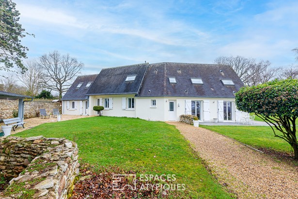 The property opens onto a large hall serving on the right: A large kitchen with natural flooring of almost 30 sqm. The contemporary kitchen was recently redesigned by a kitchen designer recognized in the region presenting his creations in a showroom in a nearby village (Le Perchay). Continuing from the kitchen, the property offers a large master suite with a beautiful shower room also recently redesigned. The three bathrooms of the house benefit from very clean lines.