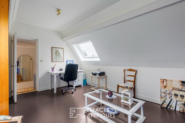 To the right of the entrance, the living room of more than 40 sqm impresses in several ways: Omnipresent light thanks to the numerous openings (double glazing), natural flooring, reminiscent of 19th century constructions, a permanent view of nature and a huge open fireplace. After these beautiful discoveries and unequivocal functionality, the upper floor reveals two other very beautiful rooms which have the common point of being able to admire nature enveloped by the first rays of the sun when you wake up. In addition to these first three bedrooms, a flight of three steps leads to a large space of 21 sqm with a shower room and a fourth bedroom of almost 14 sqm.