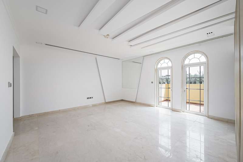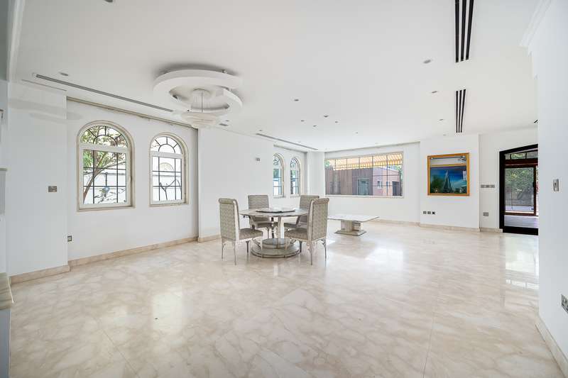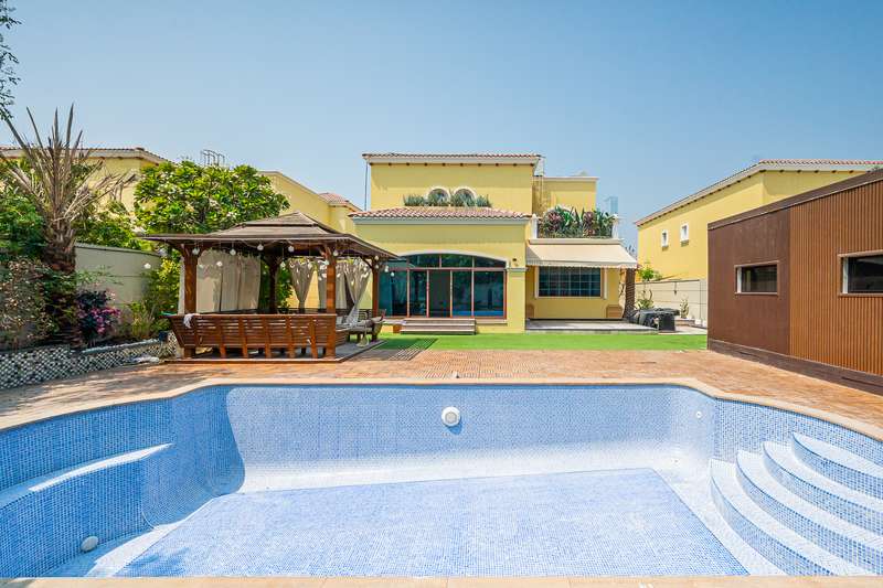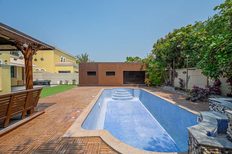 This fully upgraded 4-bedroom Legacy villa in Jumeirah Park District 3 offers a rare blend of style, comfort, and wellness-focused living. The layout includes one ensuite bedroom on the ground floor—ideal for guests or extended family—and three spacious bedrooms upstairs, complemented by a large family room. A maid’s room adds further practicality for family living. The interiors have been stylishly enhanced, including a modern kitchen with a central island, creating the perfect hub for entertaining and family meals. Outside, the landscaped garden features a private pool with a striking horse-head fountain as its centerpiece. A purpose-built poolside structure houses indoor and outdoor showers, a sauna, and an ice bath—all overlooking the pool—providing a true spa-like retreat at home. Designed for modern family life, this villa combines luxury and functionality in one of Jumeirah Park’s most desirable districts.