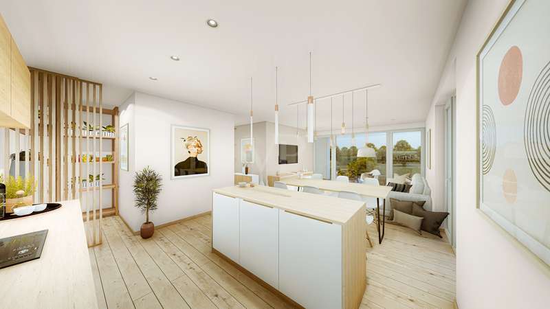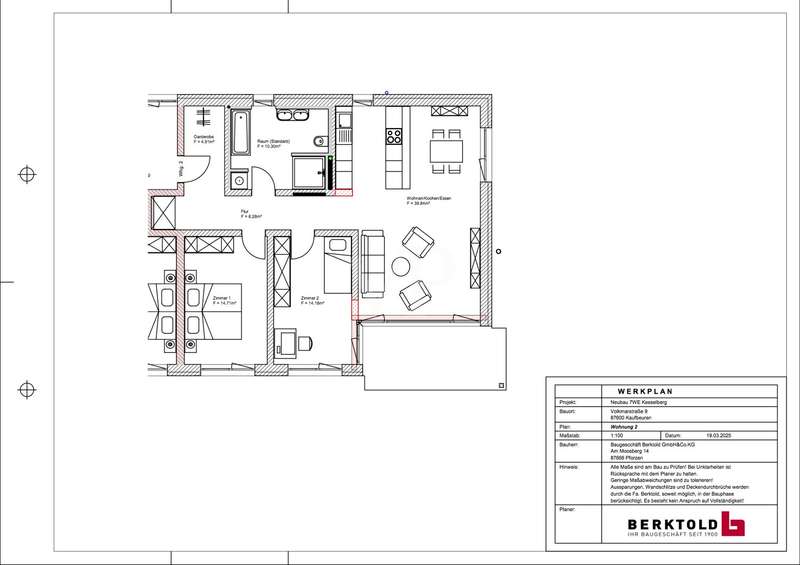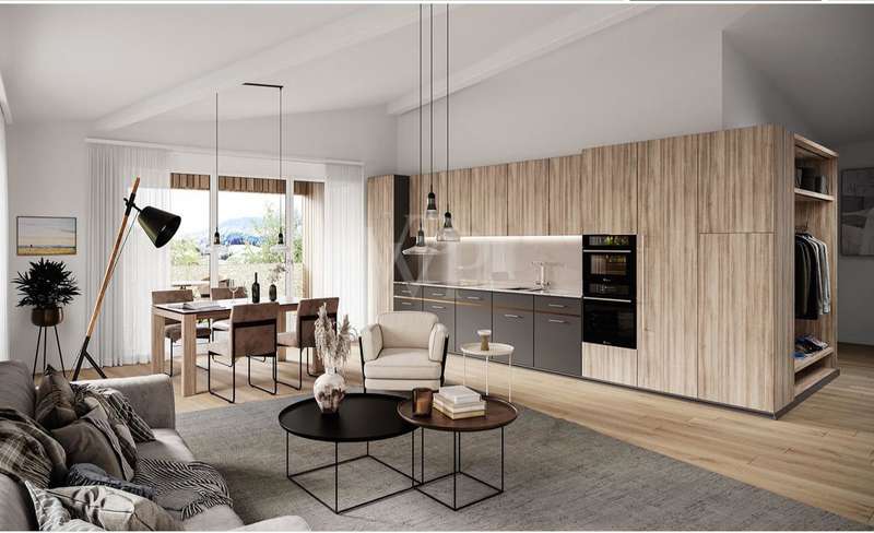We offer you an exclusive, aesthetic 3 room ground floor apartment in a prime location in Kaufbeuren with terrace and 2 underground parking spaces. The apartment is on the first floor. Consisting of 2 bedrooms, a spacious living - dining area with direct access to the terrace, a bathroom and checkroom area. The high-quality construction and furnishings should be emphasized. The high energy standard and thus the very low heating costs characterize this property. The building is heated by an air-to-water heat pump and the peak load is covered by a gas boiler. All living spaces are heated by underfloor heating. The modern bathroom is equipped with an acrylic shower channel, porcelain washbasins, WC, towel rail, bath towel holder, paper roll holder, mirror and washing machine connections. In addition to the apartment price, two underground parking spaces are offered for € 25,000 each. Here you have the chance to realize your dream home in a top location. Completion of the apartment is planned for the end of 2025. If you are interested, we look forward to hearing from you. The illustrations are non-binding. Further apartments are available.