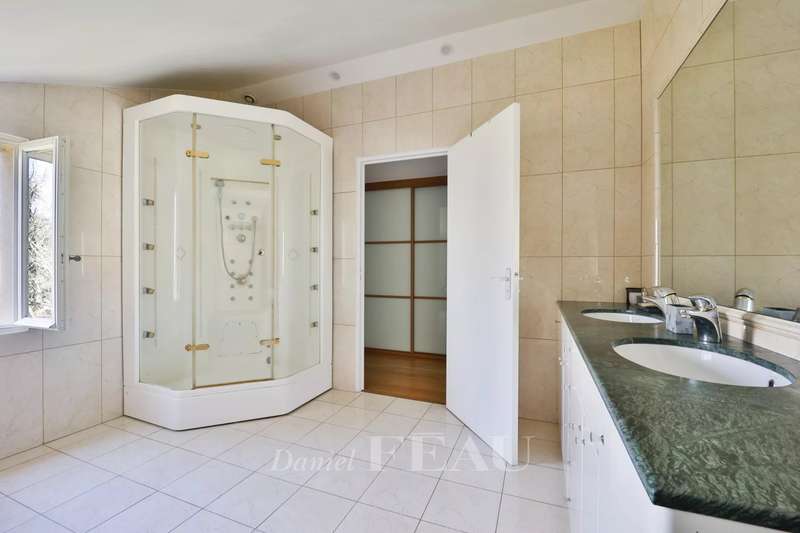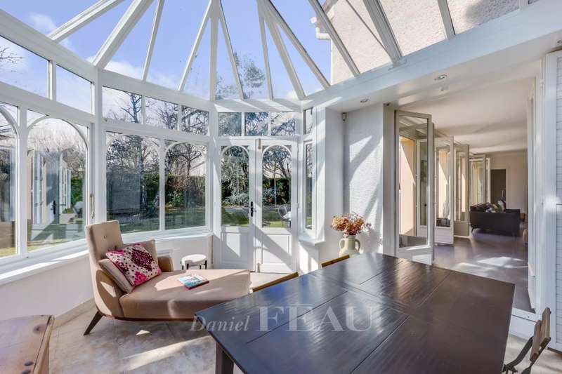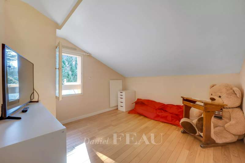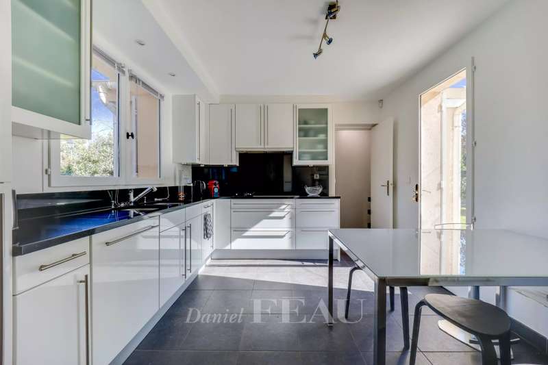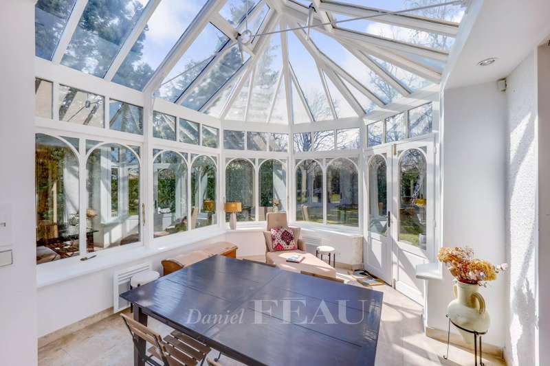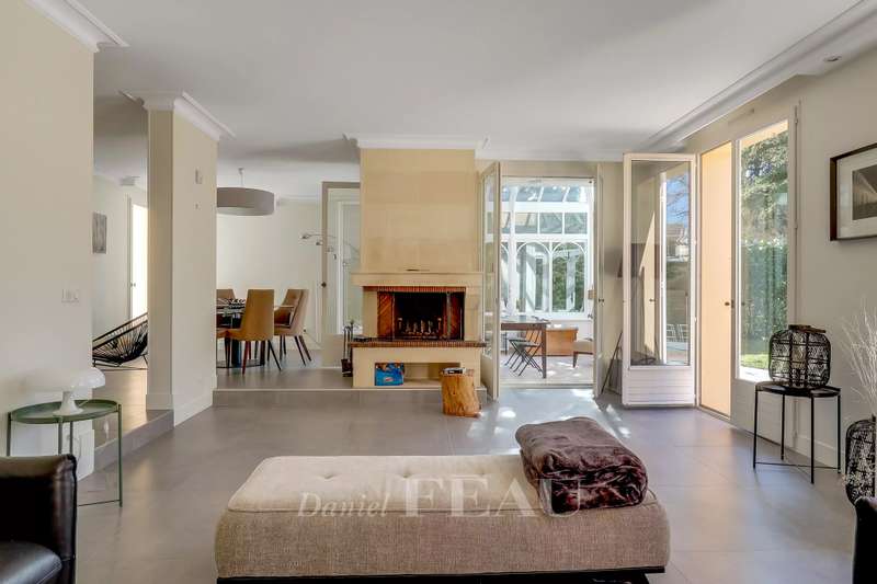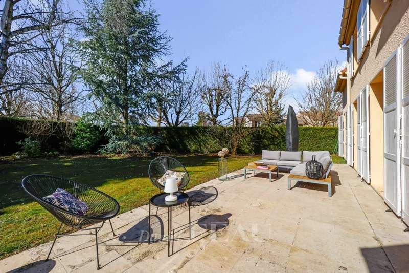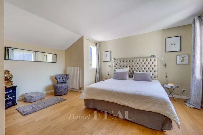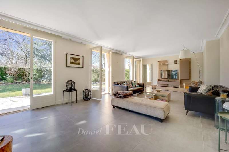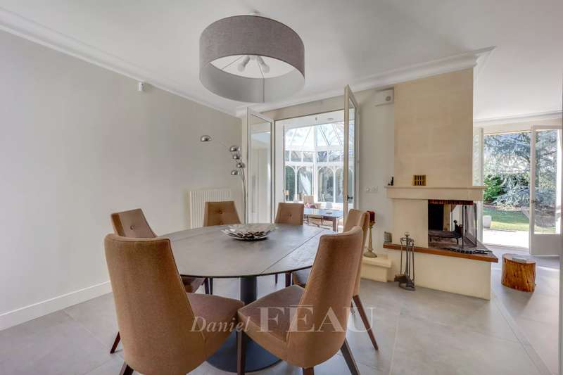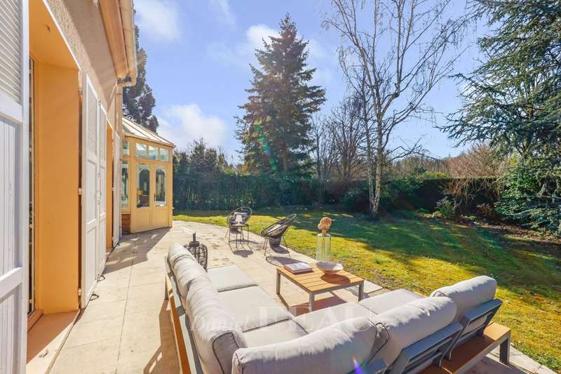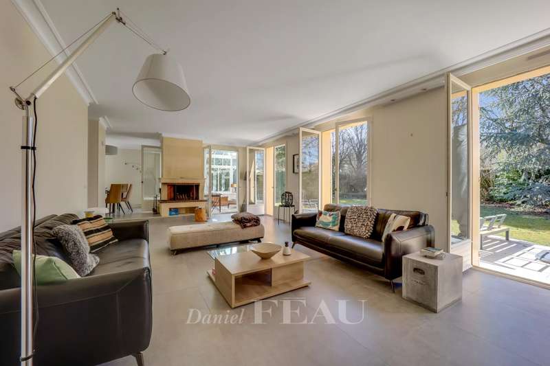 This recently renovated contemporary property dating from the mid 1980s is set at the bottom of a peaceful cul-d-sac in the Plains Champs residence near Marly-le-Roi and Saint-Germain-en-Laye. Set in a sunny and leafy 1180 sqm garden (a swimming pool would be possible), it includes an entry with a fitted closet, a bright and spacious living/reception room with a fireplace opening onto a conservatory, a dining room, a study, an equipped kitchen with a pantry, a utility room and a guest wc. Upstairs are three bedrooms with fitted closets, a master suite, a shower room and a wc. The garden level comprises a 2-car garage with a large mezzanine storage area. Annual charges: 600€/annum. In a convenient location near the stations, and just next to bus lanes accessing Saint-Germain-en-Laye and Versailles. A13 and A86 motorway access. Louis de Broglie (Marly-le-Roi), Jeanne d'Albret and the International High School (Saint-Germain-en-Laye), Lycée Alain (Le Vésinet), Blanche de Castille (Le Chesnay) and Lycée Pierre Corneille (La Celle-Saint-Cloud) are all in the vicinity.