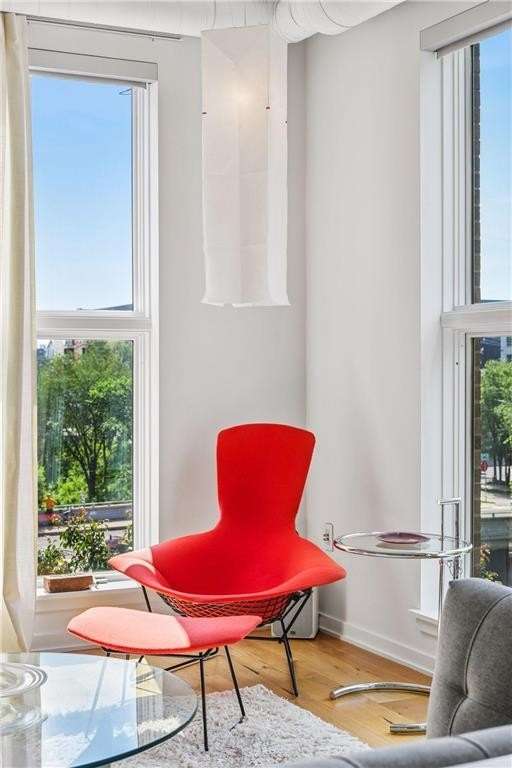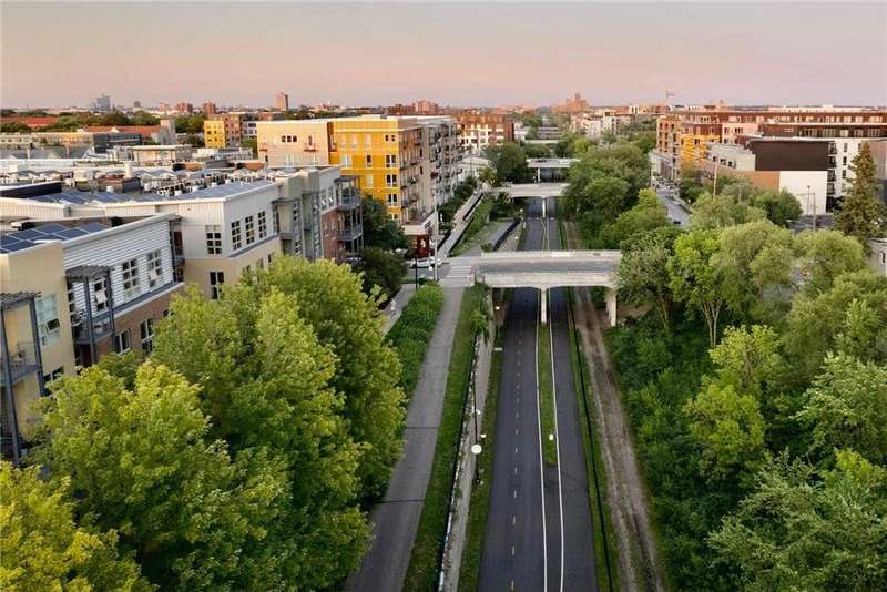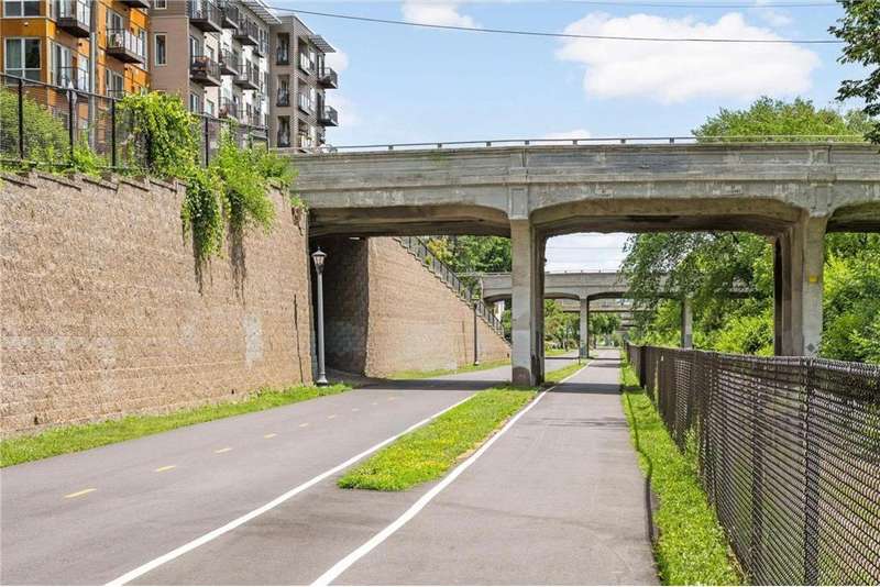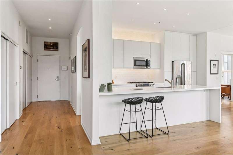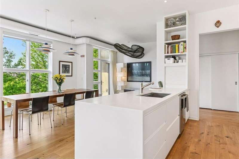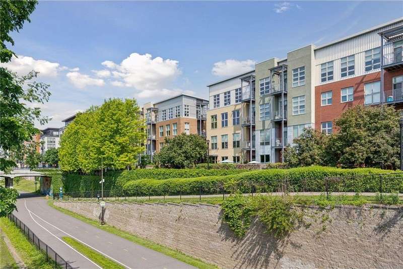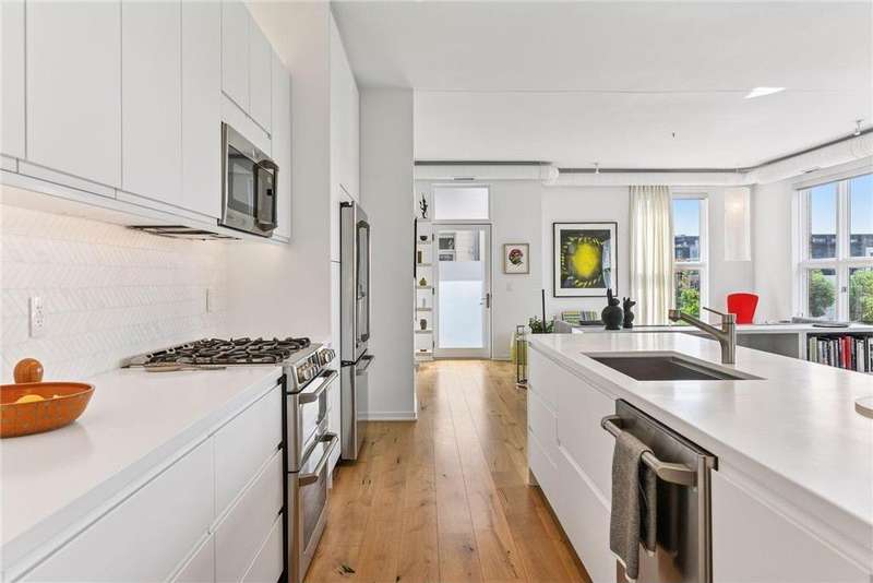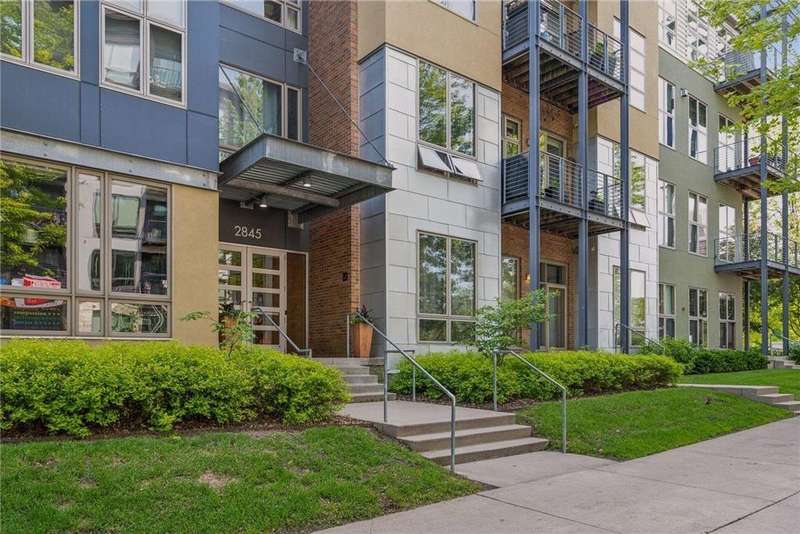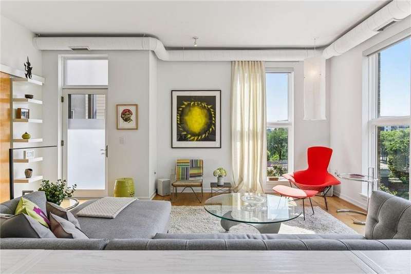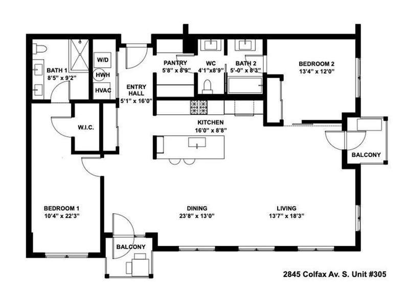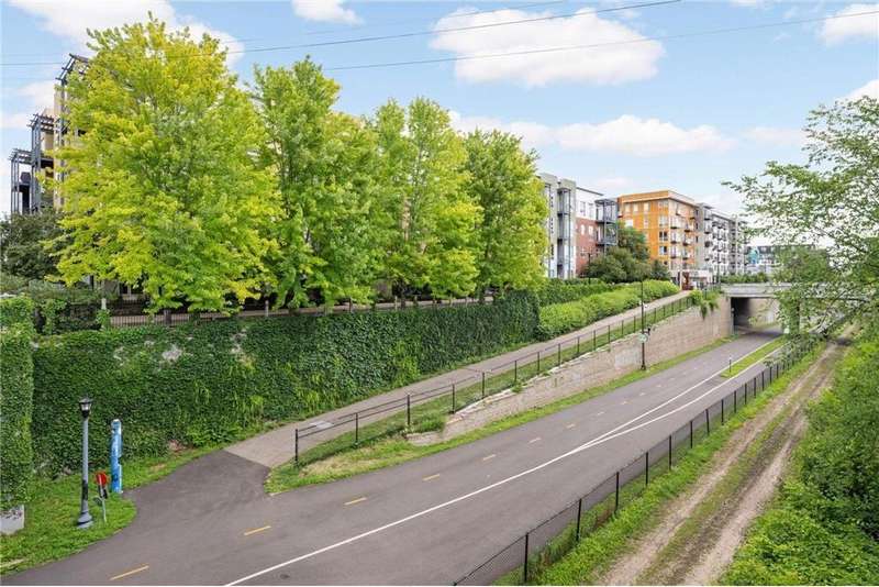 Welcome to one of the most coveted floor plans at the green-inspired Midtown Lofts — where architectural vision meets artistic expression. This sun-drenched, south-facing corner unit overlooks the Midtown Greenway and features two private balconies, including one with a gas hookup — perfect for grilling or unwinding above the treetops. Inside, a bright, open layout is anchored by soaring 10-foot ceilings and sweeping walls of oversized windows fitted with wireless shades. Updated White Oak wide-plank engineered hardwood floors add warmth and drama throughout. The architect-redesigned kitchen impresses with white cabinetry, a striking herringbone marble backsplash, sleek Corian countertops, and an oversized entertainer’s island. A stylish butler’s pantry — with additional storage and a wine fridge — adds both function and flair. Curated artistic lighting elevates the experience: a sculptural Noguchi chandelier in the living room, iconic Louis Poulsen pendants in the dining area, Philips Hue smart lighting in select spaces, and clean-lined recessed lighting added to the kitchen, entryway, and primary suite. The serene, spa-inspired primary suite features a Kohler rain shower, elegant tilework, a floating vanity with Carrara marble, and intelligent storage. The guest bath is equally refined, with designer tile, updated fixtures, chic lighting, and vanities that look straight from a Restoration Hardware showroom. Amenities include a semi-private courtyard, car wash area, dog run, and herb garden. Solar panels and zoned LED garage lighting help reduce common area energy costs, keeping dues refreshingly low while supporting sustainable living. Midtown Lofts is perched above the beloved Midtown Greenway, a scenic rails-to-trails corridor stretching from the Mississippi River to the Chain of Lakes. It’s a dream location for cyclists, runners, and nature lovers who crave easy access to the outdoors without sacrificing city living. Just steps from lively pubs, restaurants, shops, and transit — and boasting Walk and Bike Scores of 96 and 94, a Walker’s & Biker’s Paradise. Enjoy added peace of mind with a brand new furnace (2025) and a one-year home warranty included in the sale!