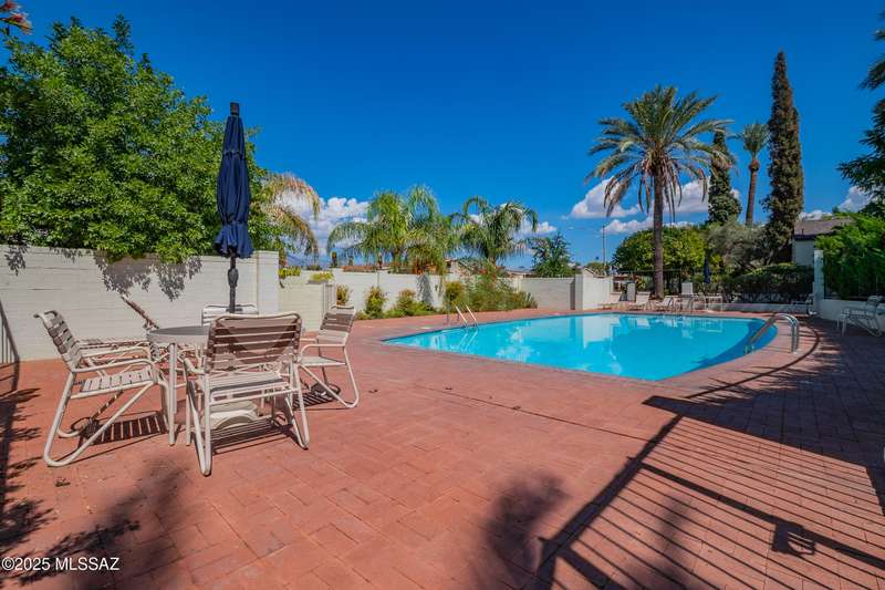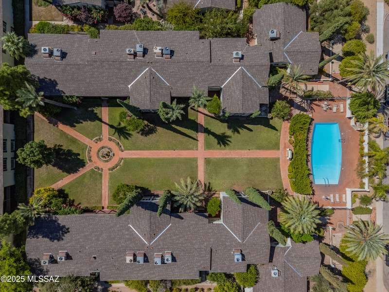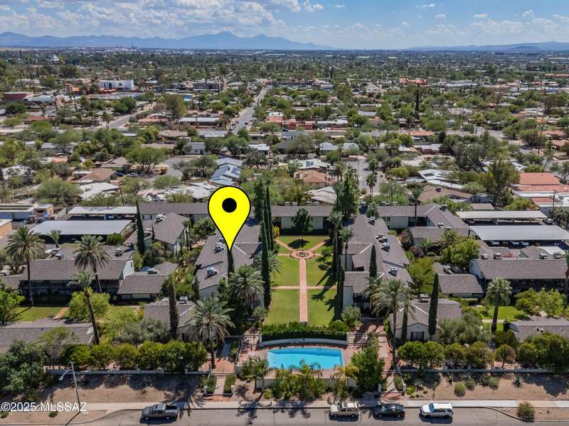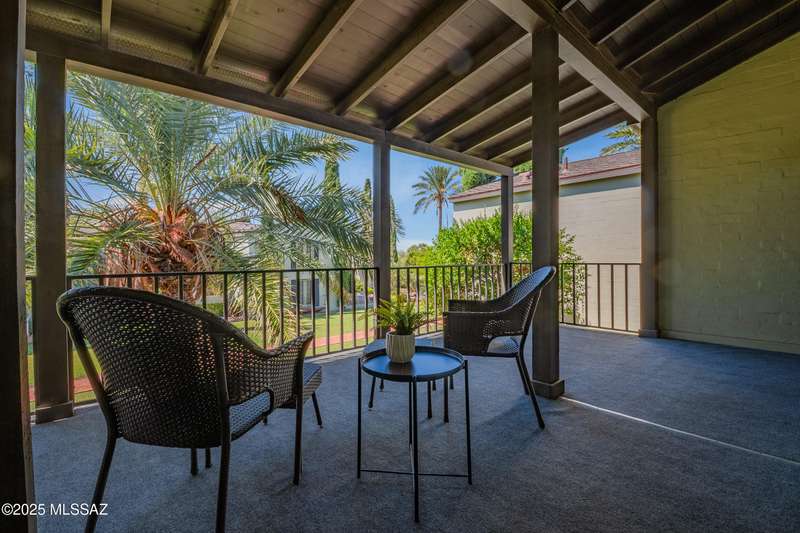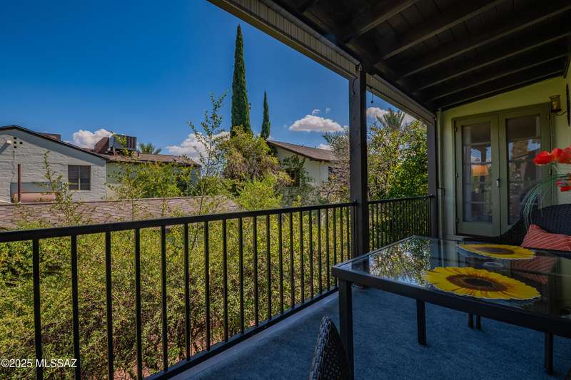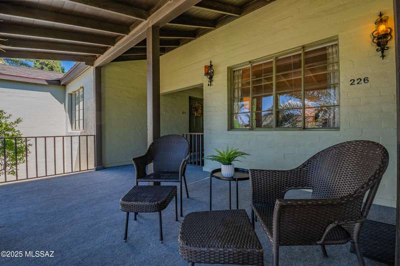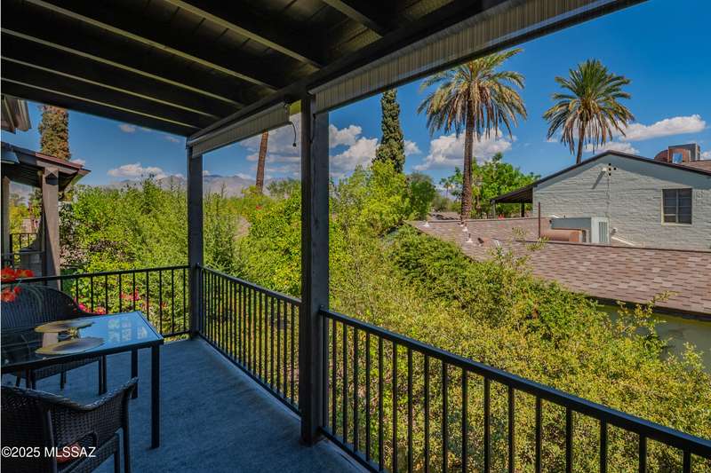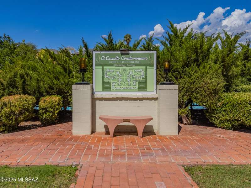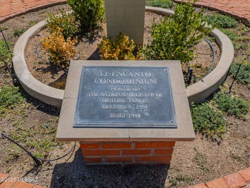 Lovely 2-bedroom condo located in Sam Hughes historic complex El Encanto Apartments. Unit oozes with character, natural lighting, and warmth, and is located on the 2nd floor with private patios offering mountain, lush landscaping and sunset views. Complex is a short commute to the University of Arizona, Banner Medical and downtown. Short walk to popular eateries. Newer flooring, roof, plumbing and patio carpet. HOA includes water, sewer, trash, roof, exterior building and landscape maintenance, termite, pool, and laundry facility. Unit has exterior storage ''12'', one covered parking place ''H'', and bike storage and rack. Low property taxes due to historical property designation.