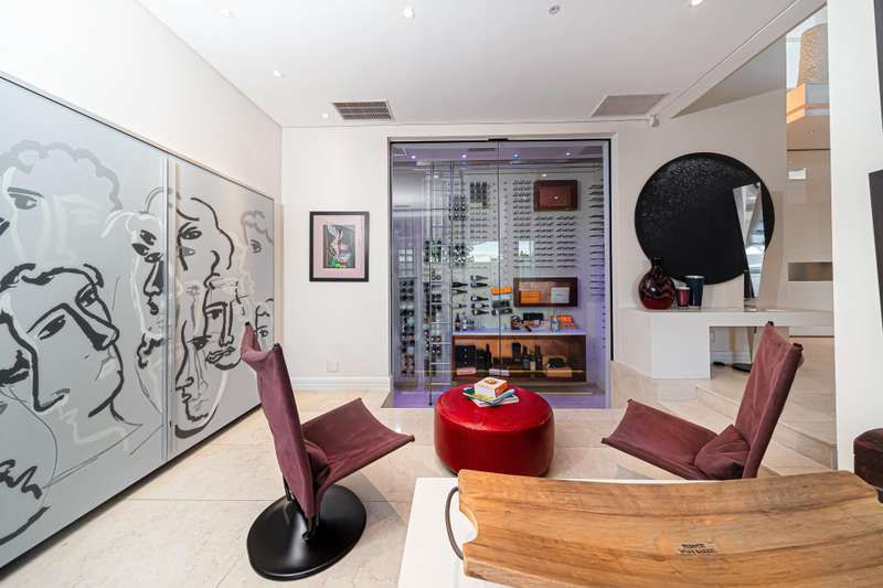 Entertain with effortless sophistication in the expansive outdoor living spaces. A pavilion braai and dining area, an elegant covered patio lounge, and a rim-flow glass-tiled pool with a dedicated shower create an idyllic setting for gatherings. A climate-controlled wine room and integrated bar, complete with premium refrigeration, elevate the art of hosting.
