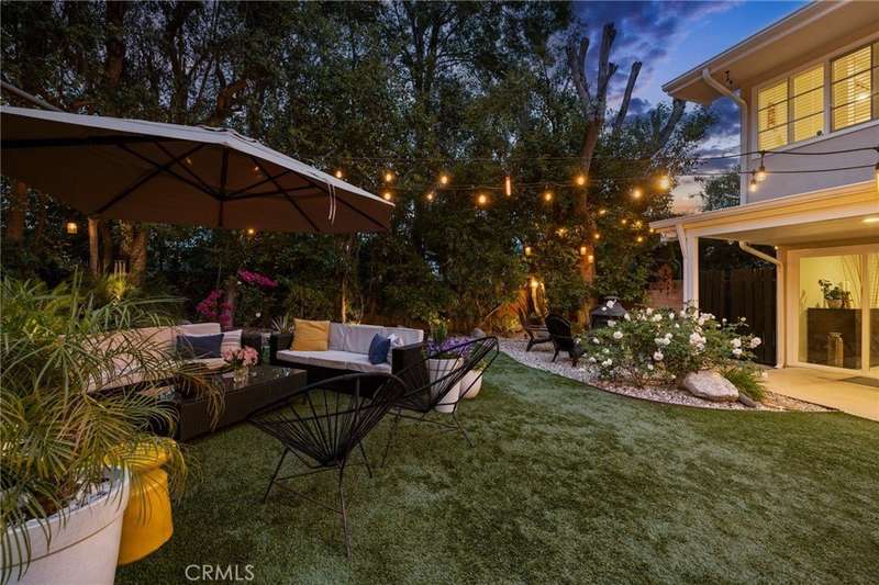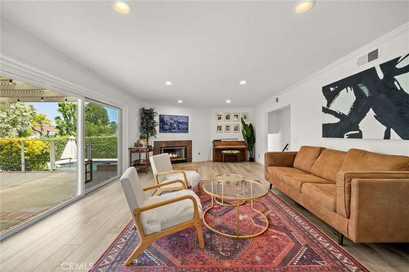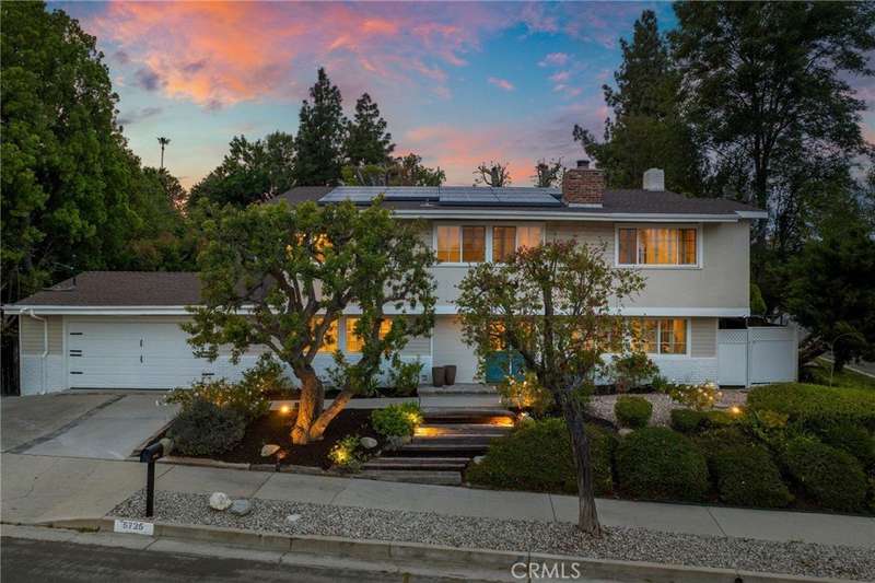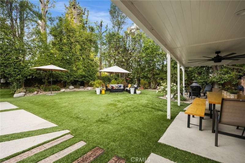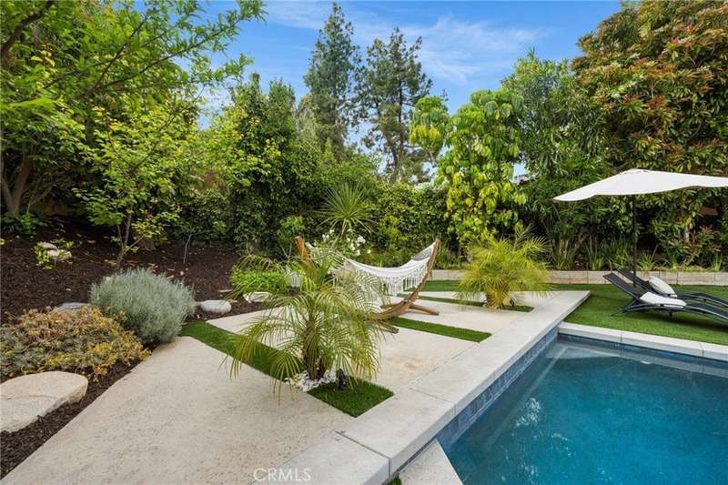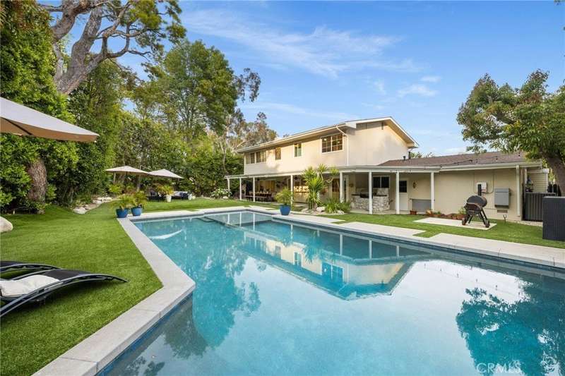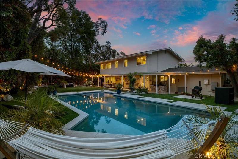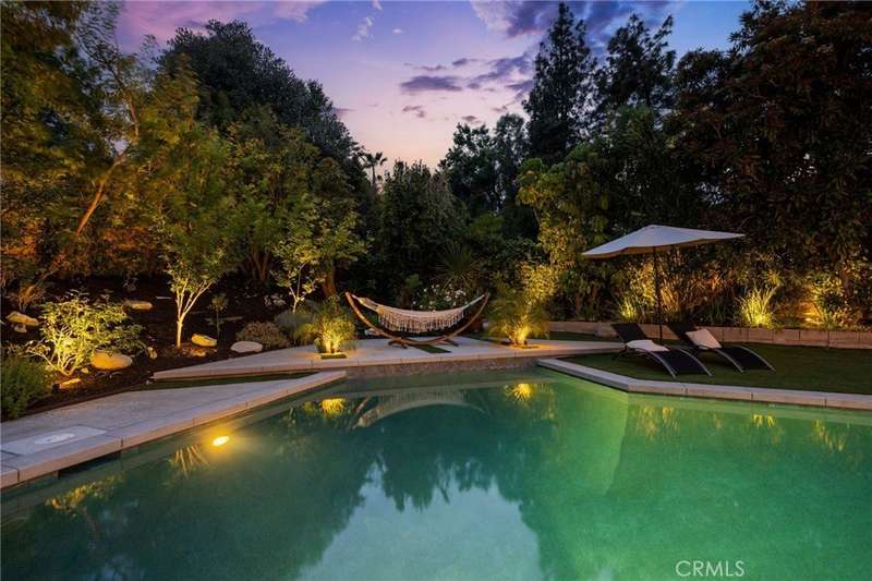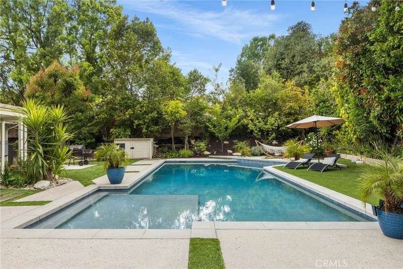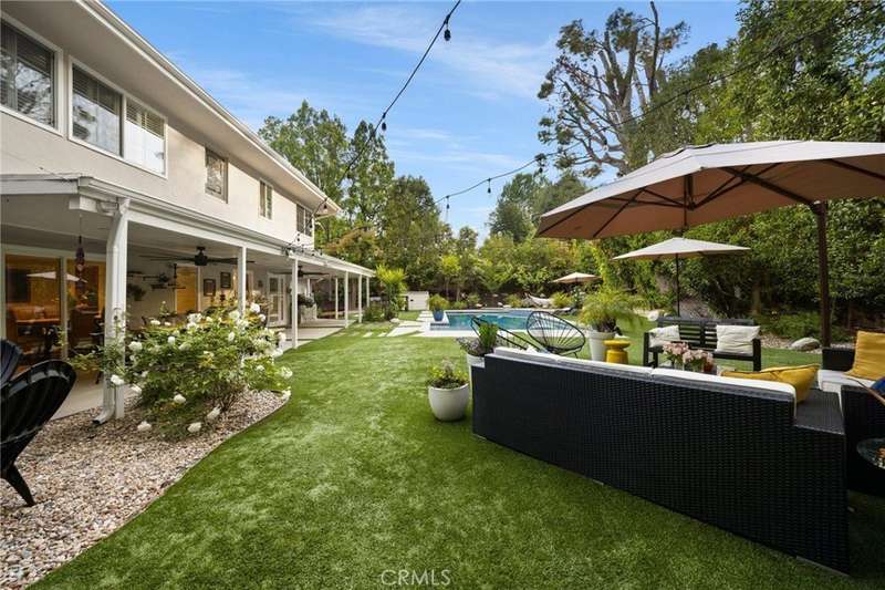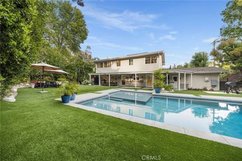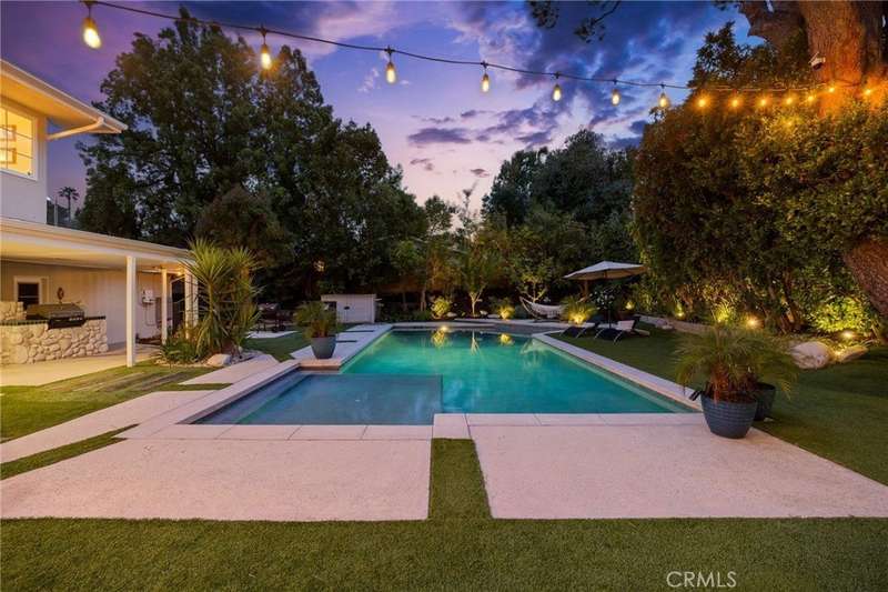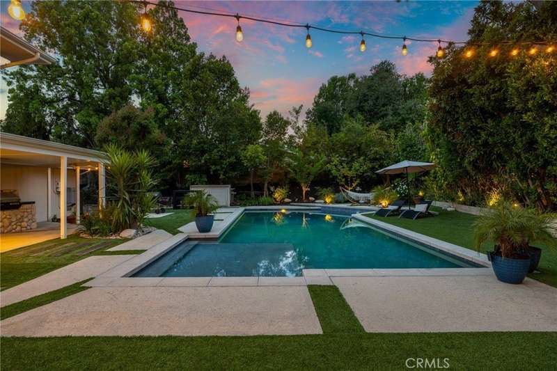 Remodeled Woodland Hills Pool Home with Amazing Backyard and Excellent Schools! Located within the highly rated and sought after El Camino Real, Hale and Lockhurst Charter Schools, this is California indoor / outdoor living at its best! Ideal for birthday parties and holiday gatherings with family and friends, this beautiful home begins with an entryway that opens into a large living room bathed in natural light and graced with an elegant fireplace. Continue into the formal dining bordered by a wall of sliding glass doors to the backyard oasis pool and gardens, a true entertainer’s delight. The cook’s kitchen offers abundant storage, updated cabinets, custom backsplash, waterfall counters, and an eating area perfect for family and guests to chat while meals are prepared. Don’t miss the over-sized family room ready for movie night or card games. The very private entertainer’s backyard beckons with a covered patio, multiple seating areas, graceful landscaping, sparkling pool (renovated and re-plastered in 2023), built in BBQ, outdoor gym area, turf with mature landscaping and fruit trees. In the evening, outdoor lighting adds magic to this breathtaking space. Recently remodeled bathrooms and oversized bedrooms complement the primary suite which offers a sitting area and fireplace – your own retreat! Double closets and vintage tile in the primary bath complete the suite with sensible charm. Newer windows, waterproof laminate flooring, LED lighting with Smart Switch, Updated HVAC and ducting, Solar with battery backup, and Security System add practical benefits to this lovely and stylish home perfect for the entire family to move right in! Come and see this fantastic opportunity to live conveniently in the West San Fernando Valley!!