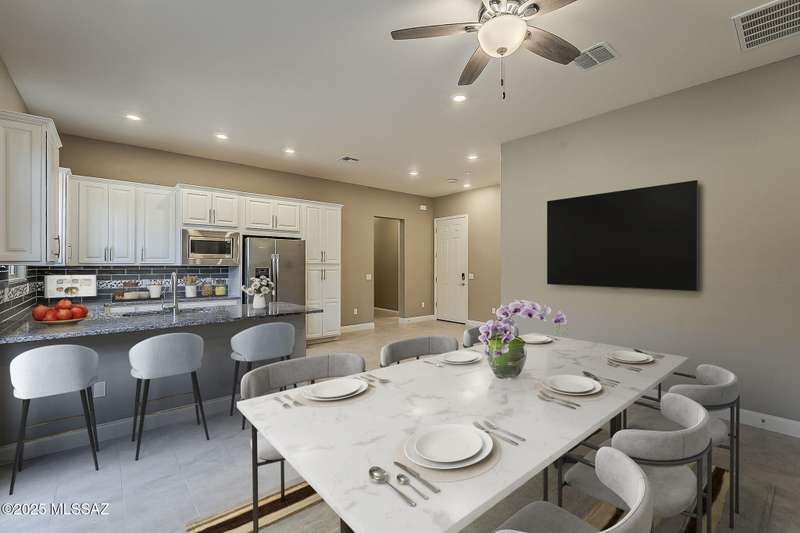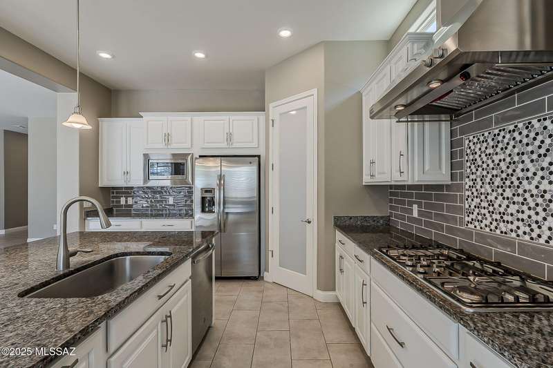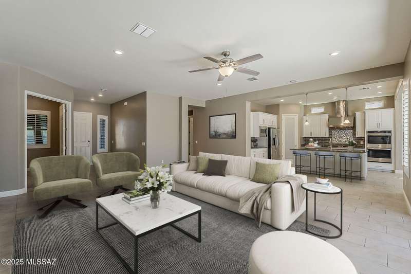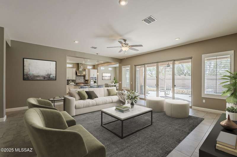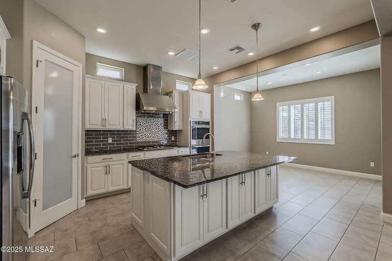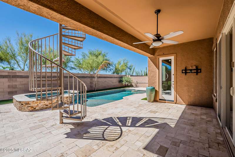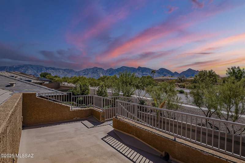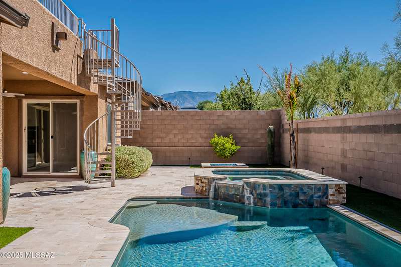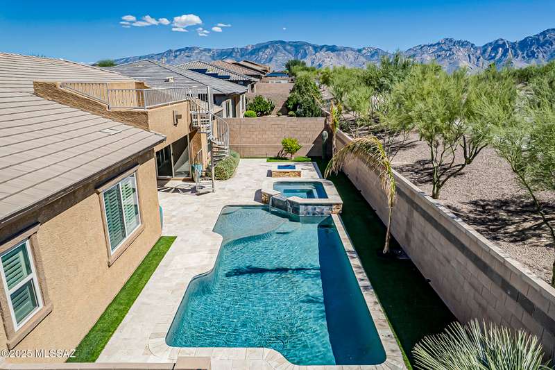 Experience modern desert living in this stunning 5-bedroom, 3.5-bath residence featuring a highly sought after ''Next Gen'' residence in Oro Valley's exclusive Eagles Summit community. Designed for luxury & versatility, the private suite features its own entrance, kitchen, bath, laundry hookups & garage--ideal for guests or multi-generational living. The main home showcases a spacious great room & gourmet kitchen w/ stainless steel appliances, large island & breakfast bar. Enjoy a heated saltwater pool & spa, gas firepit, covered patio, & spiral staircase to a rooftop deck w/ breathtaking views. Designer touches throughout, this home embodies luxury, comfort, and privacy. Smart home controls for pool, spa, A/C & doors, plus paver driveway & high-end turf complete this stunning retreat!