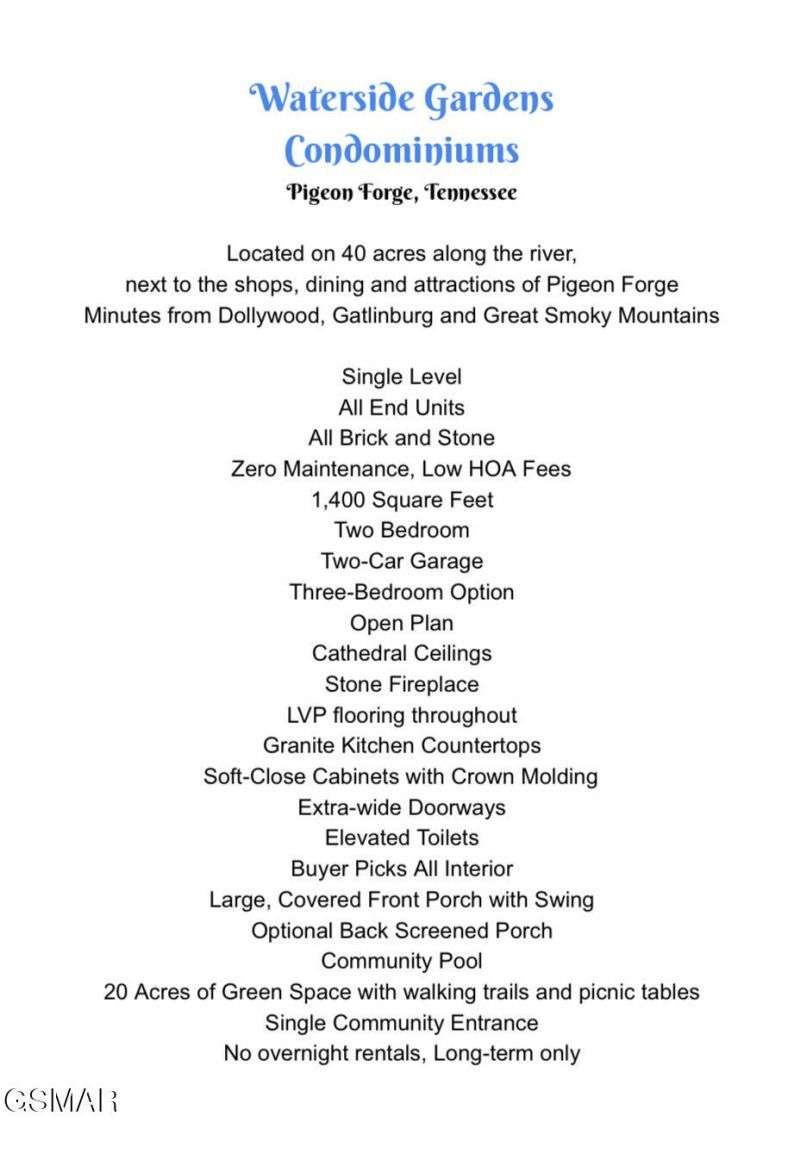 Welcome to Waterside Gardens Condominiums! It is time to begin customizing your brand-new, zero-maintenance home! Phase 4 construction is starting for these beautiful two- and three-bedroom condos located in the heart of Pigeon Forge on 47 serene acres along the Little Pigeon River, and minutes from the wonders Dollywood, Gatlinburg and the Smoky Mountains. This perimeter unit will maximize privacy, allowing you to enjoy easy living from your secluded back patio or covered front porch, while the HOA takes care of exteriors, lawns and landscaping. Featuring your choice of granite kitchen tops, soft-close cabinets, LVP flooring, living room and bedroom ceiling fans, stainless appliances, cathedral ceilings, elevated toilets and wide 36'' doors, this roomy two-bedroom condo sits in a peaceful community that allows no overnight rentals. Waterside Gardens will have a community pool by summer 2026, and 20 acres of green space with a walking trail and picnic tables for residents and their pets to enjoy. Waterside Gardens is being developed and constructed by the same team that built Riverbend Gardens and Creekside Gardens in Sevierville.