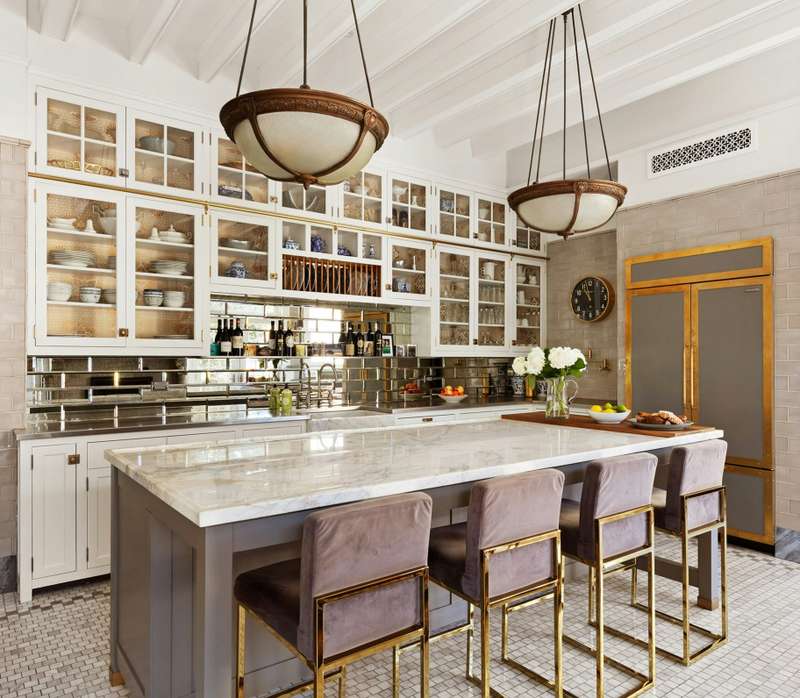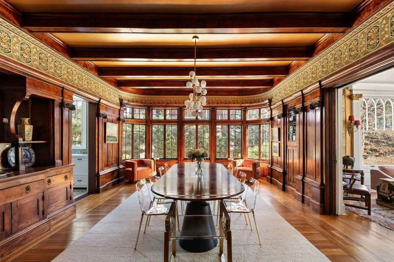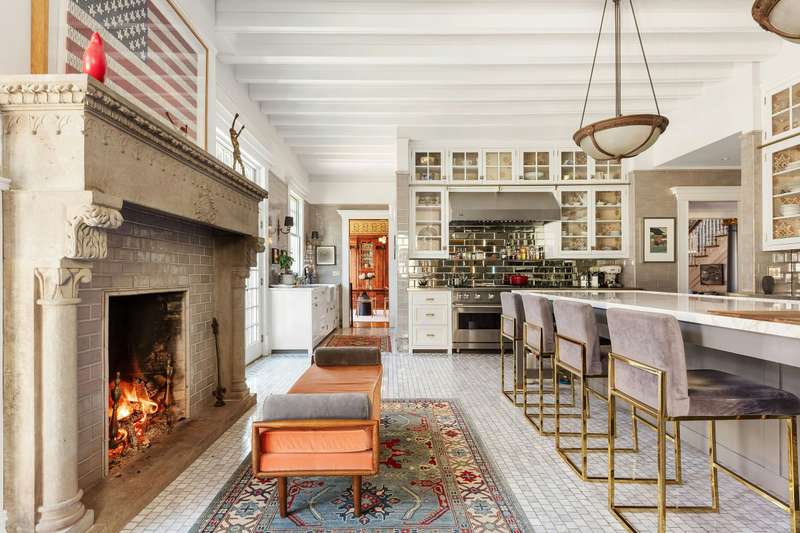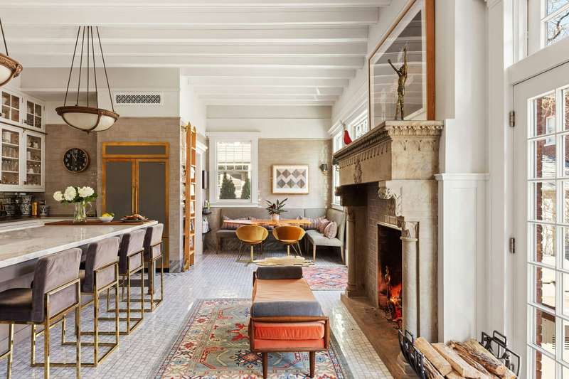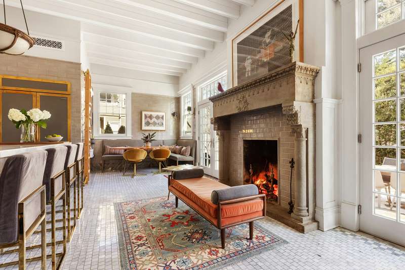 The grand hall is defined by a coffered ceiling and massive wood-burning fireplace-one of 6 gas and wood-burning fireplaces within the home-which in turn leads to a sun-drenched formal front parlor with fireplace, handsome library with fireplace and bay window, a mahogany-clad dining room facing the garden, and charming reception parlor. Four distinct moods for entertaining and peaceful repose. The kitchen is a chef's dream, with a 10-foot stone island, Viking range/double oven, Sub-Zero French door refrigerator, three Fisher & Paykel dish drawers, Carrara marble farm sink, and a wood-burning fireplace for chilly winter mornings. There is a separate windowed laundry room and a walk-in custom pantry. French doors open to a bluestone patio and expansive backyard with mature plantings-bringing the outside in at all times of year. An elegant and discreet powder room completes the main floor.
