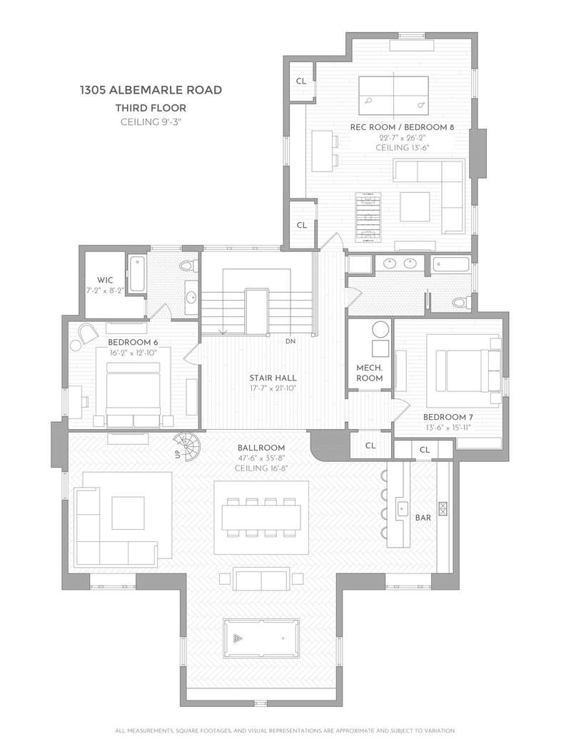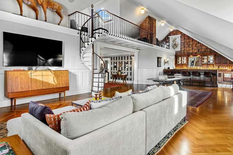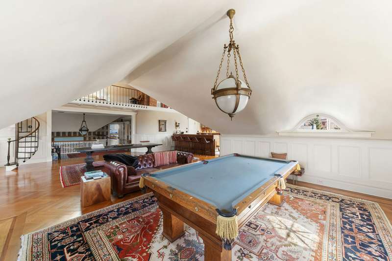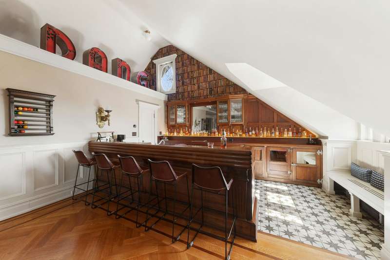 Upstairs is the former ballroom with over 16-foot-high ceilings, where in 1908 George E. and Sarah Gale hosted more than 300 guests for live musical performances and grand revelry. For today's lifestyle, the upper level houses generous guest suites, lounges, a media room, home workspace, and the ideal environs for casual family fun with friends. The ballroom has been opened up to the attic to create a soaring ceiling and designed with a vintage bar that stretches along one wall for decadent home entertainment. You're transported to a London speakeasy-a magnificent place to share with friends. A spiral staircase leads up to a mezzanine. This floor is supported by three more bedrooms, a recreation room, mechanical room, and walk-in closet. A charming attic space features a sunlit reading loft overlooking the levels below-ideal for a home office, art studio, or snug. There are two full bathrooms on the third floor for guest use.