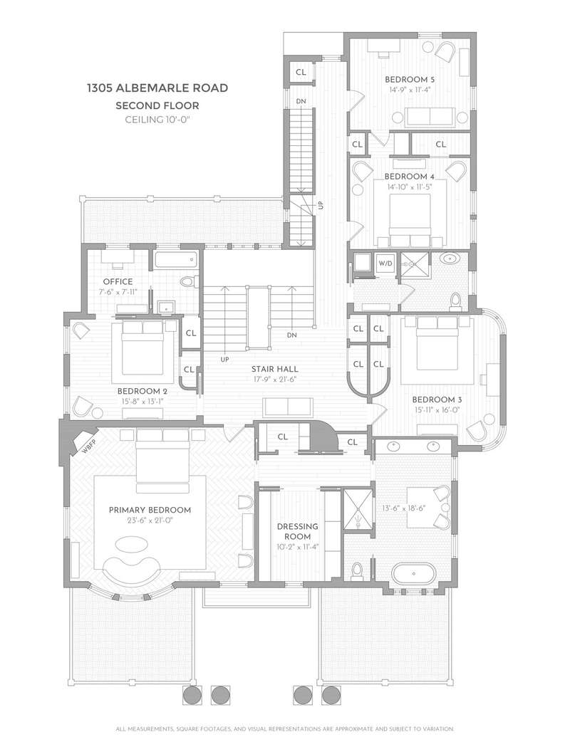 The second floor is the private domain and contains the sumptuous primary suite with a windowed dressing room and a luxurious en-suite bath. Four additional bedrooms, two full baths, and a spacious home office complete the second level.