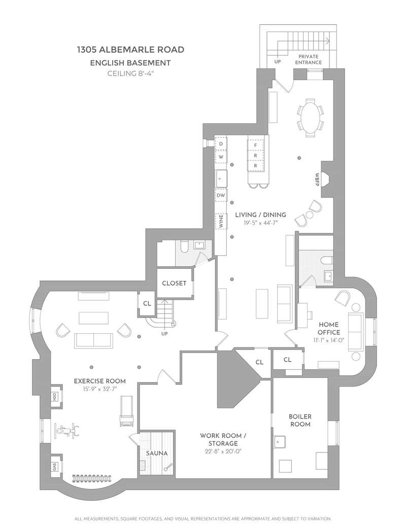 With a private exterior entrance and high beamed ceilings, the English basement includes a 44-foot lounge with kitchenette, as well as a large gymnasium, sauna, and a large work/storage room.