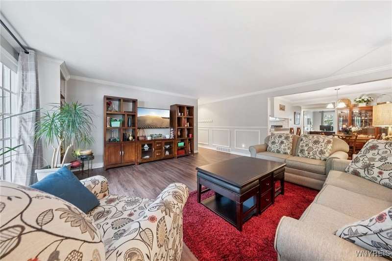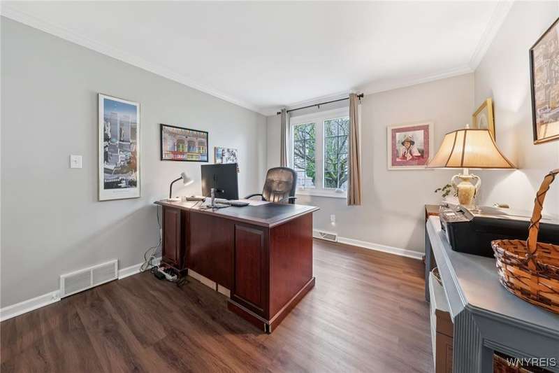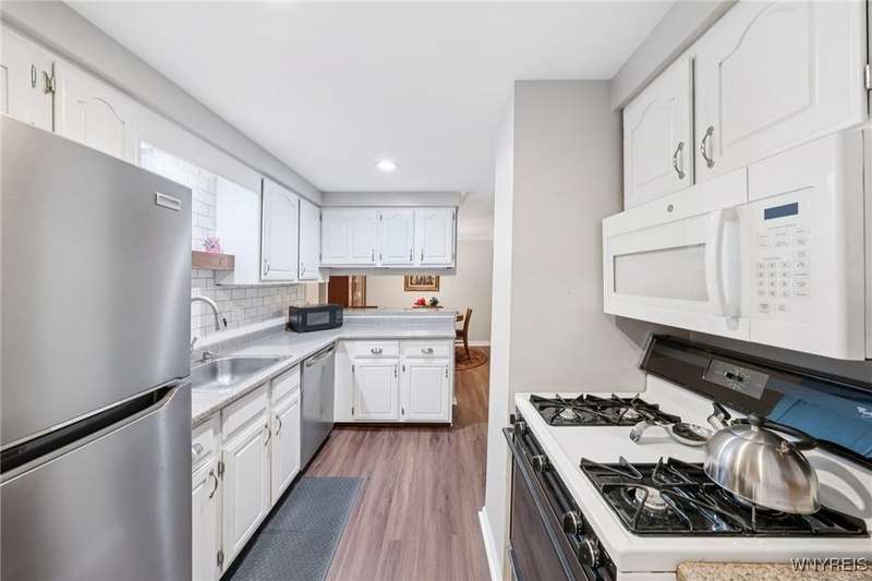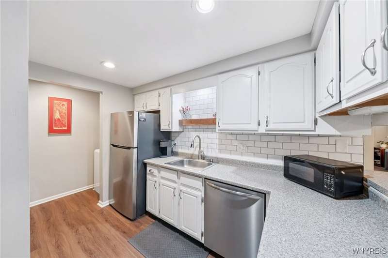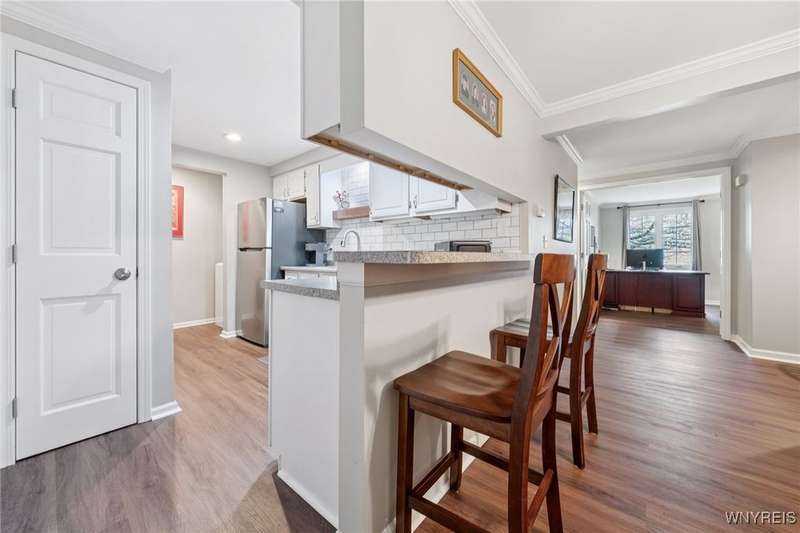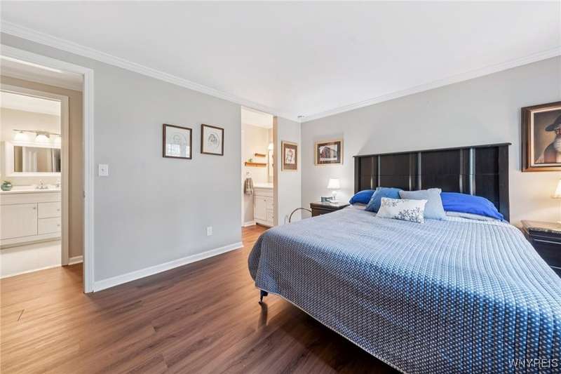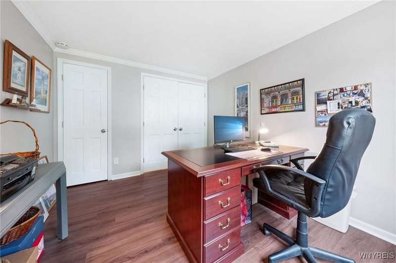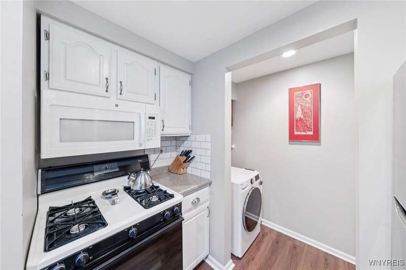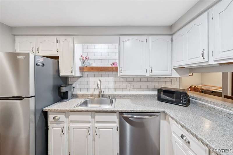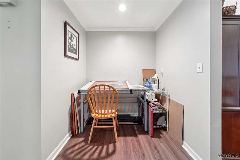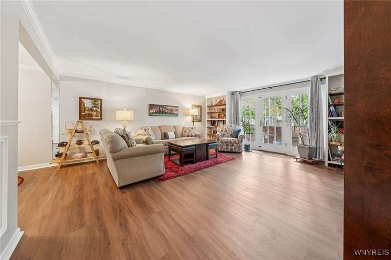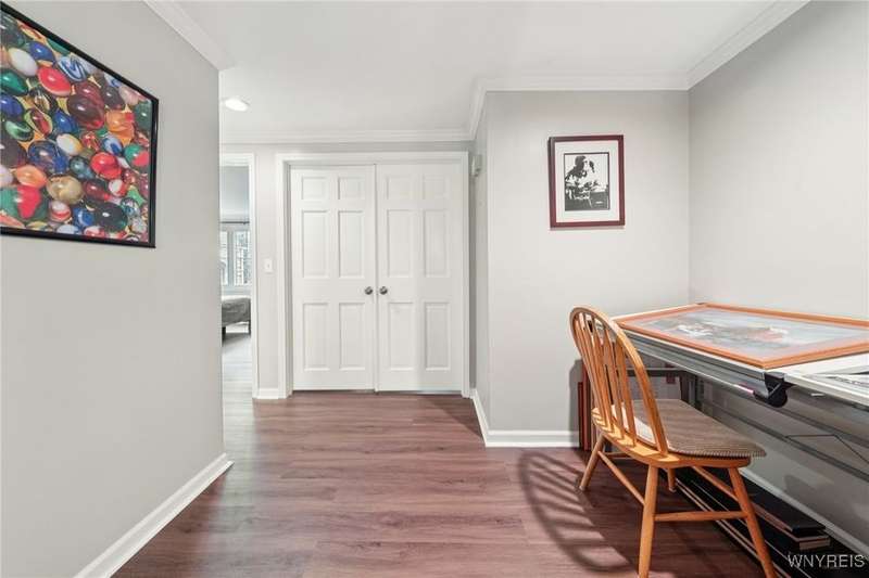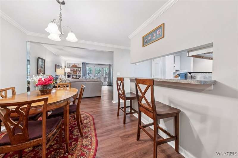 Discover comfort and convenience in this beautifully UPDATED and maintained FIRST FLOOR, MOVE-IN READY condo located in Amherst, featuring new windows ('23), neutral paint colors and luxury vinyl flooring throughout. The large living room is the heart of the home, with crown molding, neutral paint colors, floor-to-ceiling built-in cabinets flanking the sliding glass door that leads to a private covered patio.The spacious primary bedroom suite has large new windows ('23), walk in closet and an updated ensuite bathroom featuring a stand up shower w/ tall sliding doors and white cabinetry. An open dining area connects seamlessly to the living room and kitchen featuring white cabinetry, ample counter top space, tile backsplash, pantry, garbage disposal and a breakfast bar. All appliances included, with both the fridge and dishwasher just purchased and installed in 2023. A cozy office reading nook provides the perfect spot for remote work or reading, while the second bedroom (used as an office) features solid French doors and is generously sized. A second full updated bathroom and a convenient in-unit laundry space with new washer and dryer ('23) complete the home. The large private basement offers excellent storage and easy access to mechanics. This stylish and well-cared-for condo combines one-floor living with thoughtful updates and a welcoming layout?ready for you to move right in and enjoy! The location adds to its appeal, as its close to the 290, 990, University of Buffalo and many shops and restaurants.Offers will be reviewed as they come in