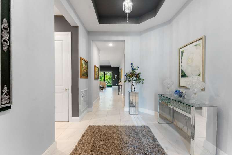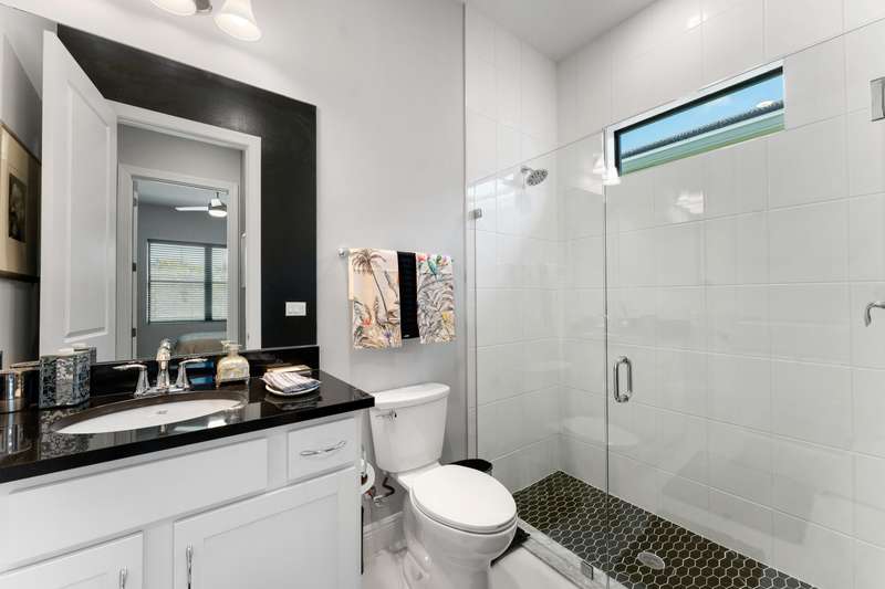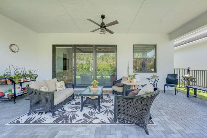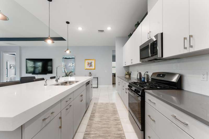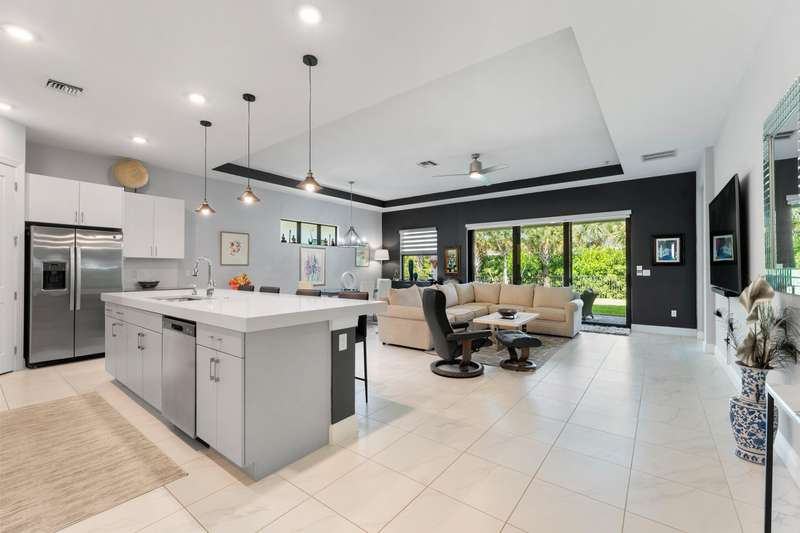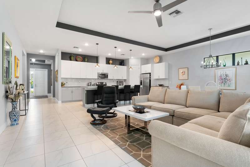 Welcome to this highly sought-after Fiesta Model featuring 3 spacious bedrooms, 3 full baths, a versatile den, and a bright open floor plan perfect for modern living. The large kitchen is a showstopper with two-tone soft-close cabinetry, a large 3.5'' quartz island, stainless steel appliances, and quartz countertops throughout.Enjoy the beauty of tile flooring across the entire home, 10-foot tray ceilings, and floor-to-ceiling tile in bathrooms. The luxurious primary suite offers a beach-access walk-in shower and custom finishes for a spa-like experience.Built for comfort and efficiency, this home has a tankless water heater, impact windows and sliders and a hurricane-rated 2-car garage door with sleek epoxy floors.